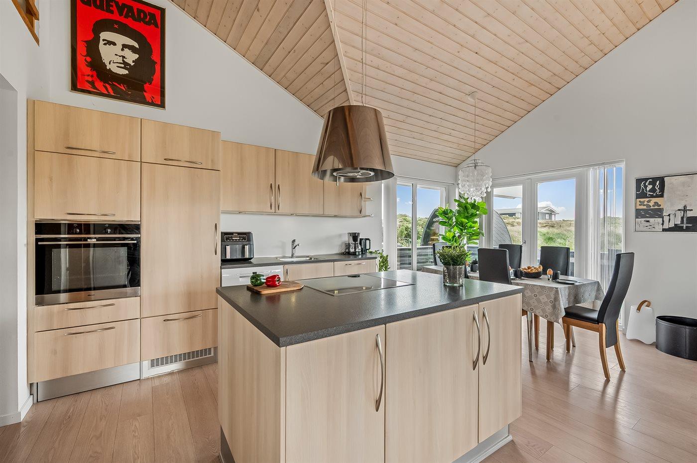 Køkkenet er udstyret med 1 køleskab. Der er 4 keramiske kogeplader, varmluftovn, mikrobølgeovn samt opvaskemaskine.