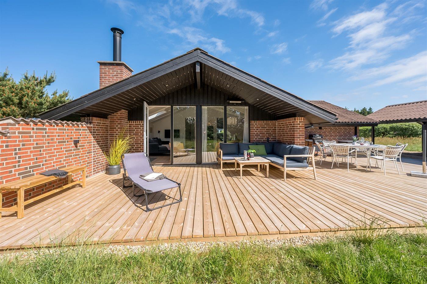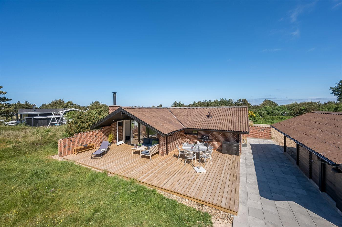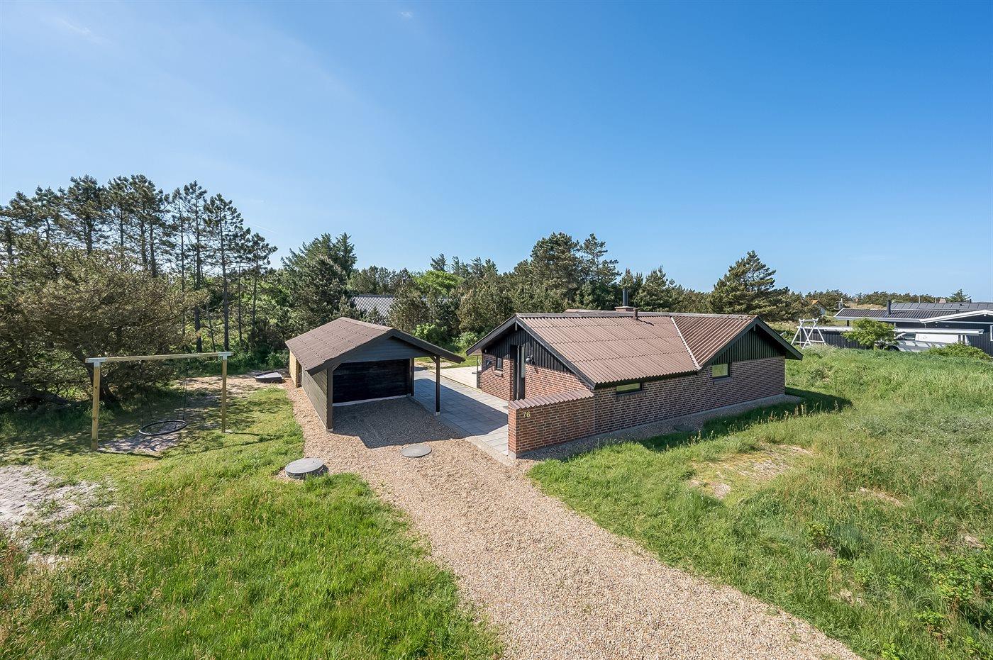 Ferieboligen er beliggende på en 1201 m² stor naturgrund. Der er 900 m til havet. Nærmeste forretning er beliggende i en afstand af 600 m. Til ferieboligen hører åbent terrasseareal. Desuden er der overdækket terrasse. Der er redskabsrum. Gynge. Udendørs bruser. Der er carport til rådighed. Der er installeret stik til opladning af elbil. CEE stik. Parkering ved ferieboligen.
