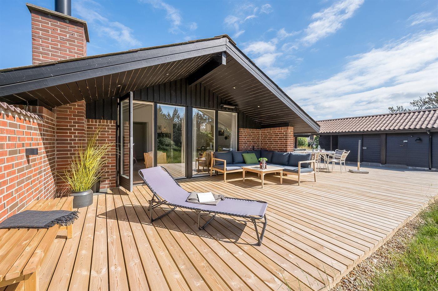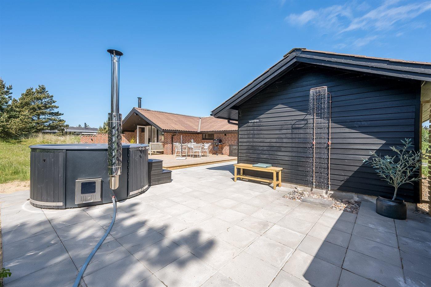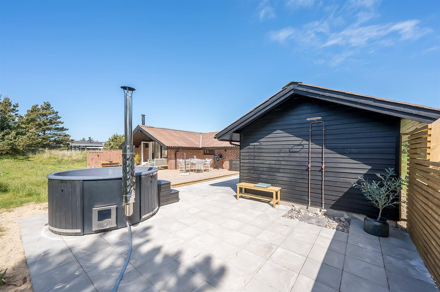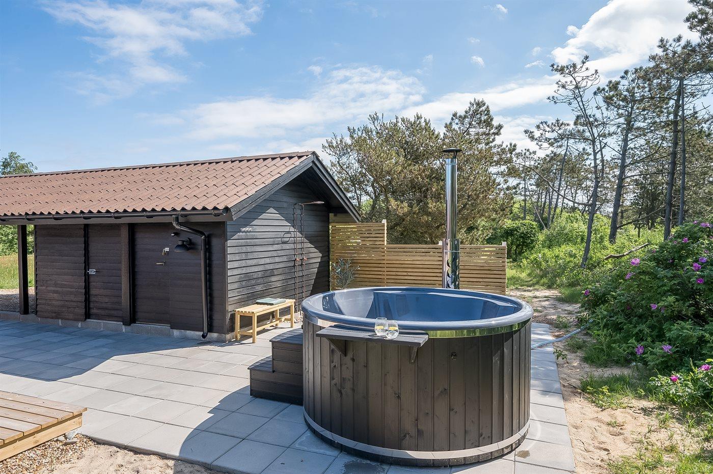 Udenfor er der en dejlig stor træterrasse, og vil I virkelig nyde livet og forkæle jer selv, kan I tænde op i vildmarksbadet, hvilket er særligt hyggeligt om aftenen, hvor man kan sidde i det varme vand og kigge på stjernerne.
