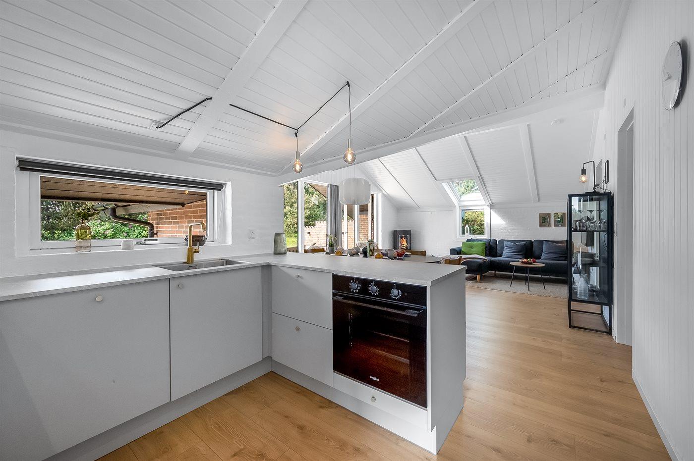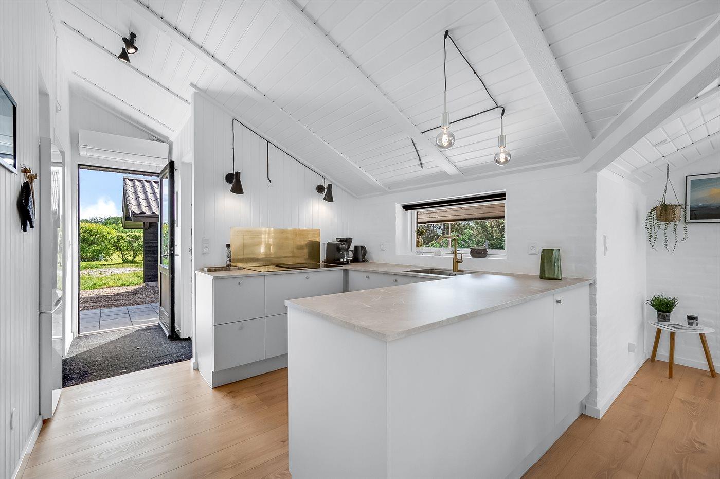 Køkkenet er udstyret med 1 køleskab. Der er 4 induktionskogeplader, varmluftovn, mikrobølgeovn samt opvaskemaskine.