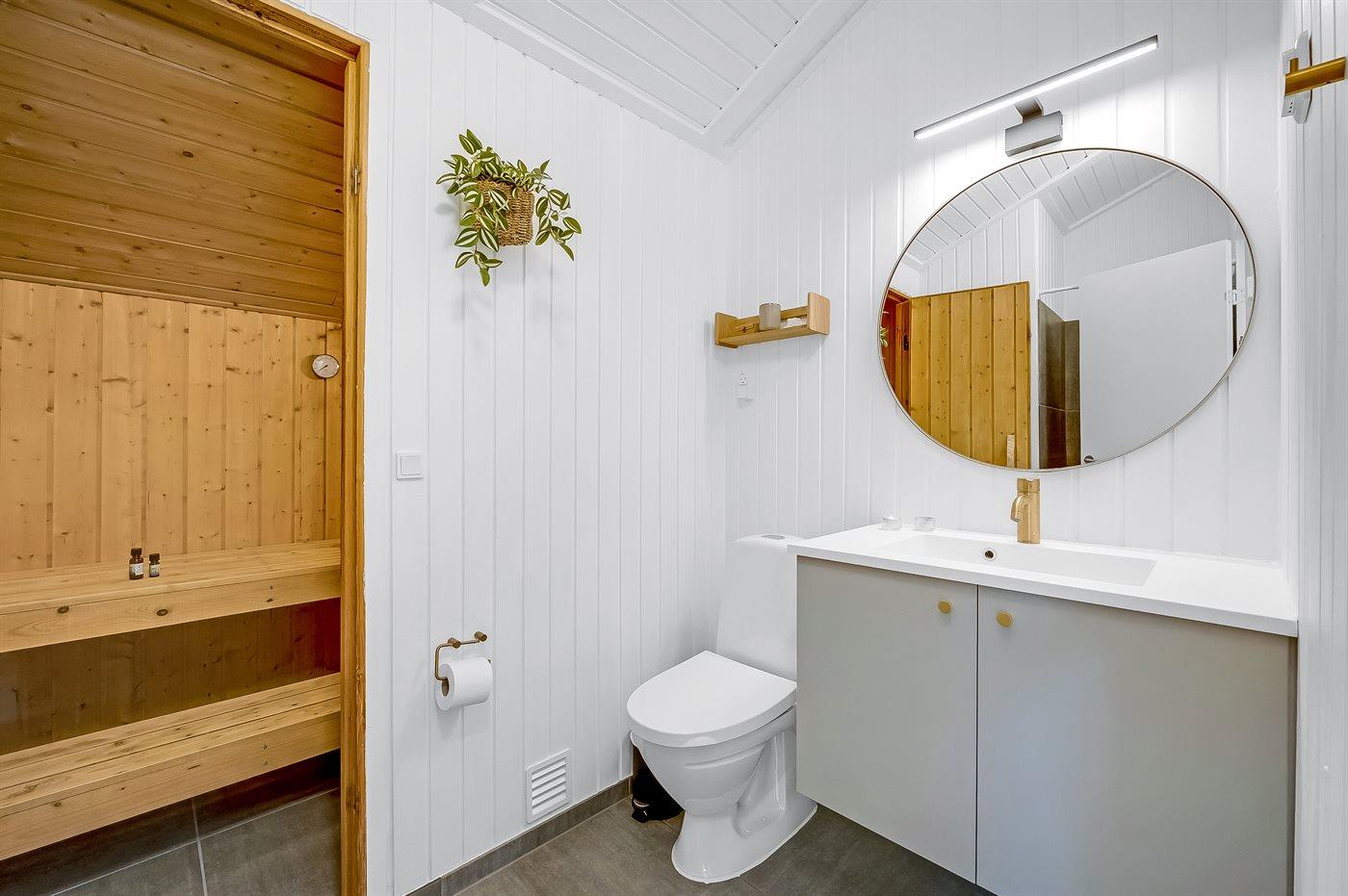 Der er 1 badeværelse med bruseniche og 1 toilet.. Der er gulvvarme på 1 badeværelse. I saunaen er der mulighed for afslapning.