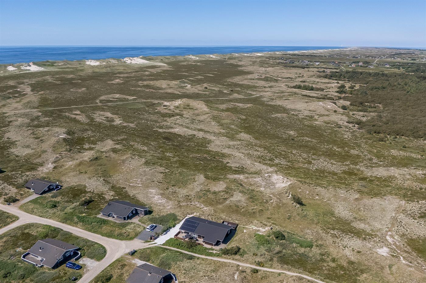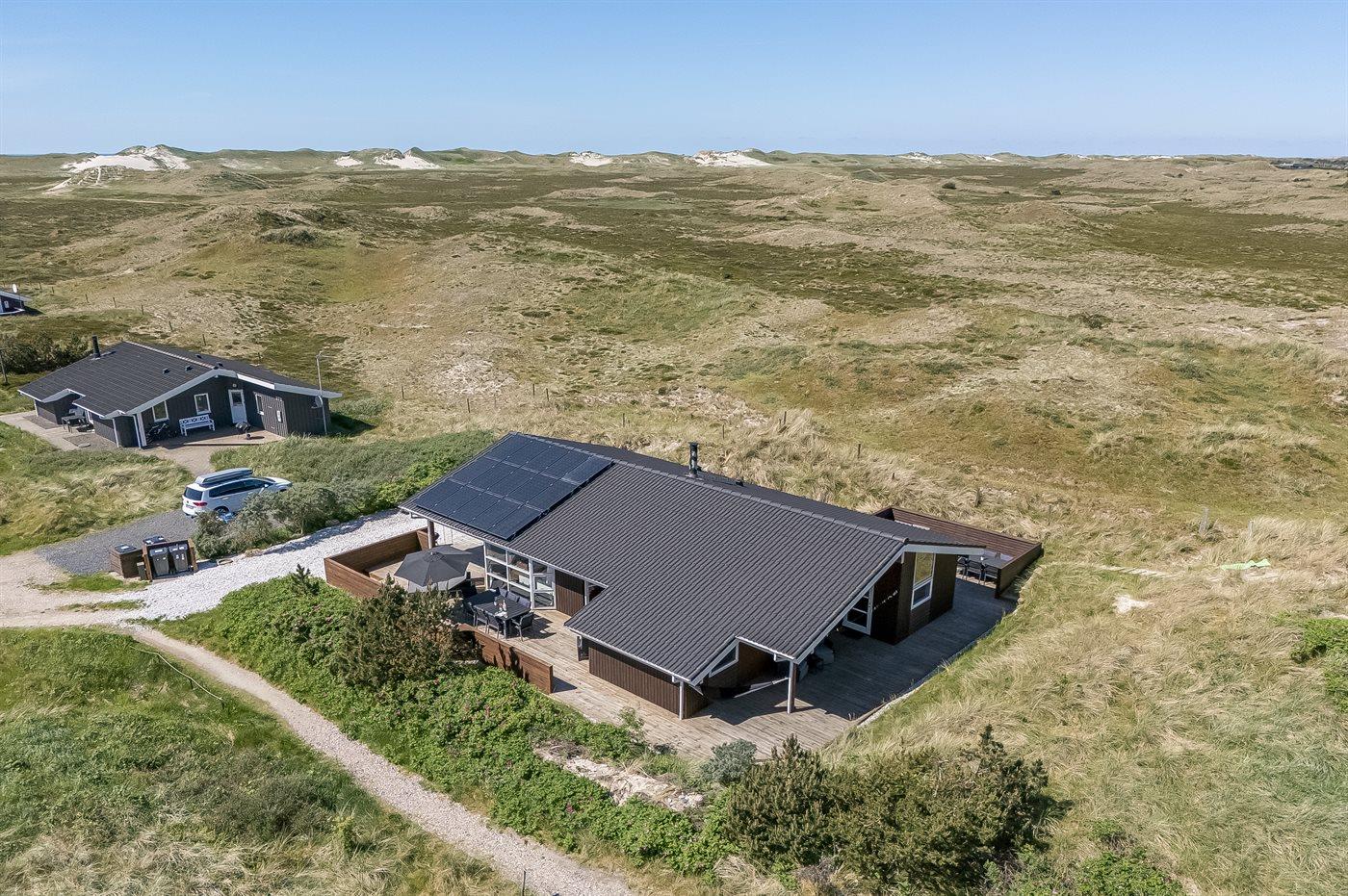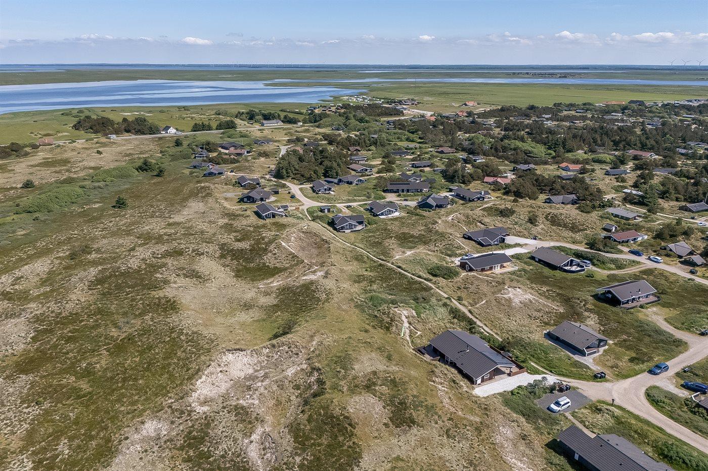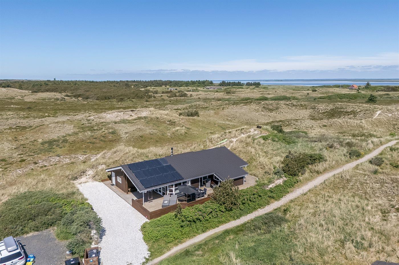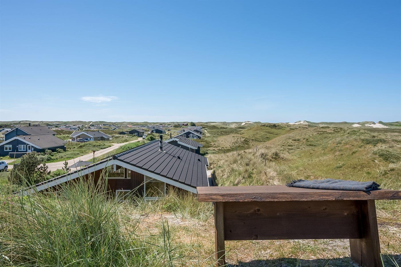Hyggeligt sommerhus nær Vesterhavet med smuk udsigt over klitlandskab og Ringkøbing Fjord.