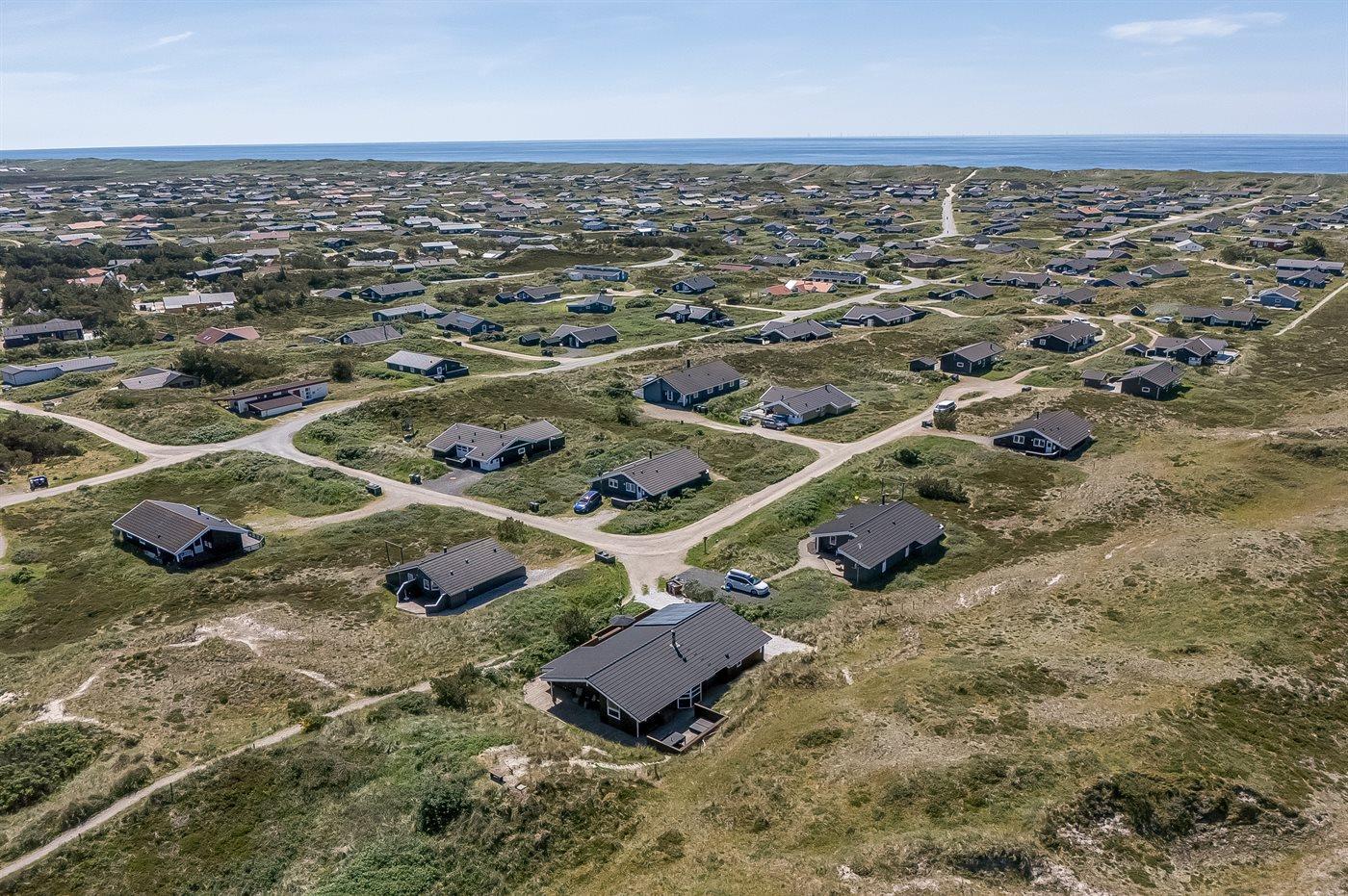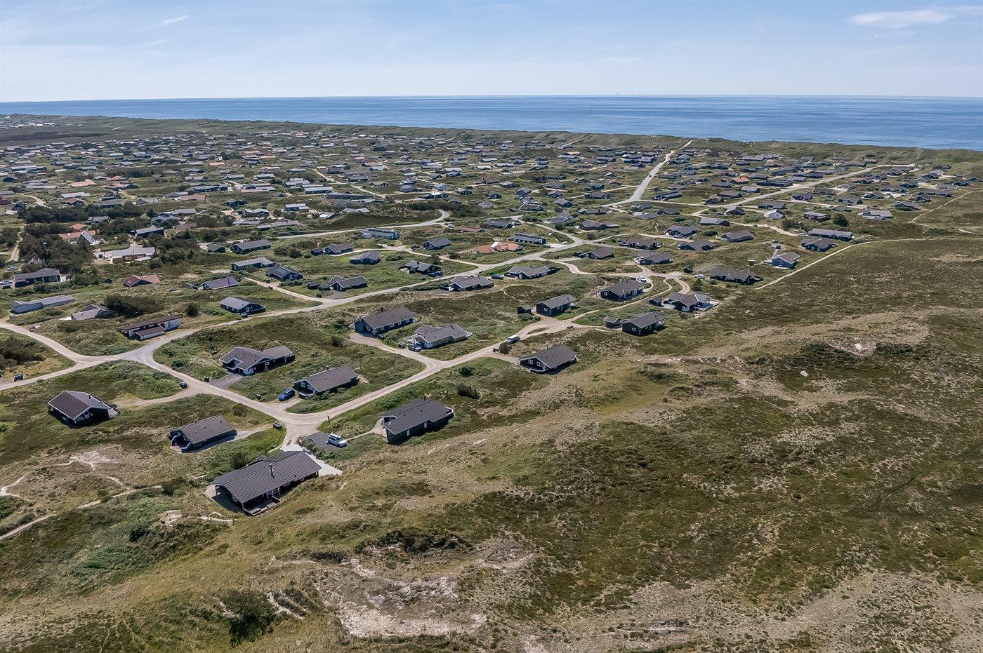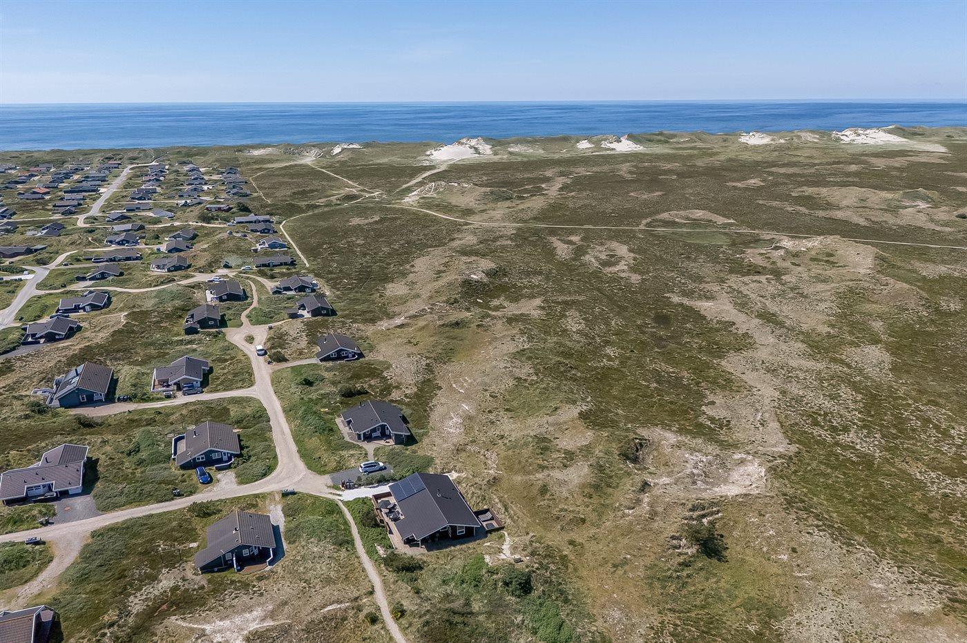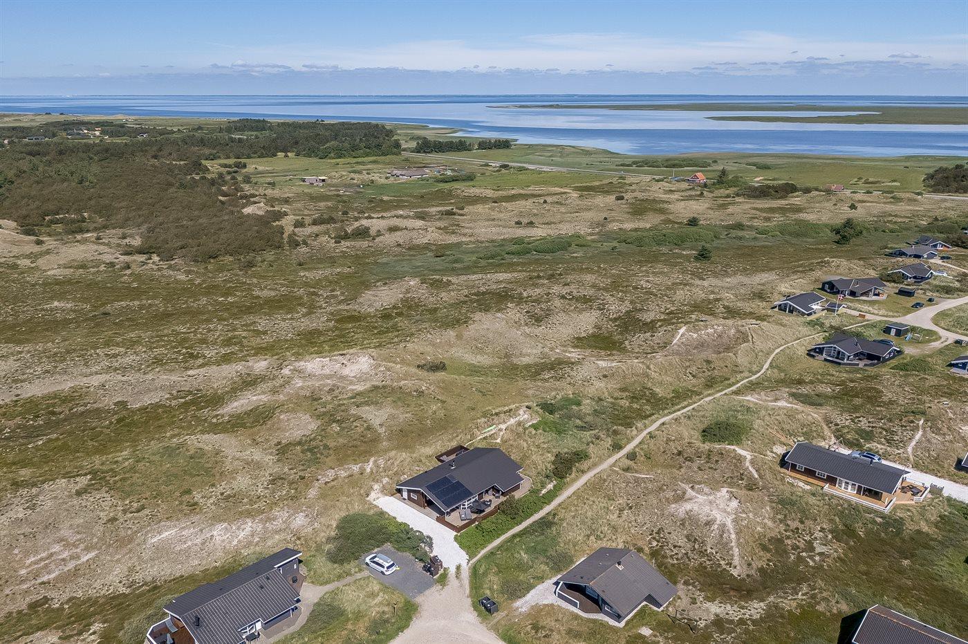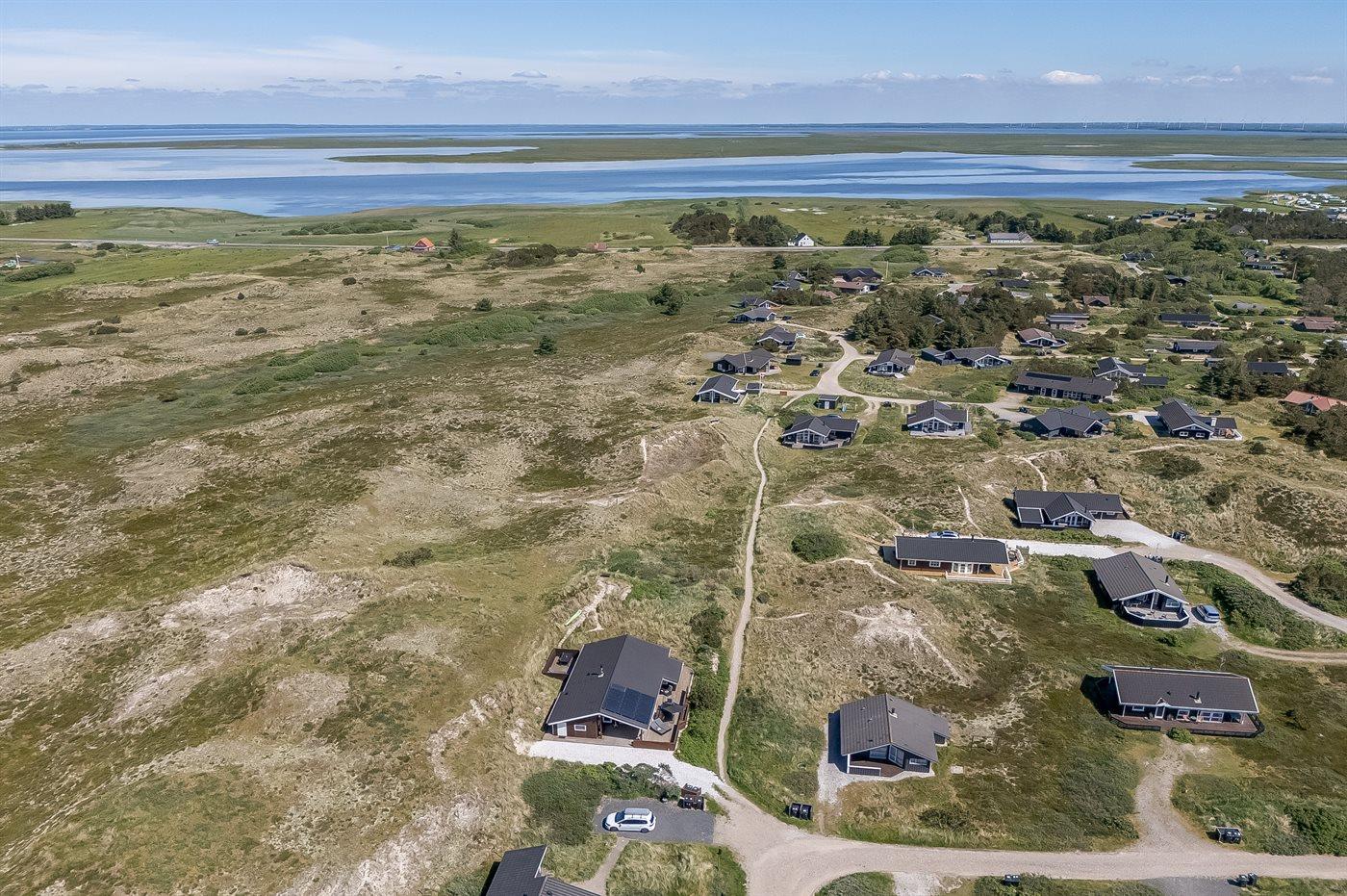 Hyggeligt sommerhus nær Vesterhavet med smuk udsigt over klitlandskab og Ringkøbing Fjord.