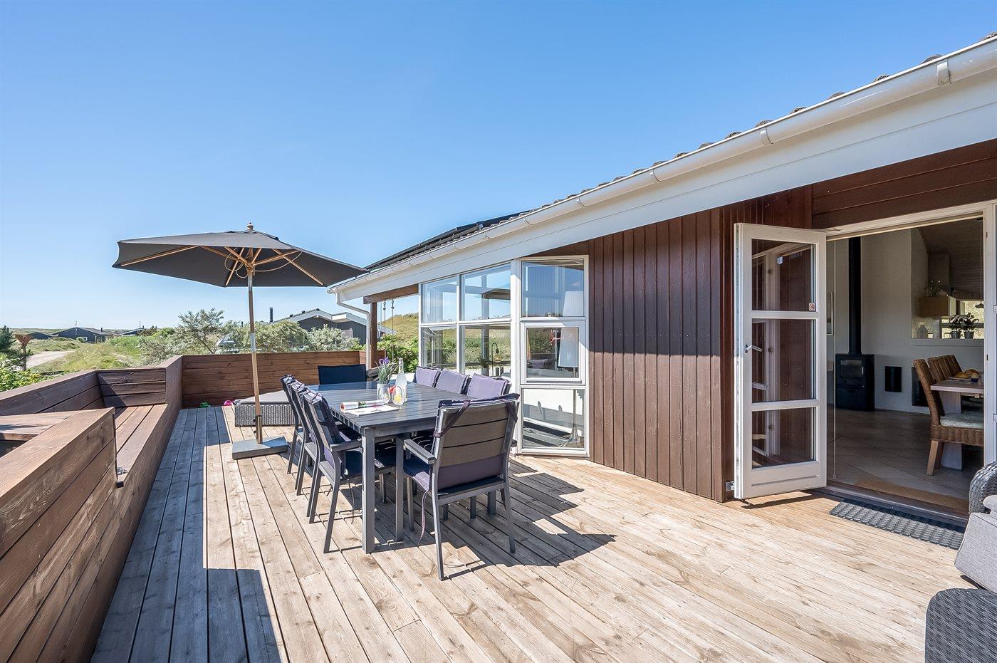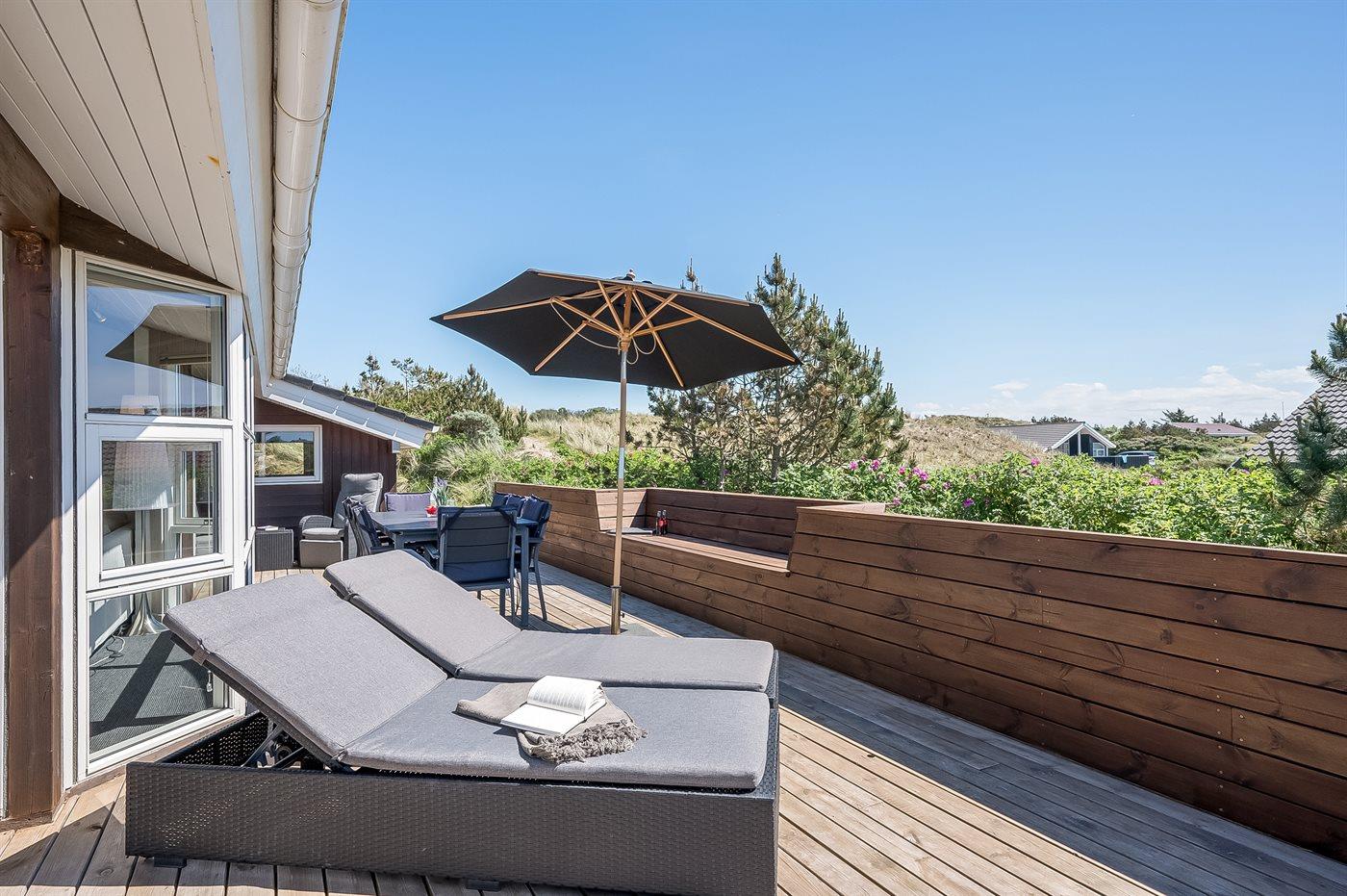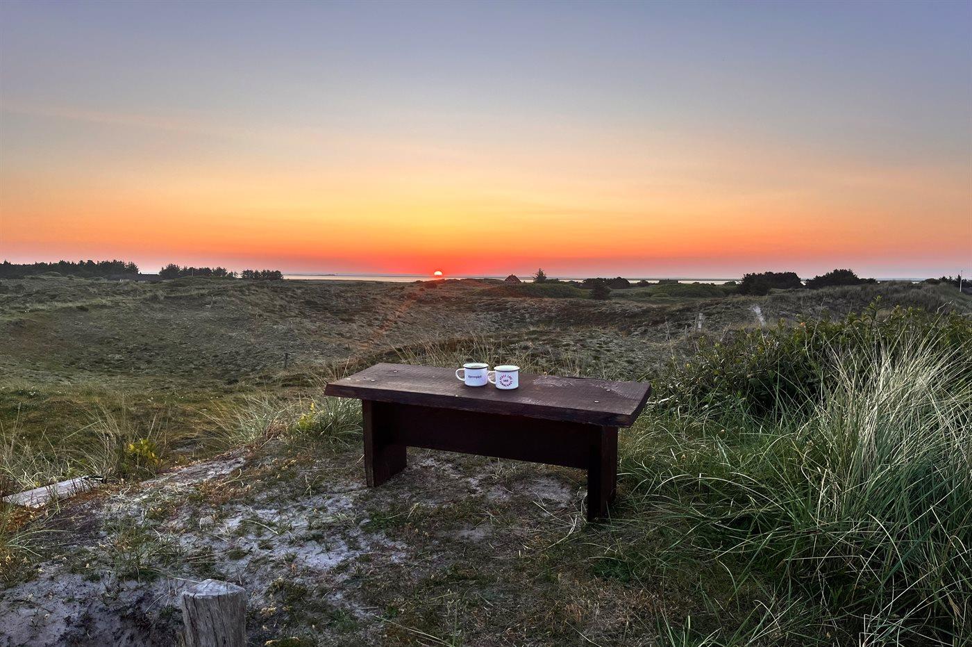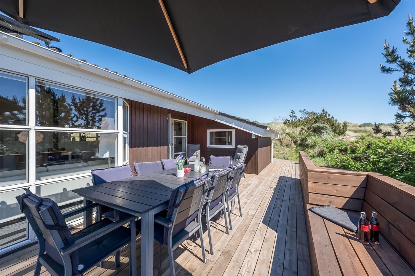Når I sætter jer på bænken på grundens høje klit, har I den smukkeste udsigt med solopgang over Ringkøbing Fjord og den smukkeste solnedgang over det billedskønne fredede klitlandskab og de store klitter ud mod Vesterhavet i baggrunden. Dette er en helt unik oplevelse med en kop kaffe eller et glas vin i hånden. Hele vejen rundt om sommerhuset snor sig en lækker træterrasse designet med smukke detaljer og hygge- og lækroge.