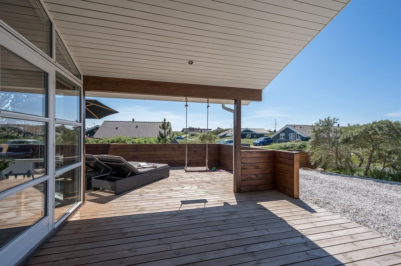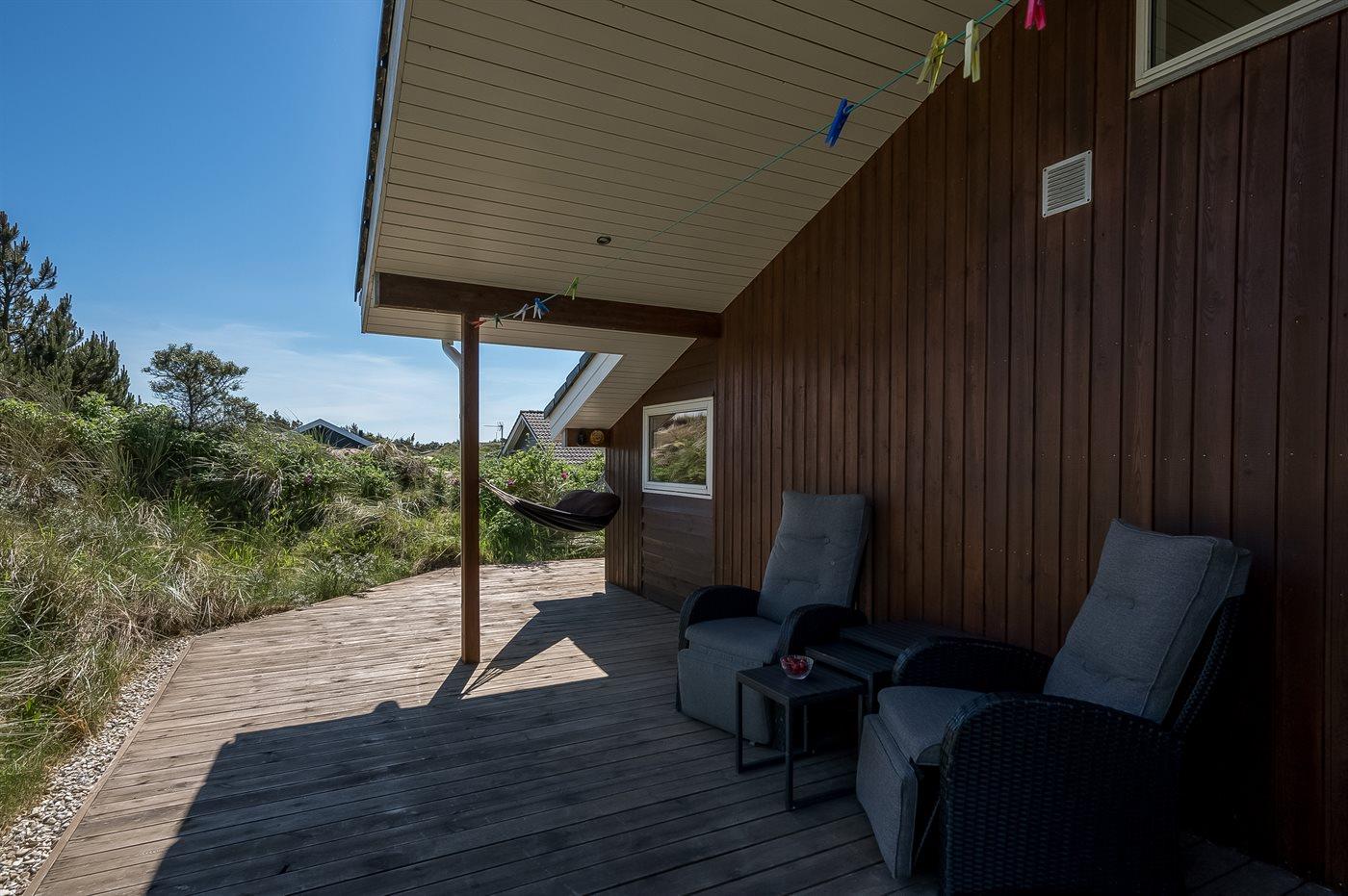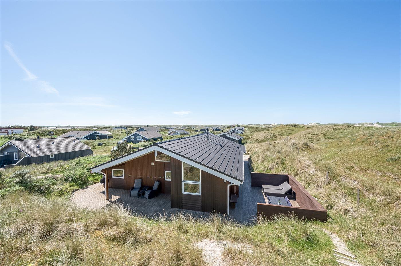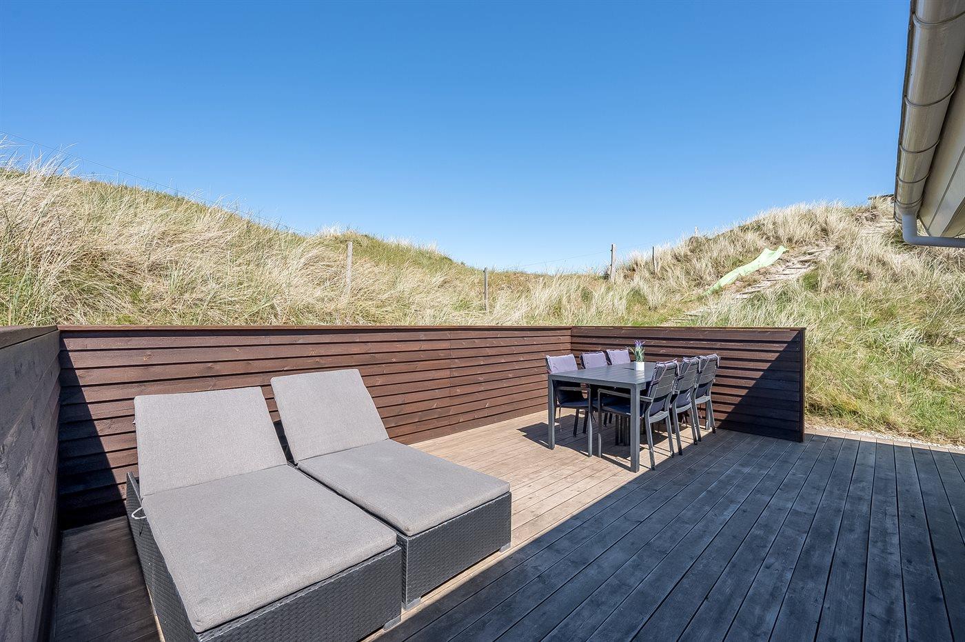 Når I sætter jer på bænken på grundens høje klit, har I den smukkeste udsigt med solopgang over Ringkøbing Fjord og den smukkeste solnedgang over det billedskønne fredede klitlandskab og de store klitter ud mod Vesterhavet i baggrunden. Dette er en helt unik oplevelse med en kop kaffe eller et glas vin i hånden. Hele vejen rundt om sommerhuset snor sig en lækker træterrasse designet med smukke detaljer og hygge- og lækroge.