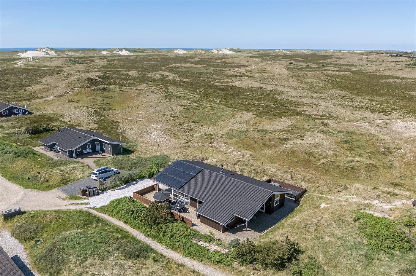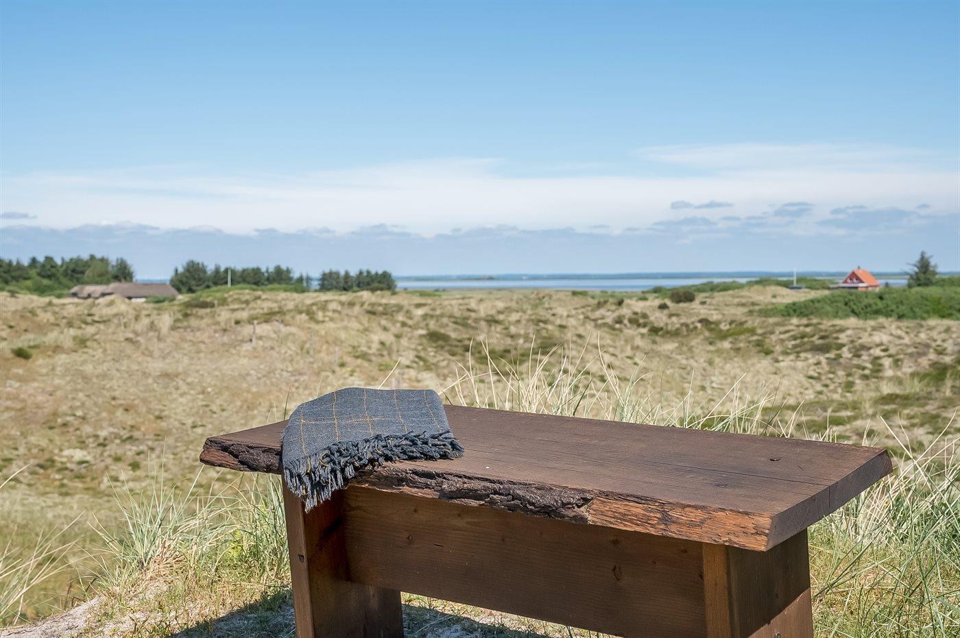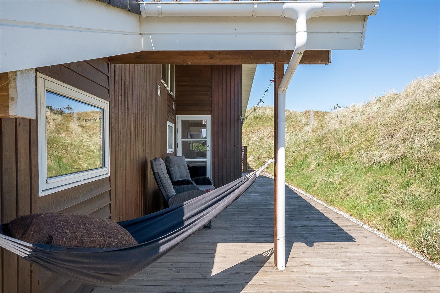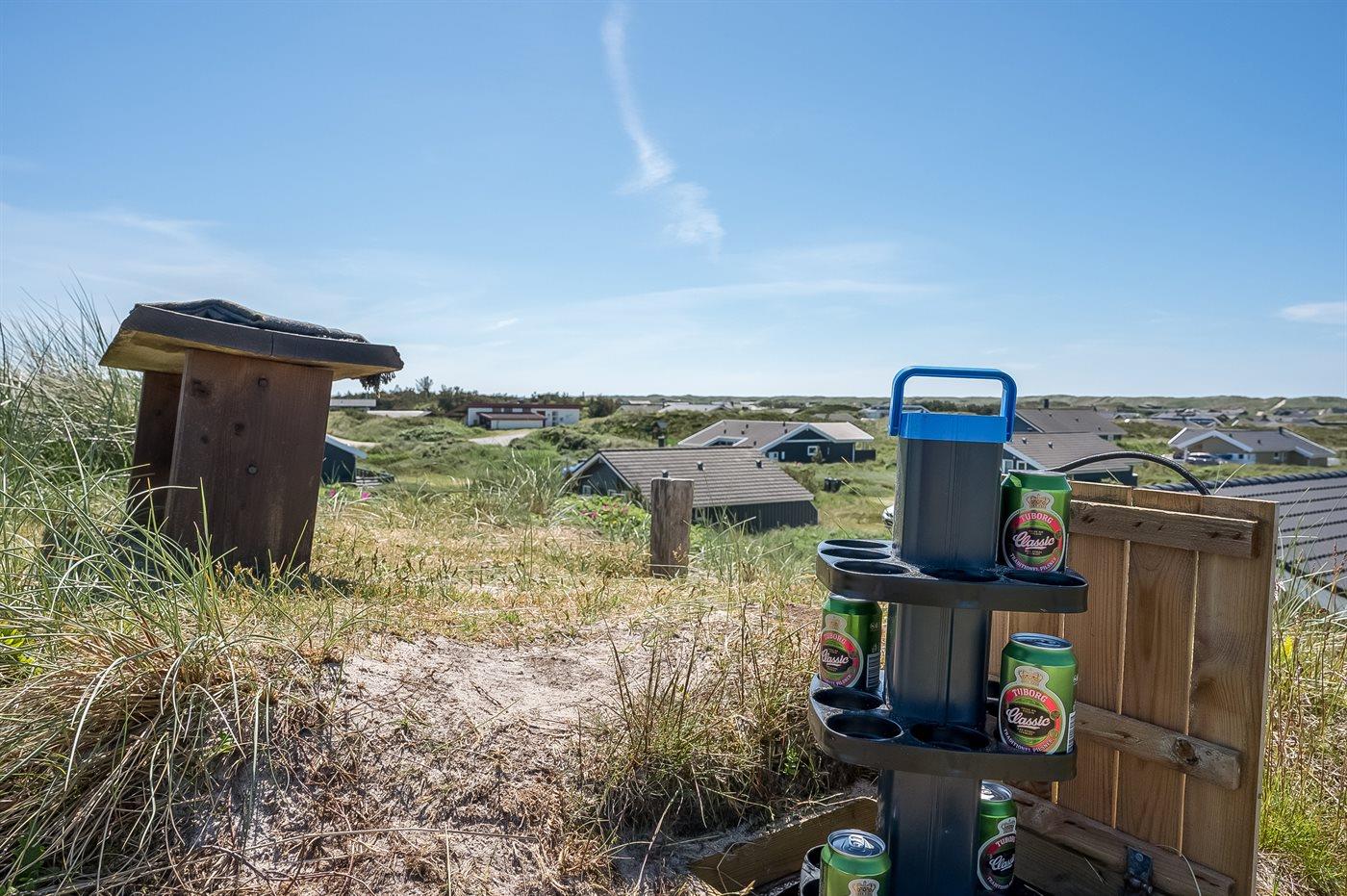 Når I sætter jer på bænken på grundens høje klit, har I den smukkeste udsigt med solopgang over Ringkøbing Fjord og den smukkeste solnedgang over det billedskønne fredede klitlandskab og de store klitter ud mod Vesterhavet i baggrunden. Dette er en helt unik oplevelse med en kop kaffe eller et glas vin i hånden. Hele vejen rundt om sommerhuset snor sig en lækker træterrasse designet med smukke detaljer og hygge- og lækroge.