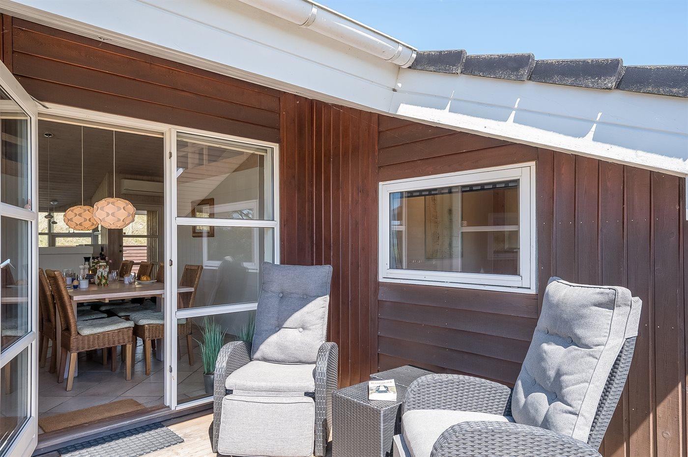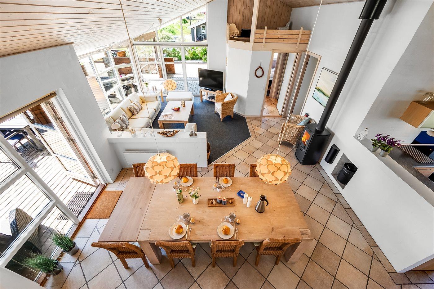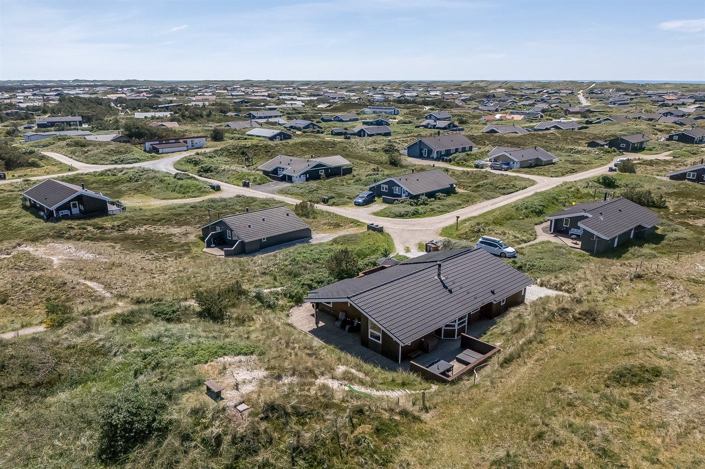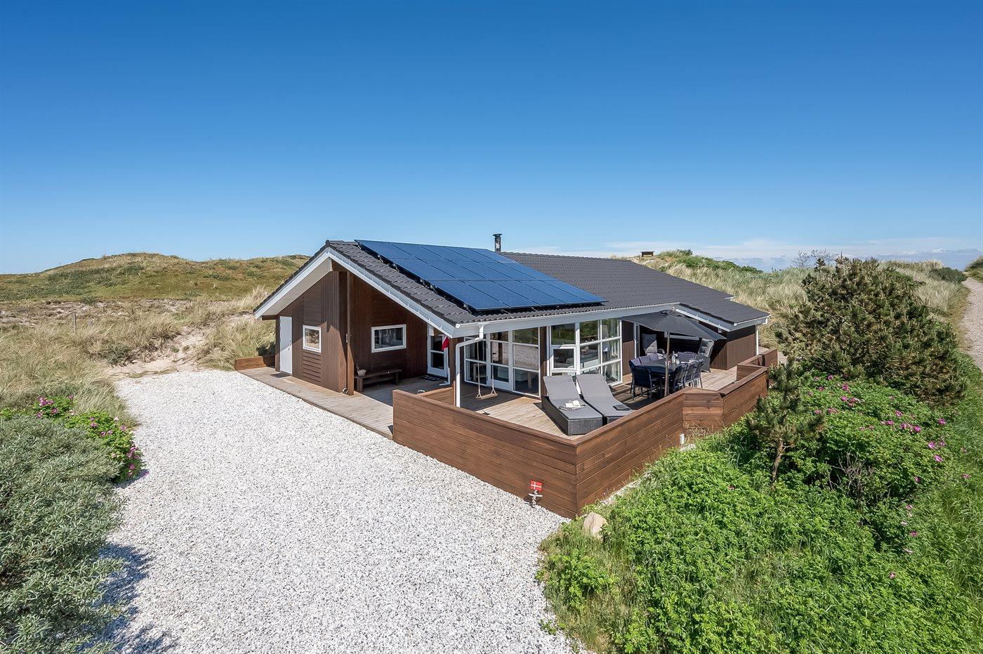 Når I sætter jer på bænken på grundens høje klit, har I den smukkeste udsigt med solopgang over Ringkøbing Fjord og den smukkeste solnedgang over det billedskønne fredede klitlandskab og de store klitter ud mod Vesterhavet i baggrunden. Dette er en helt unik oplevelse med en kop kaffe eller et glas vin i hånden. Hele vejen rundt om sommerhuset snor sig en lækker træterrasse designet med smukke detaljer og hygge- og lækroge.