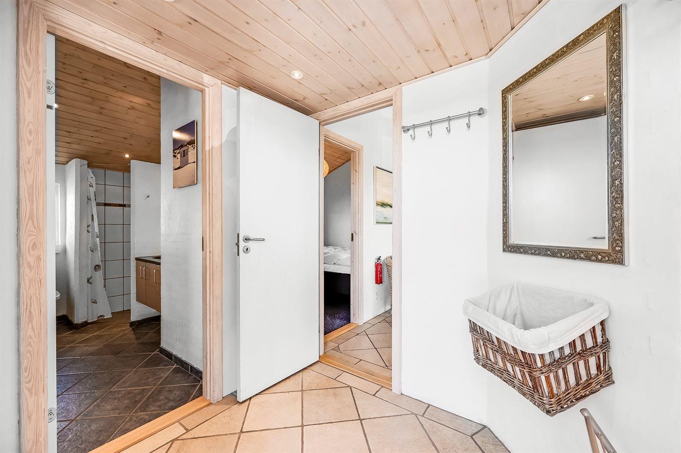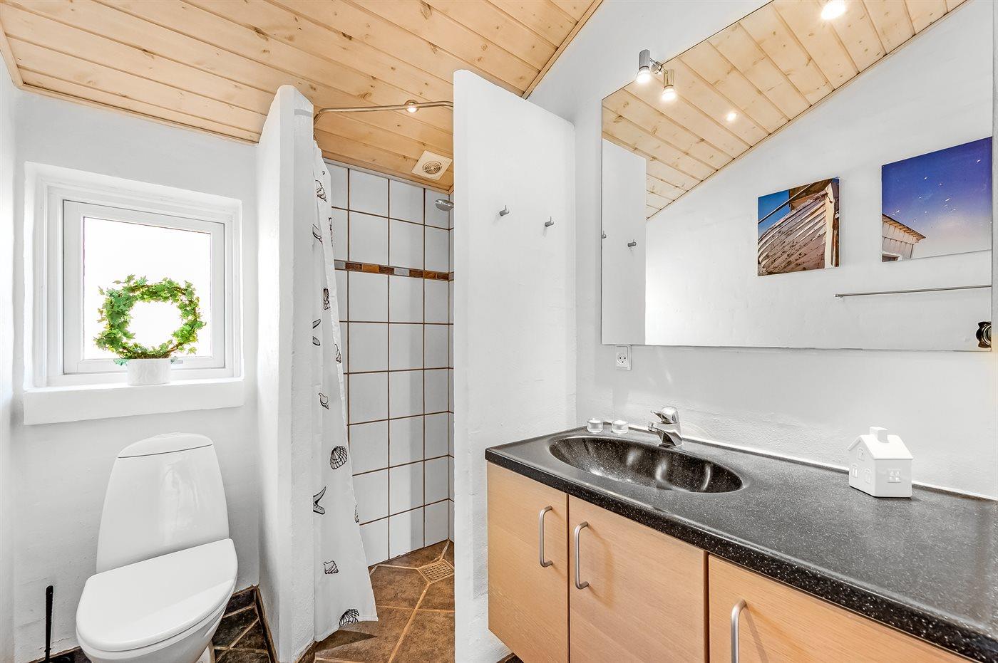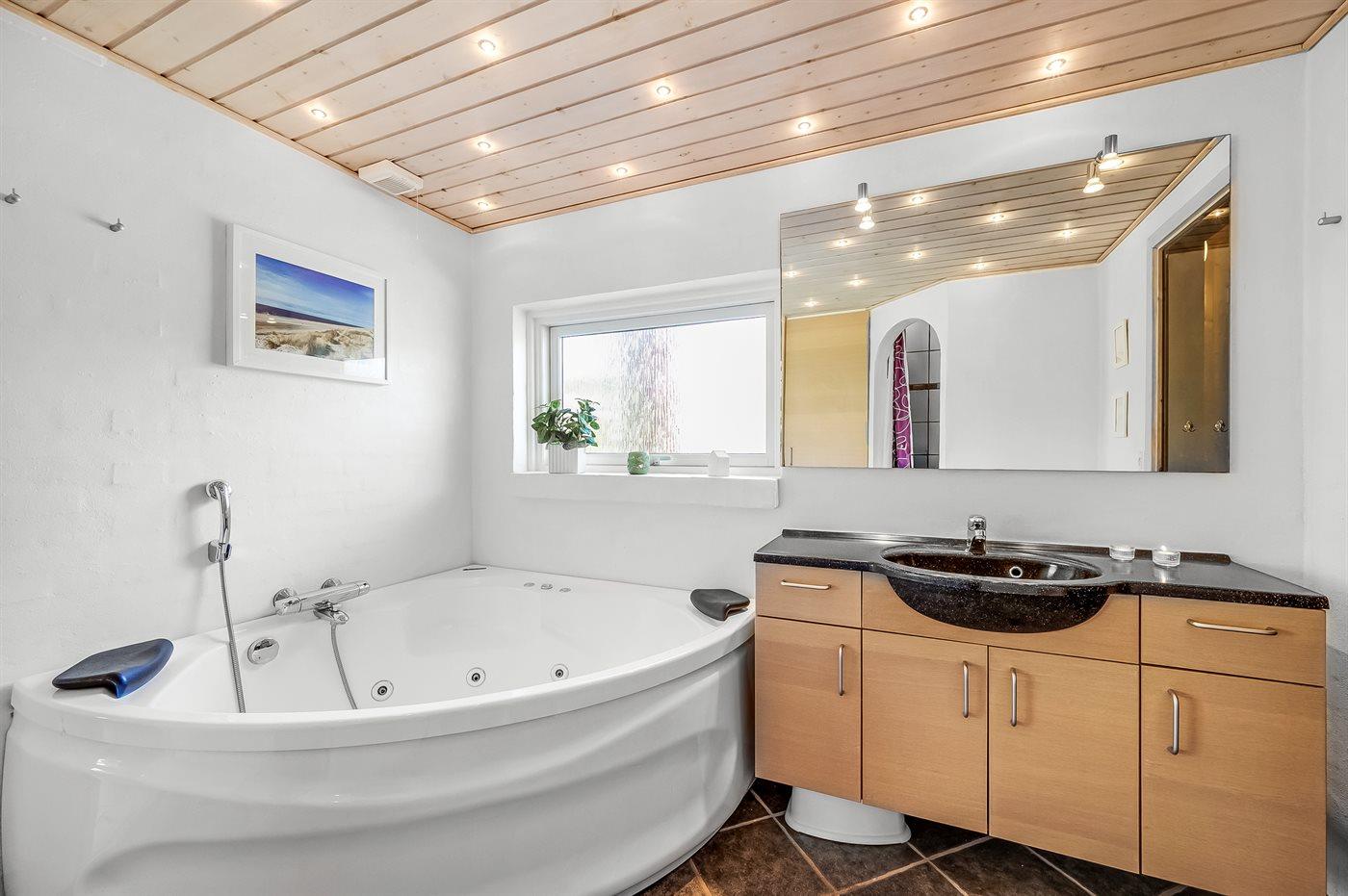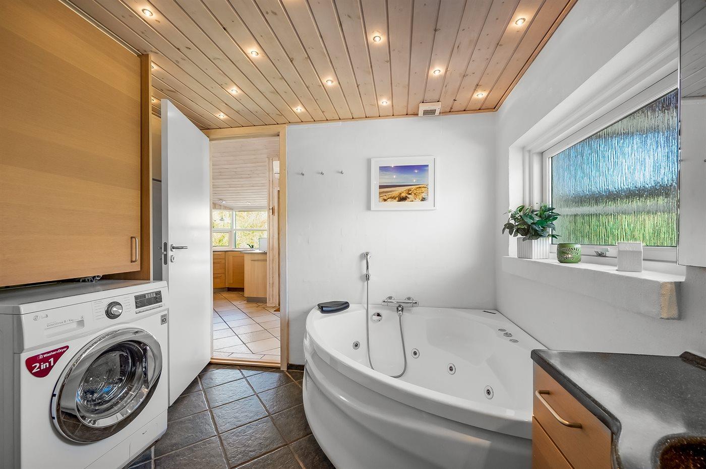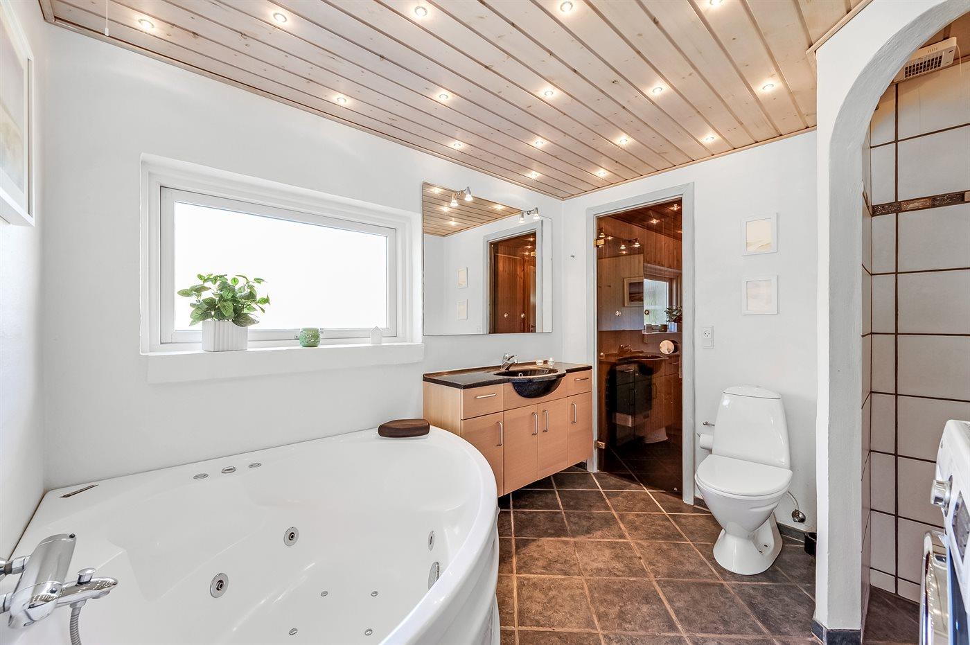 Der er 2 badeværelser med bruseniche og 2 toiletter. Der er gulvvarme på 2 badeværelser. I saunaen er der mulighed for afslapning.