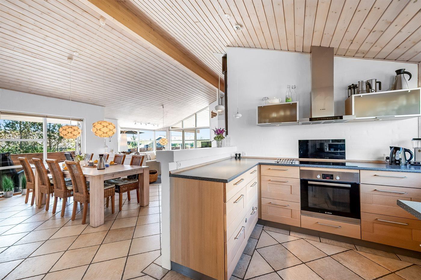 Køkkenet er udstyret med 1 køleskab. Der er 4 induktionskogeplader, varmluftovn, mikrobølgeovn samt opvaskemaskine.
