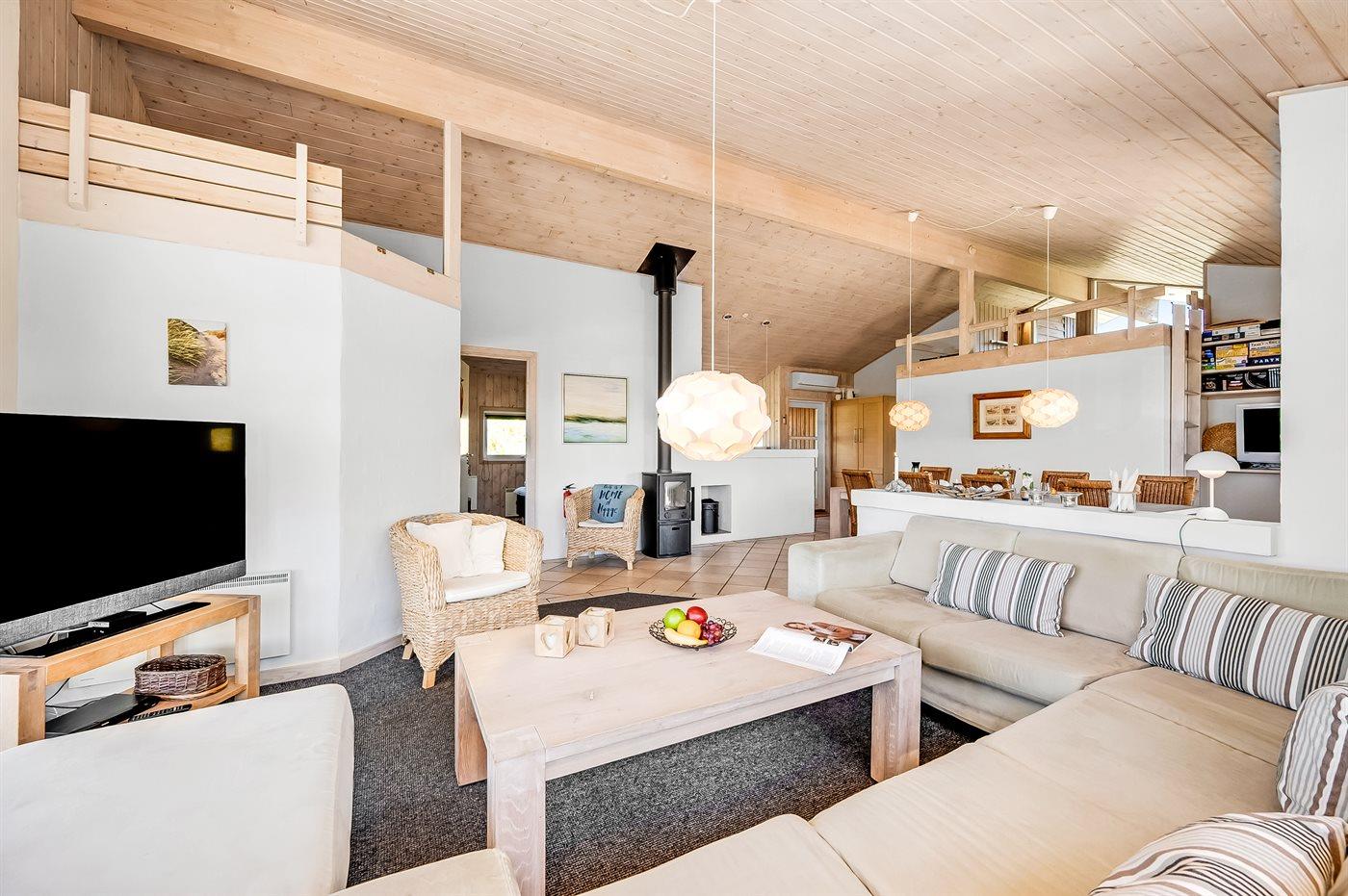 Når du træder indenfor i det store køkken alrum, vil du opleve en dejlig rumfornemmelse med masser af lys, der strømmer ind af de store vinduespartier. Sommerhuset er designet med to separate sove- og badeafdelinger, hvilket gør, at sommerhuset egner sig rigtig godt til en stor familie eller to familier, der gerne vil nyde deres ferie sammen.