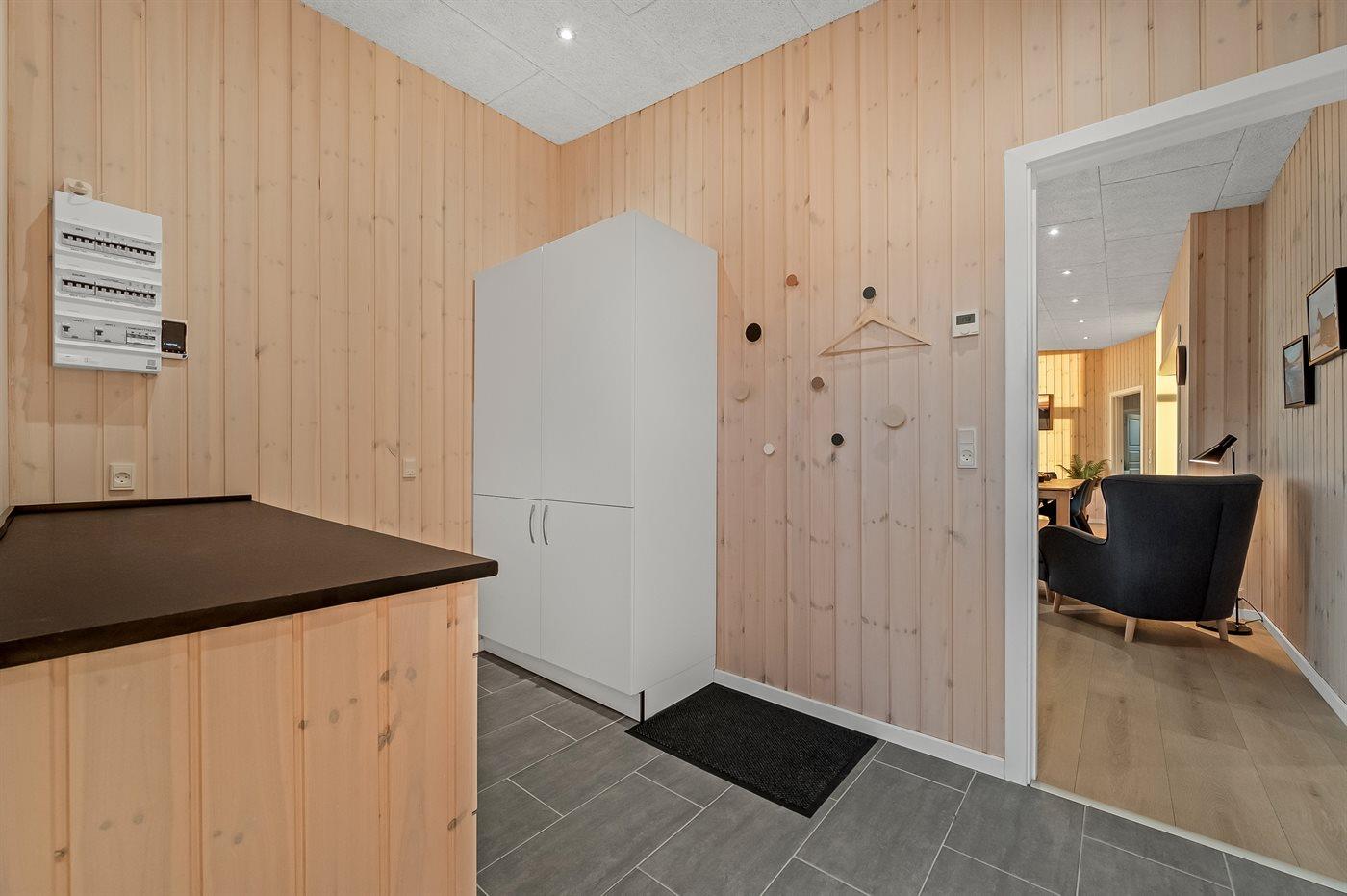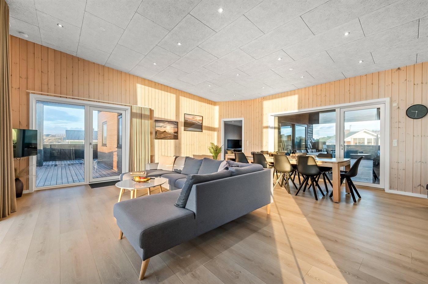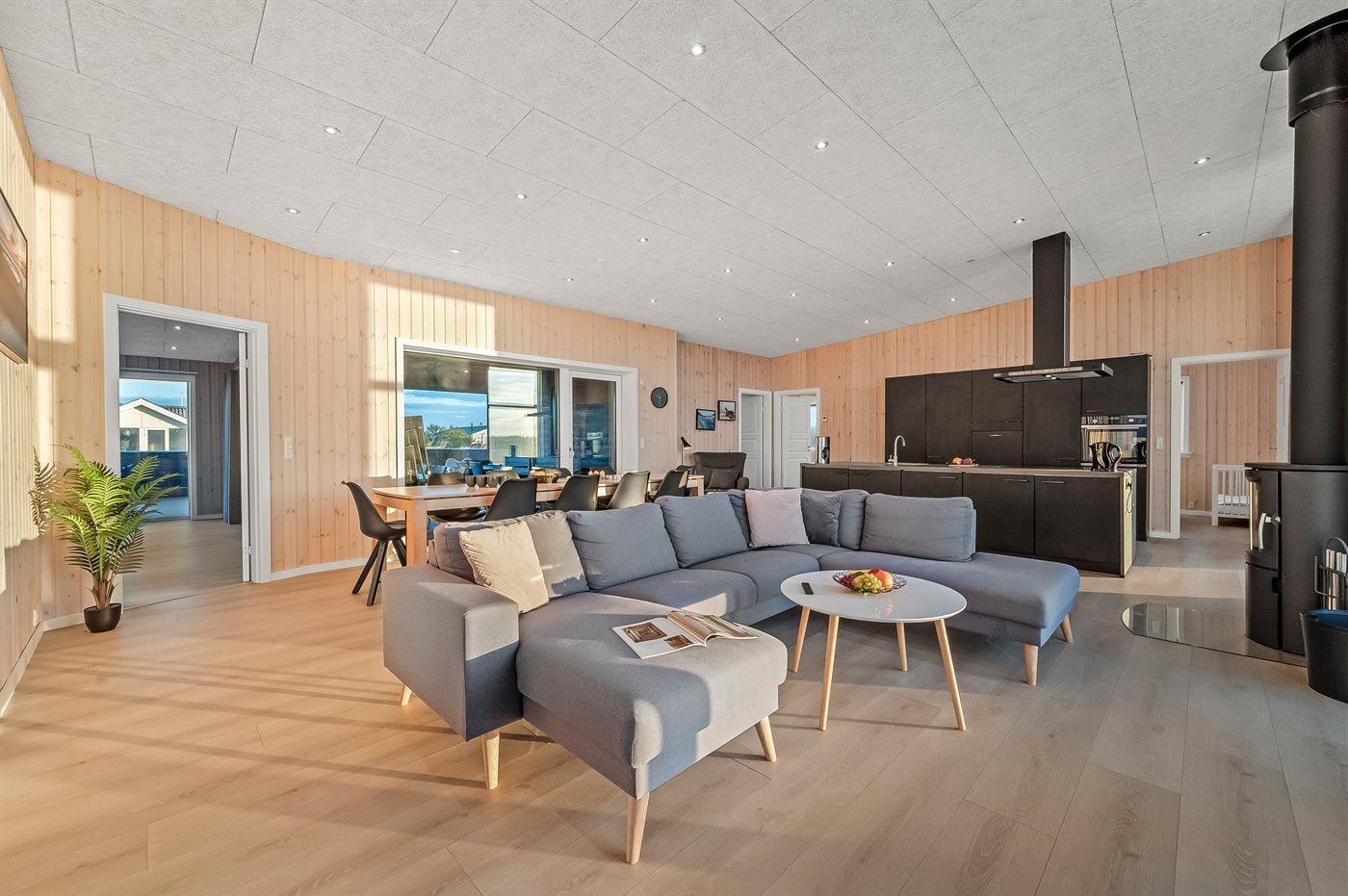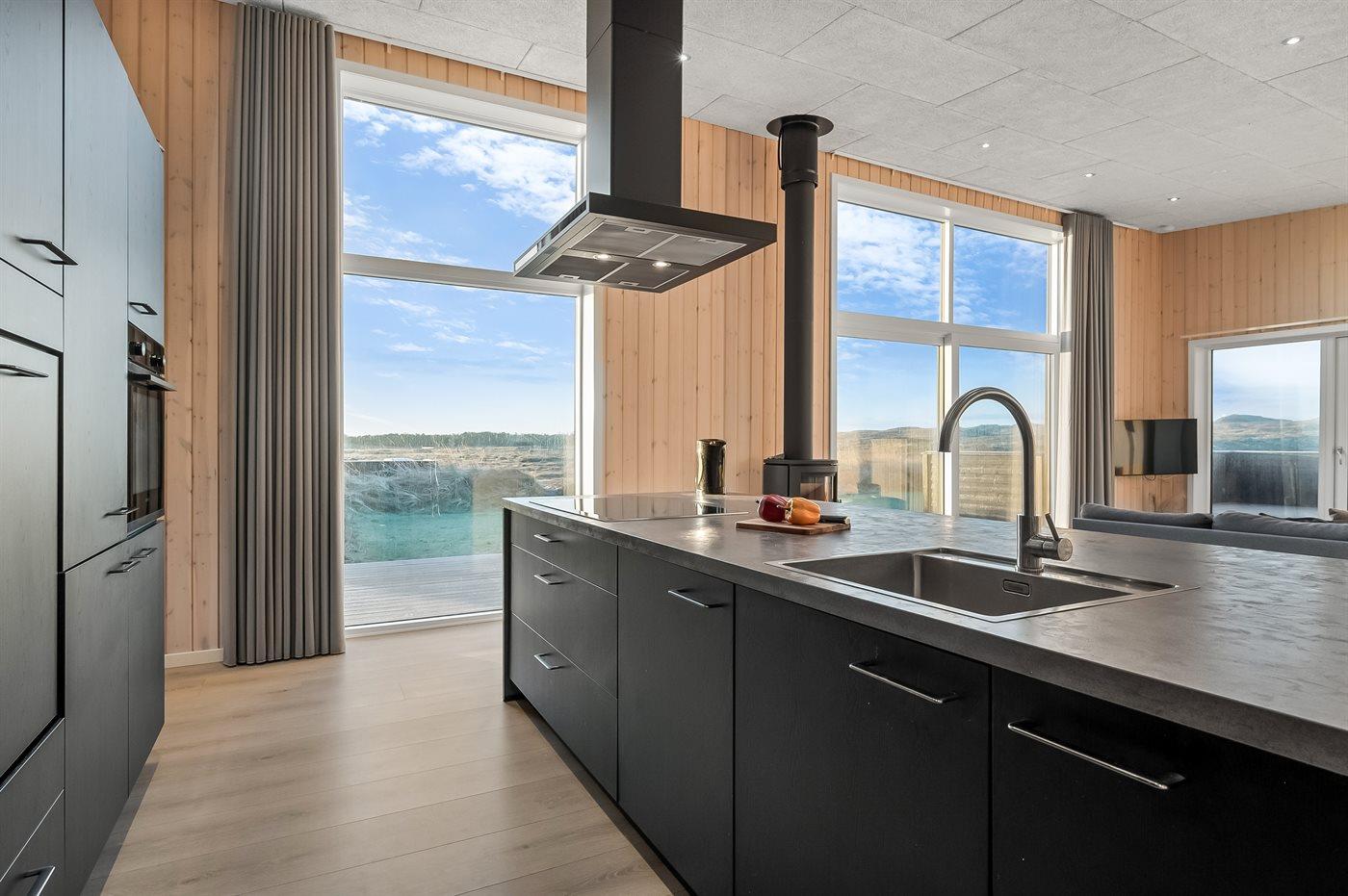 De store vinduespartier giver det smukkeste lysindfald i det hyggelige køkken-alrum og sørger samtidig for, at den smukke udsigt bliver trukket med indenfor. Dette er et sommerhus, hvor naturen kommer helt tæt på. Sommerhuset er til 10 personer, og hvis hunden også skal med til Vesterhavet, så har dette sommerhus et mindre græsareal, hvor hunden kan lege frit, da det hænger sammen med den enorme indhegnede terrasse.