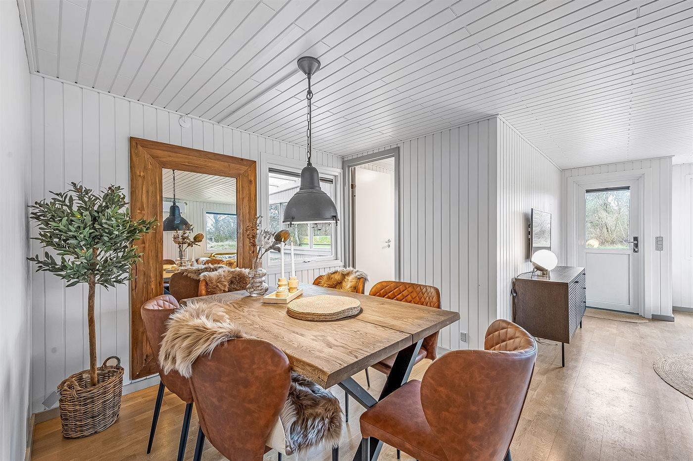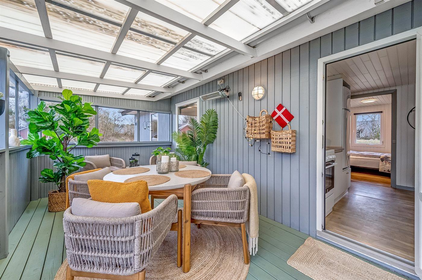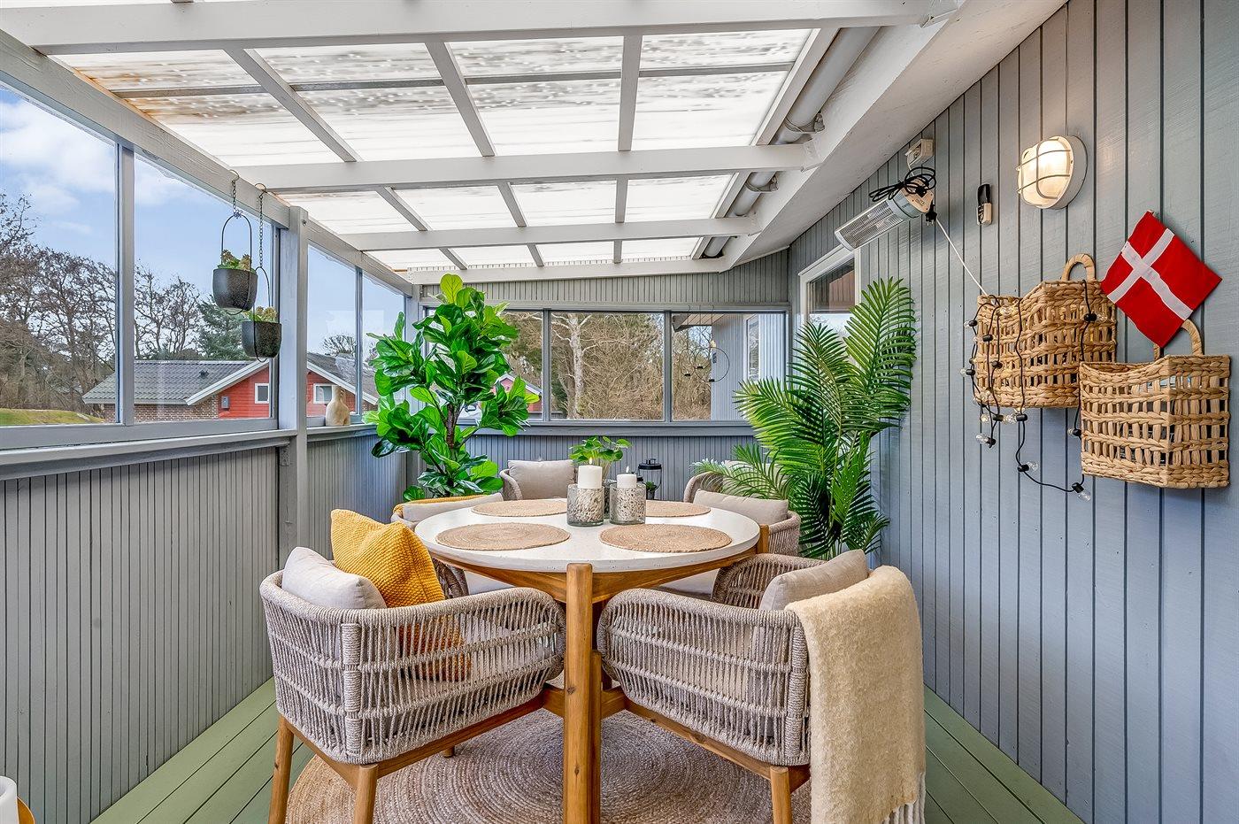 Fra køkkenalrummet, der indbyder til afslapning med en god bog foran brændeovnen, er der adgang til den hyggelige udestue, hvor I vil føle jer midt i naturen. Her kan I trække ud og gøre de lange sommernætter endnu længere. Selv på en regnvejrsdag er det hyggeligt at sidde indenfor i tørvejr og høre regnens trommen på taget, og bliver her køligt, kan I varme jer i de lækre plaider eller tænde for varmelampen.