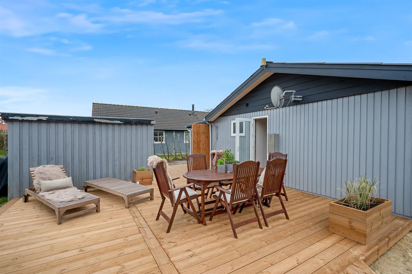 Vil I for alvor skrue op for luksus og selvforkælelse, kan I nyde sommerhusets lækre terrassemiljø og tænde for den udendørs sauna og fyre op i vildmarksbadet. Dækket af det varme vand kan I slappe fuldstændig af, og om aftenen er der frit udsyn til den smukke, klare stjernehimmel. På terrassen finder I også en udendørs bruser, hvor I kan skylle saltvandet af kroppen og sandet af fødderne, når I har taget en dukkert i Vesterhavet. I kan også vælge at tage jeres morgenbad under åben himmel. Udendørsbruseren kan benyttes fra april til november.