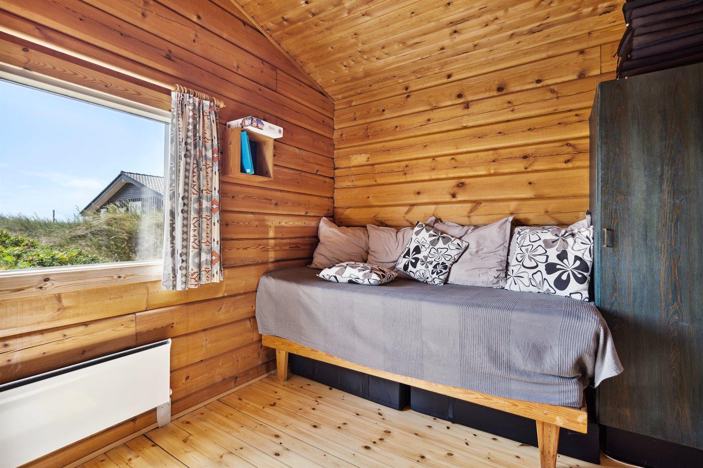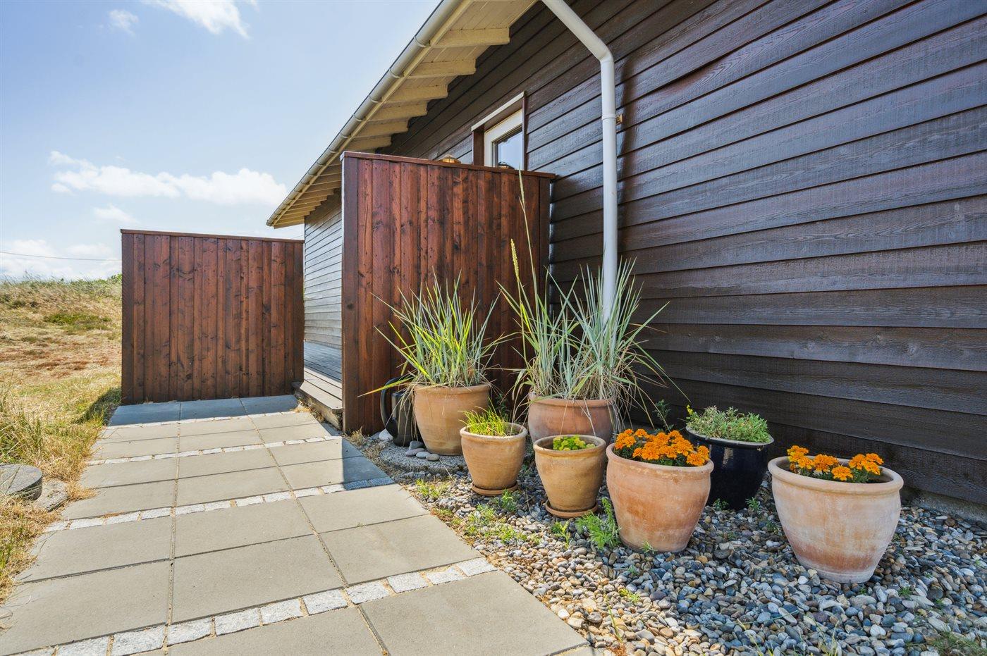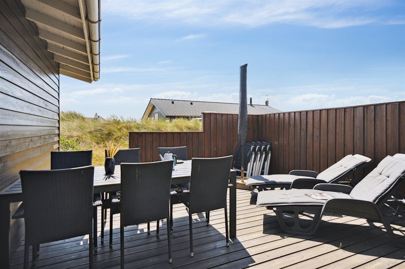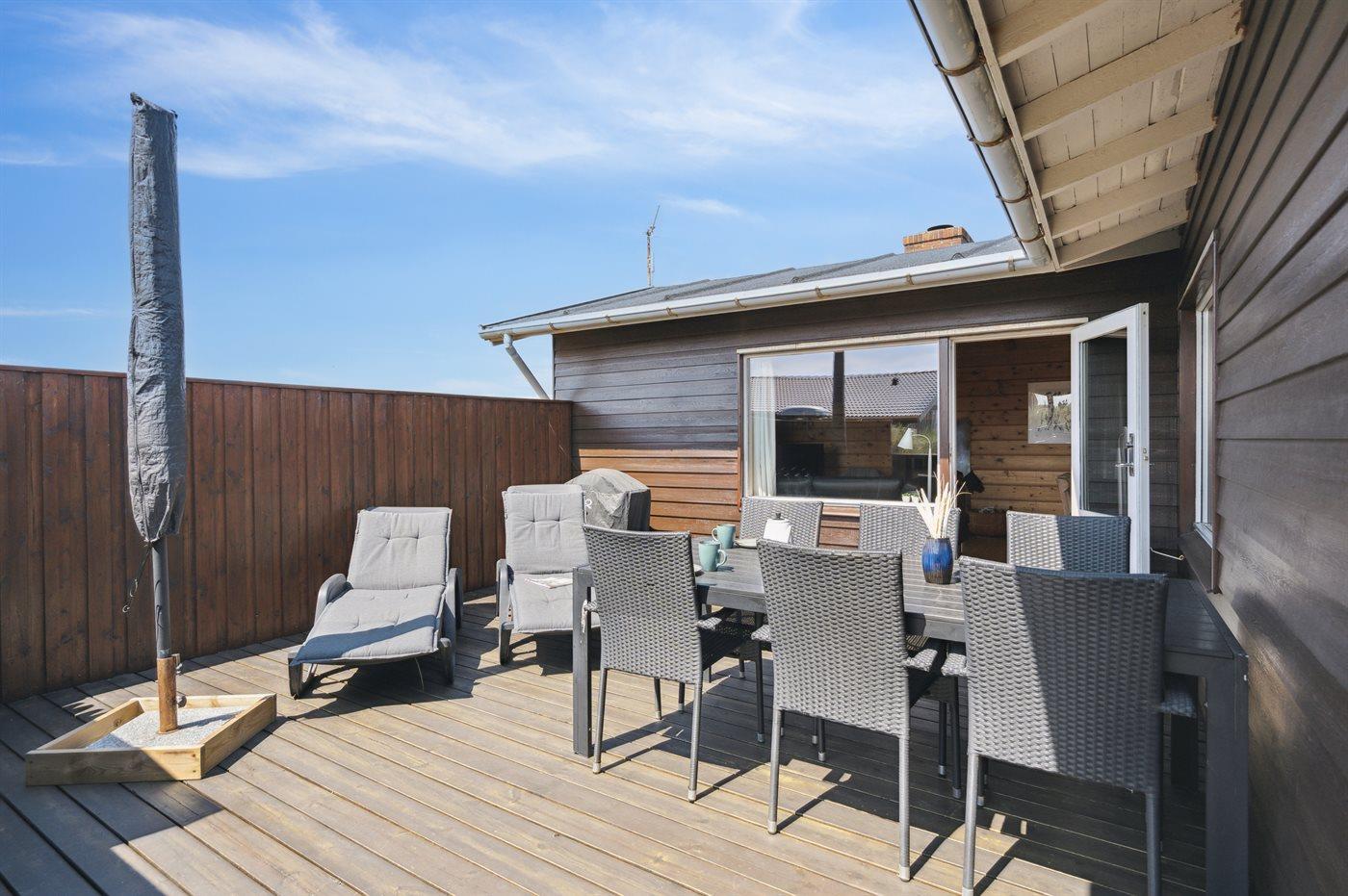 Dette bjælkesommerhus, bygget i 1984, ligger på en naturgrund kun 400 m fra havet. Til huset hører åben terrasse med havemøbler. Badeværelse med bruser. Køkkenet er bl.a. udstyret med opvaskemaskine. I opholdsstuen finder I DVD-afspiller og TV med parabol (digital). Husets sovepladser fordeler sig på 3 værelser; 1 med dobbeltseng og 2 med hver 2 enkeltsenge. Naturen omkring Bjerregård er både smuk og usædvanlig, idet området ligger ved såvel fjord som hav. Vandet omkring Bjerregård grænser op til fuglereservatet Tipperne. På alle tider af året indbyder den specielle natur på hele Holmsland Klit til vandreture og dejlige naturoplevelser.