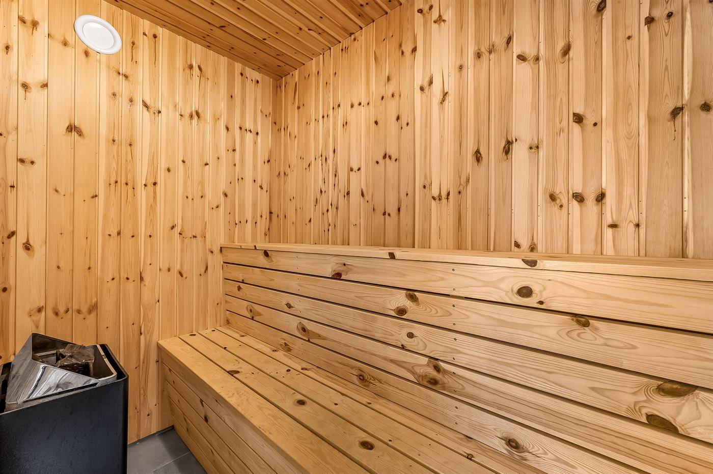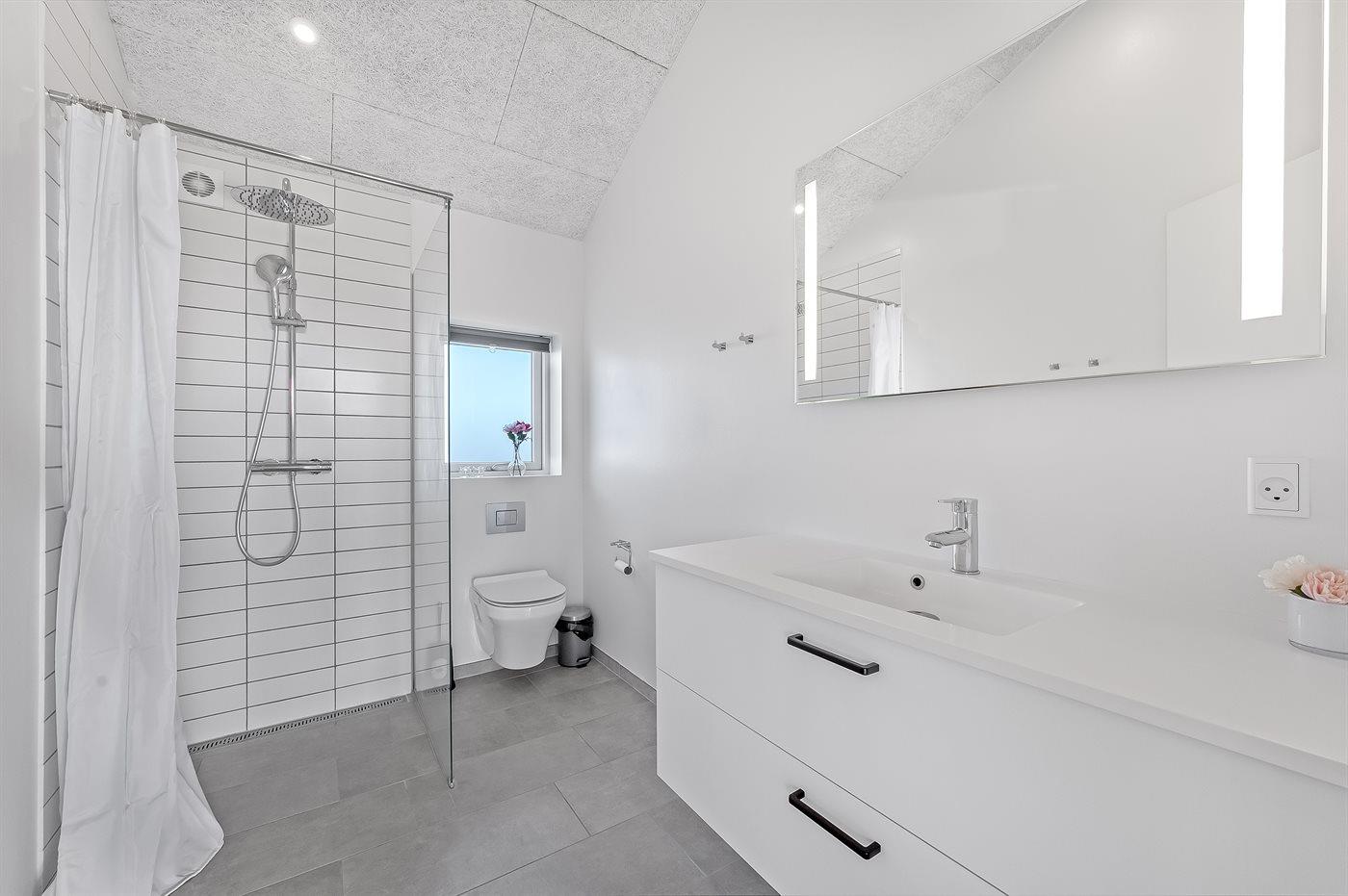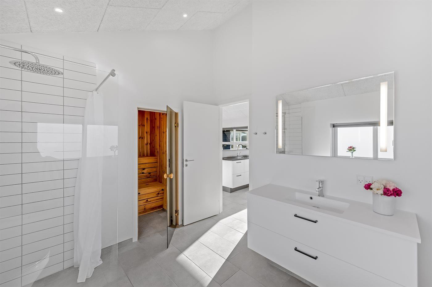 Der er 2 badeværelser med bruseniche og 2 toiletter. Der er gulvvarme på 2 badeværelser. I saunaen er der mulighed for afslapning.