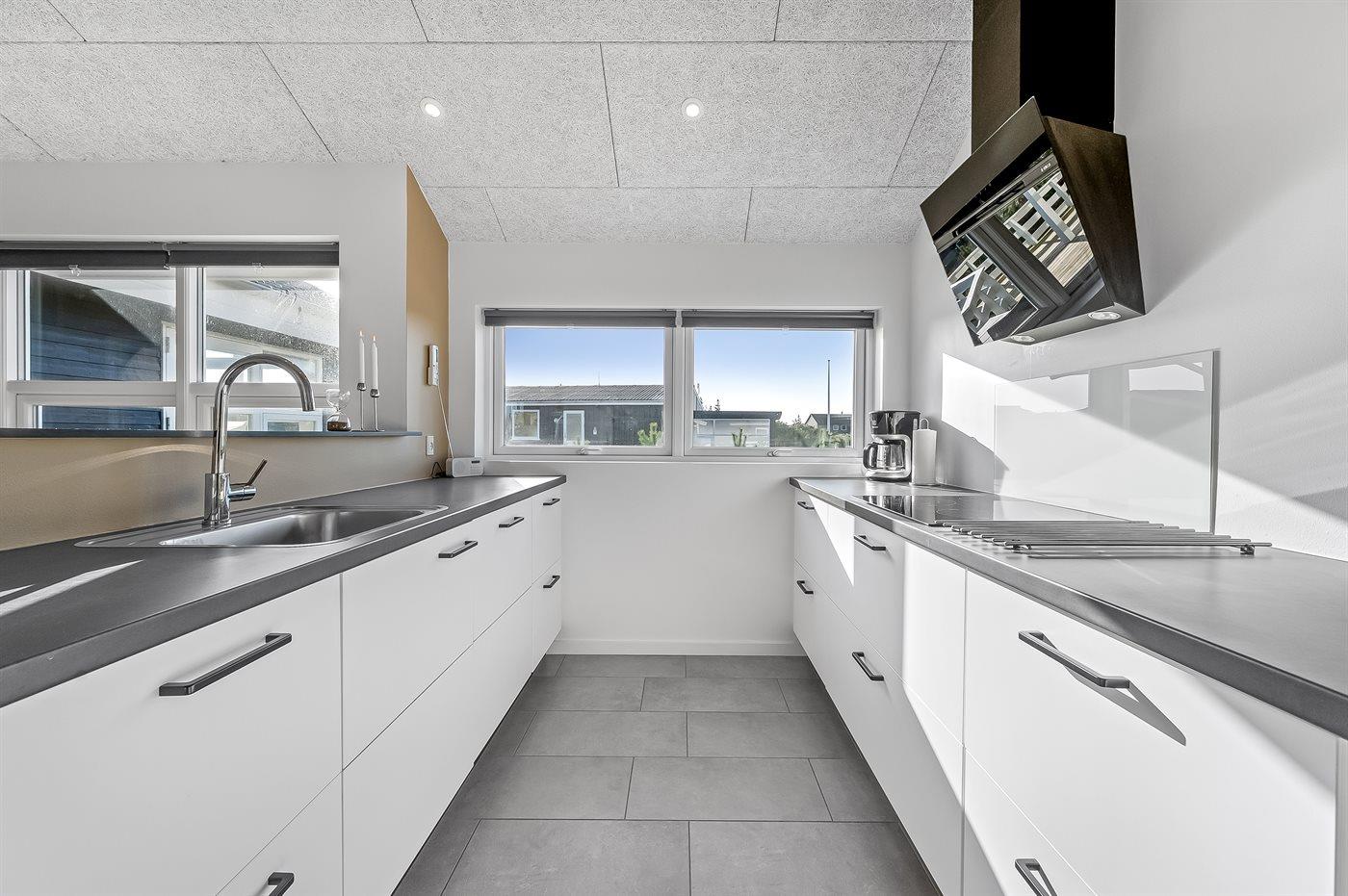 Køkkenet er udstyret med 1 køleskab. Der er 4 keramiske kogeplader, varmluftovn, mikrobølgeovn samt opvaskemaskine Der er gulvvarme i køkkenet.