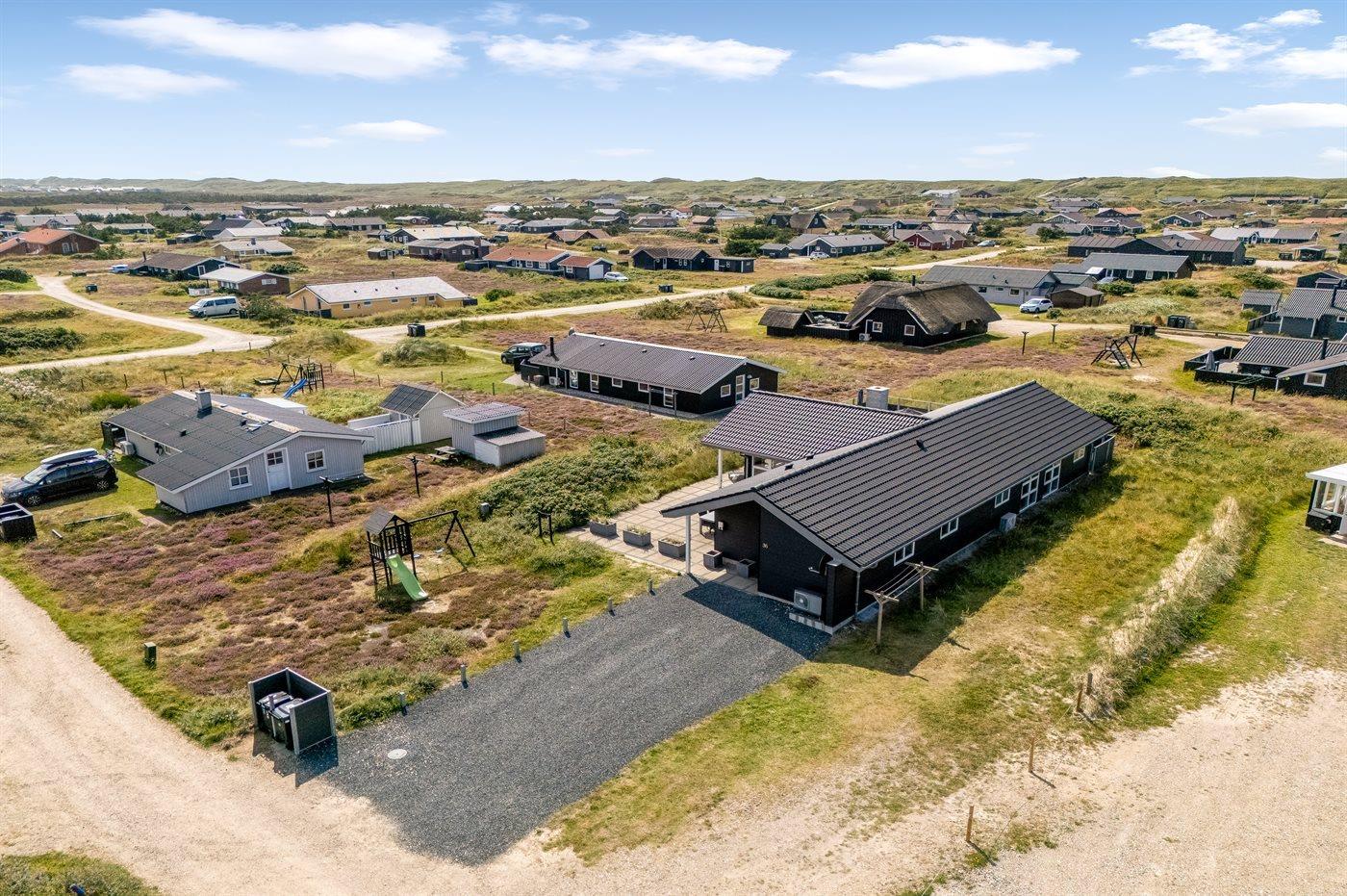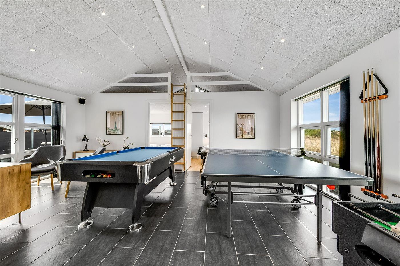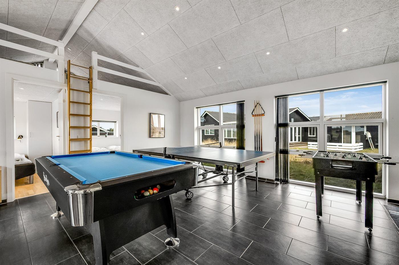 Et flot, nybygget aktivitetshus med en central beliggenhed i Bjerregaard. Her kan man nemt finde hyggen frem samtidig med, at man kan nyde den luksus som kun et nybygget sommerhus kan byde på. Lad børnene tage et spil bordfodbold bag lukkede døre i husets aktivitetsrum samtidig med at I nyder et glas vin i husets flotte opholdsstue - så er der voksen- og børnetid på selv samme tid. Huset ligger nær Vesterhavet og man fornemmer den helt specielle atmosfære, der er ved at bo i et hus nær kysten. Er man til den aktive ferie er der gode muligheder for at vandre eller cykle på naturstien, der snor sig gennem klitterne og sommerhusområderne helt fra Bjerregård til Søndervig.