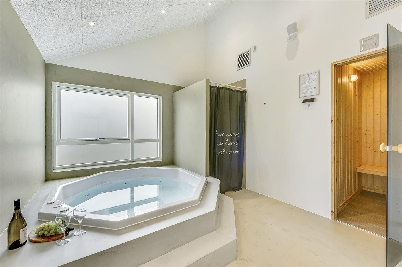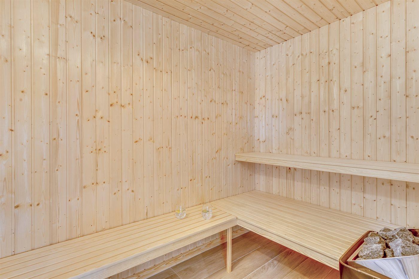 Der er 2 badeværelser med bruseniche og 2 toiletter. Der er gulvvarme på 2 badeværelser. I saunaen er der mulighed for afslapning.