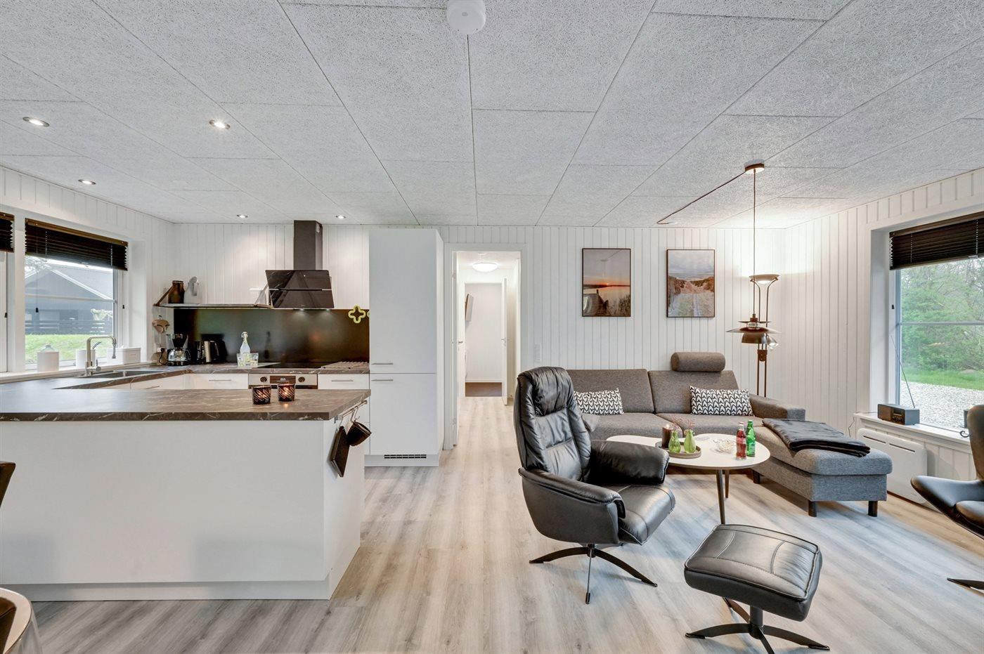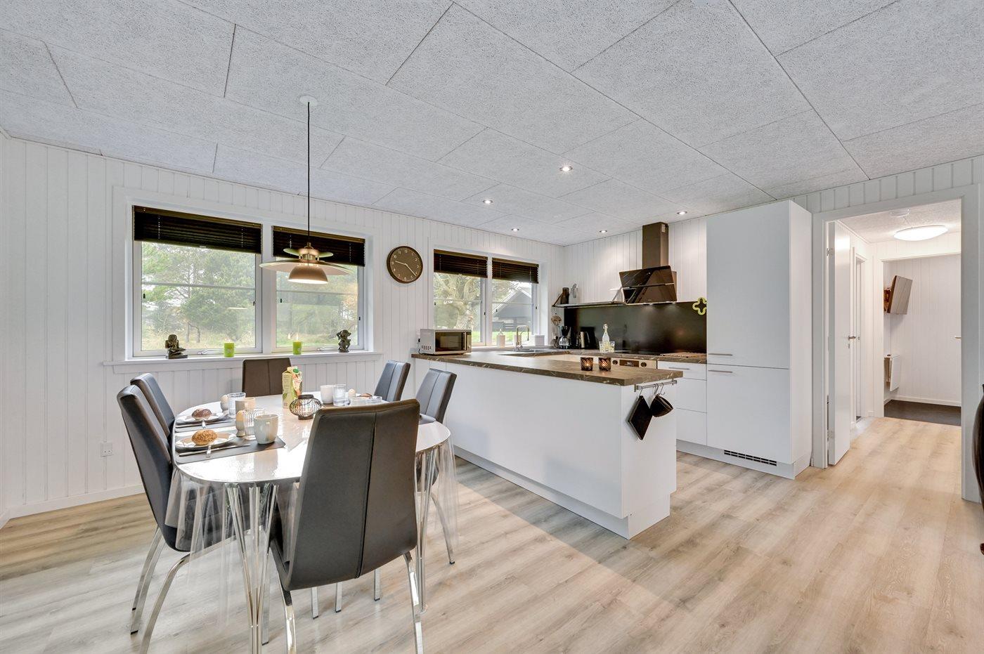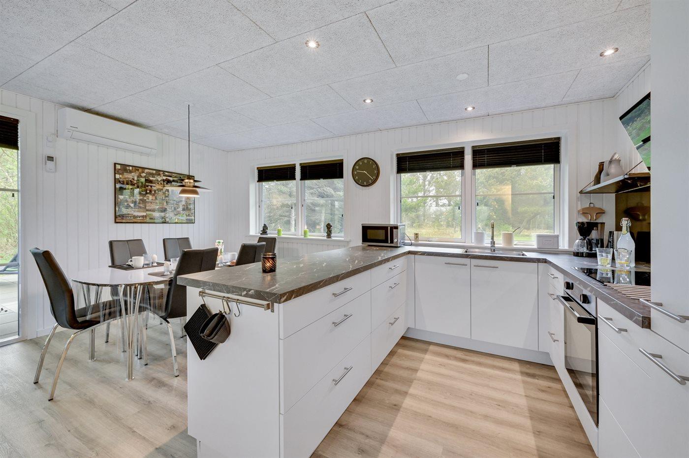 Køkkenet er udstyret med 1 køleskab. Der er 4 keramiske kogeplader, varmluftovn, mikrobølgeovn samt opvaskemaskine.