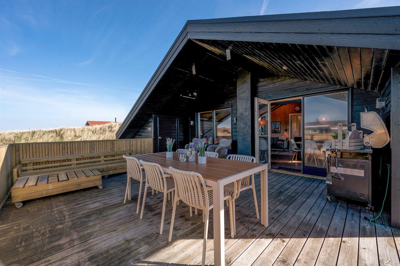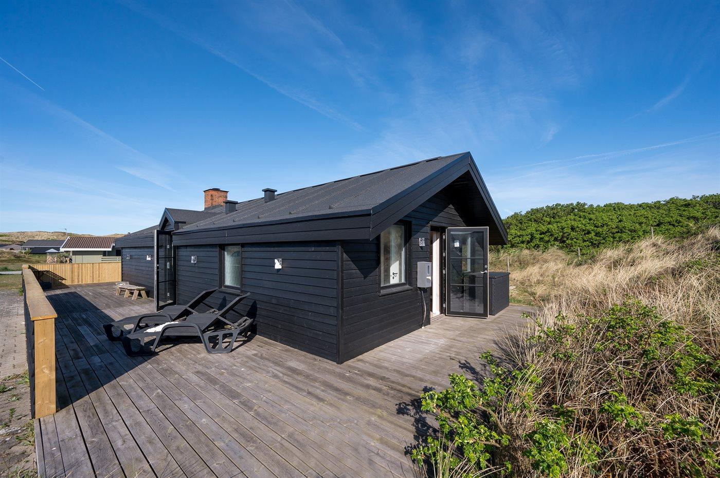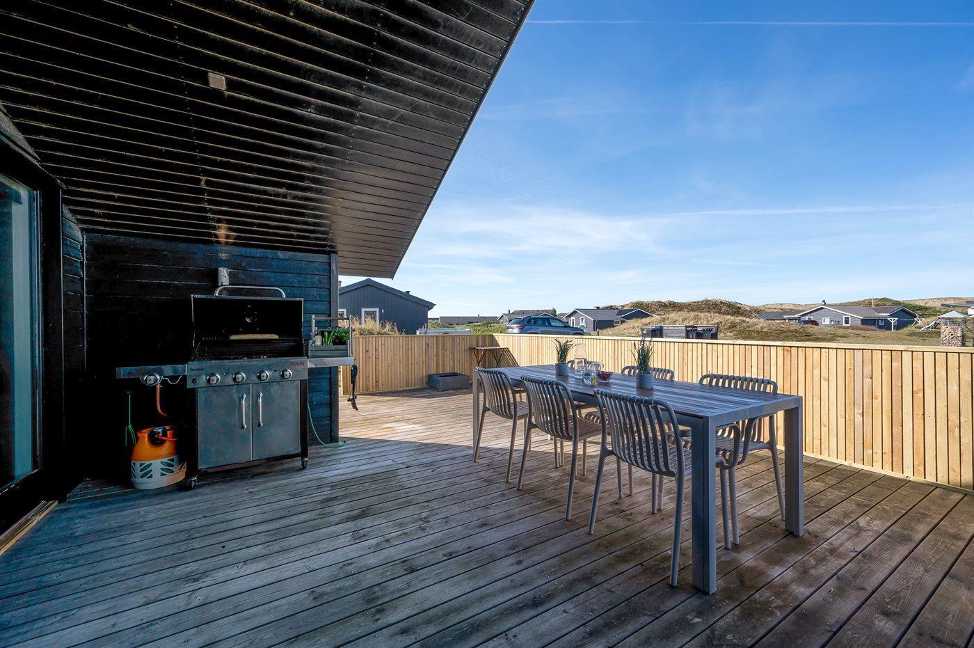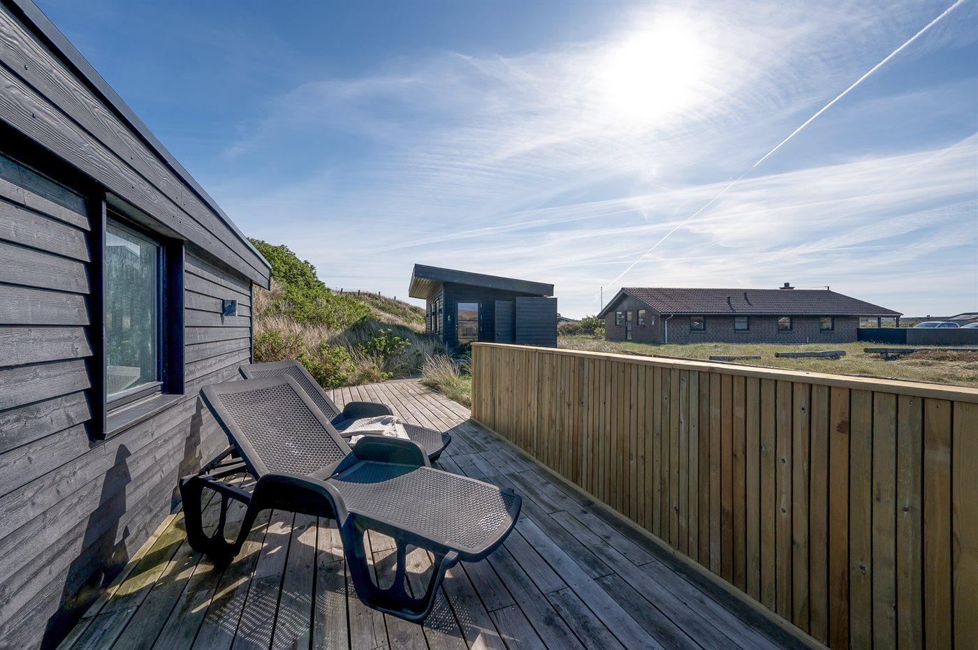 Fra køkken-alrummet er der direkte adgang til den flotte træterrasse, hvor du kan slappe af i loungemøblerne - nyde udsigten over klitterne eller en lækker frokost. På terrassen finder du også en udendørs bruser, hvor du kan skylle saltvandet af kroppen og sandet af fødderne, når du har taget en dukkert i Vesterhavet. Du kan også vælge at tage morgenbadet under åben himmel, hvilket er en fantastisk oplevelse. Udendørsbruseren kan benyttes fra april til november.