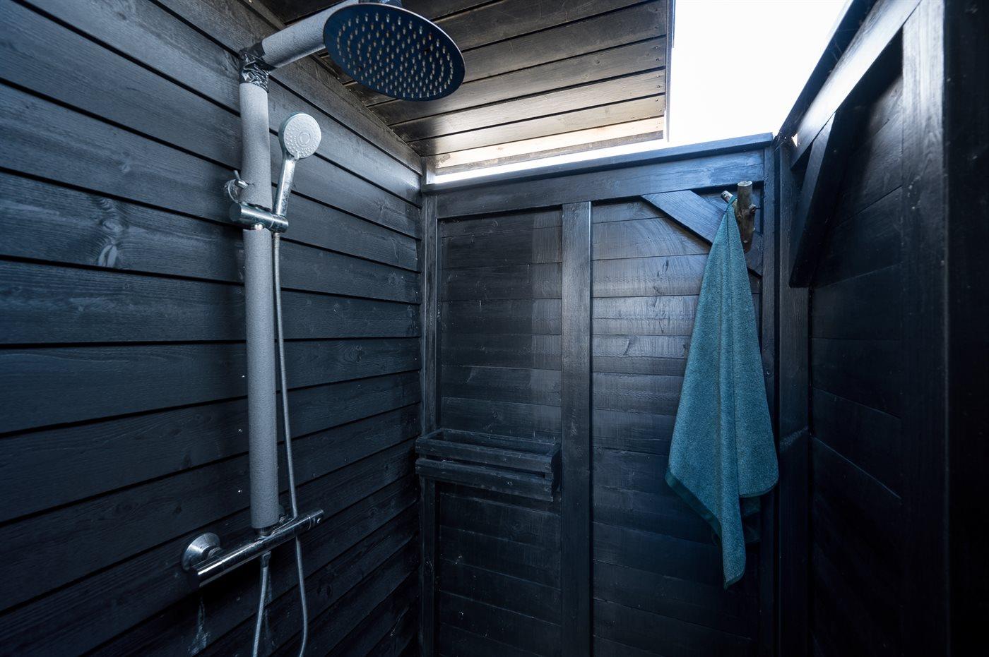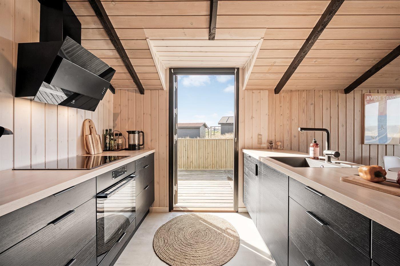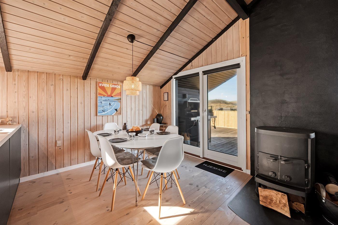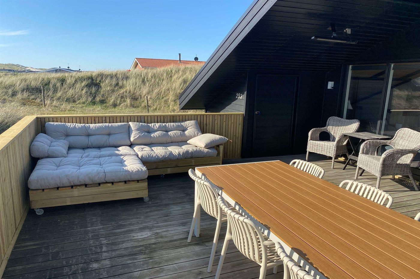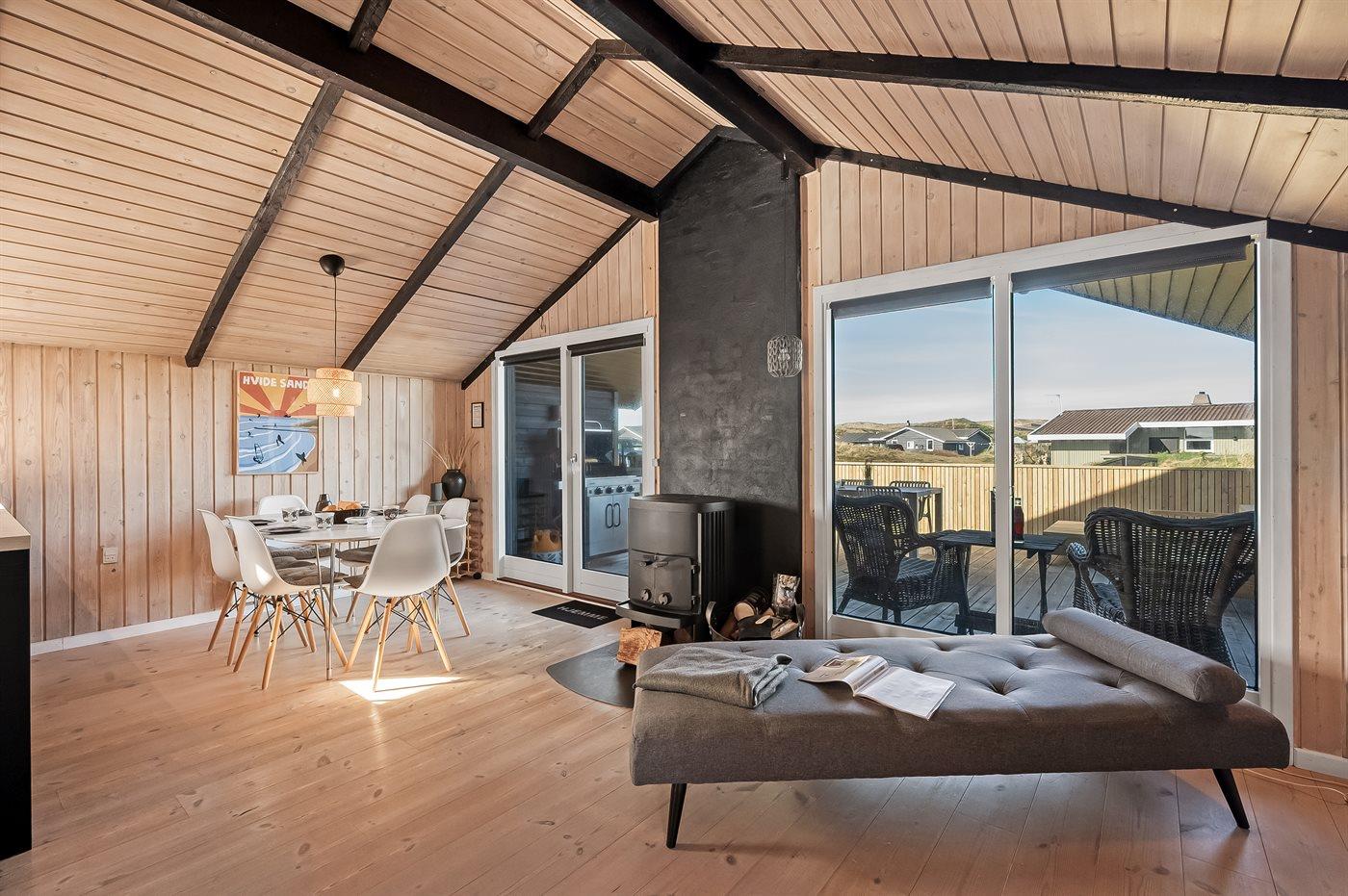 Fra køkken-alrummet er der direkte adgang til den flotte træterrasse, hvor du kan slappe af i loungemøblerne - nyde udsigten over klitterne eller en lækker frokost. På terrassen finder du også en udendørs bruser, hvor du kan skylle saltvandet af kroppen og sandet af fødderne, når du har taget en dukkert i Vesterhavet. Du kan også vælge at tage morgenbadet under åben himmel, hvilket er en fantastisk oplevelse. Udendørsbruseren kan benyttes fra april til november.