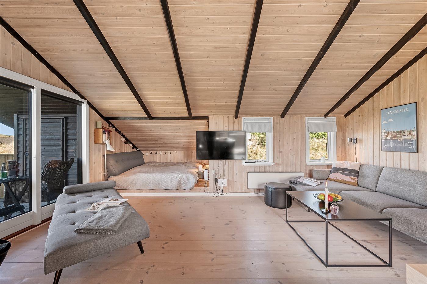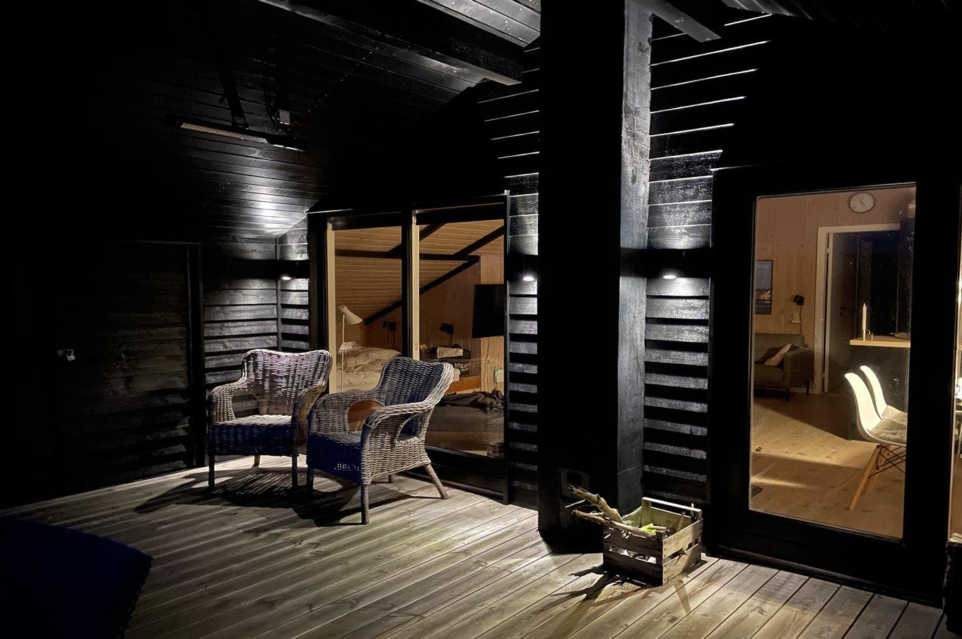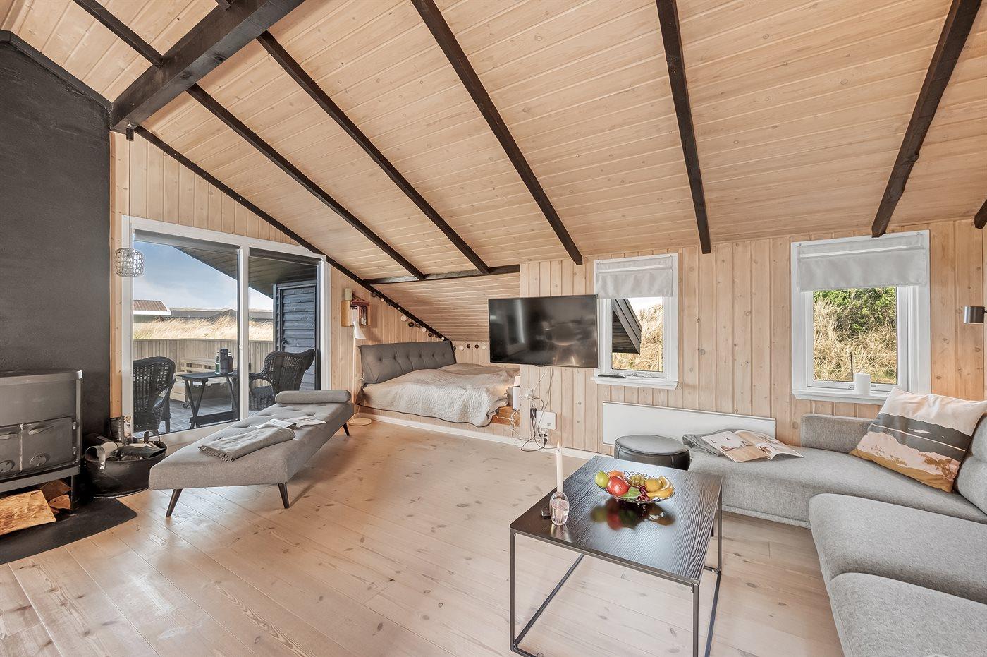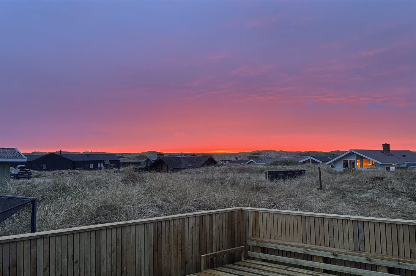 Fra køkken-alrummet er der direkte adgang til den flotte træterrasse, hvor du kan slappe af i loungemøblerne - nyde udsigten over klitterne eller en lækker frokost. På terrassen finder du også en udendørs bruser, hvor du kan skylle saltvandet af kroppen og sandet af fødderne, når du har taget en dukkert i Vesterhavet. Du kan også vælge at tage morgenbadet under åben himmel, hvilket er en fantastisk oplevelse. Udendørsbruseren kan benyttes fra april til november.