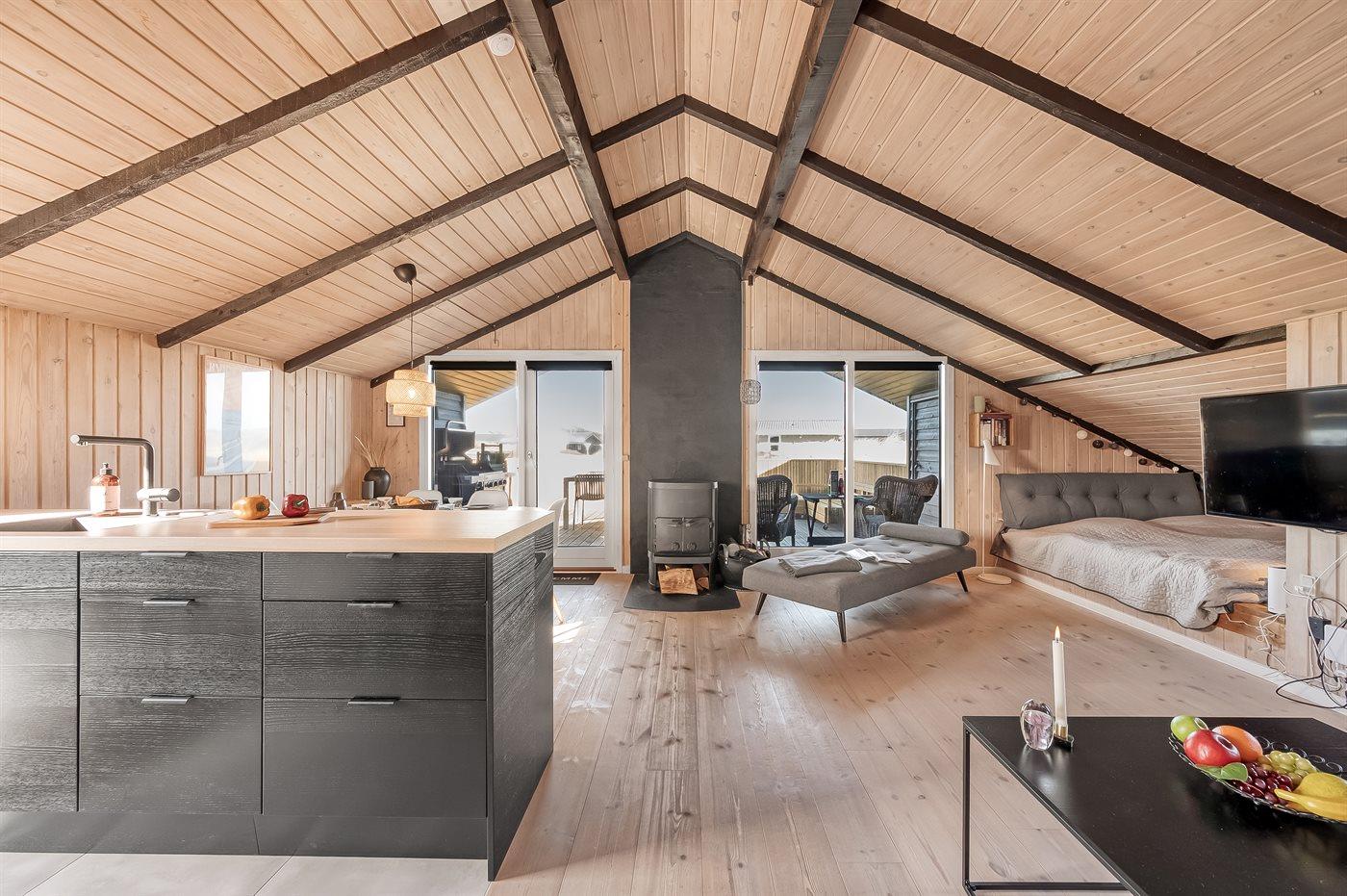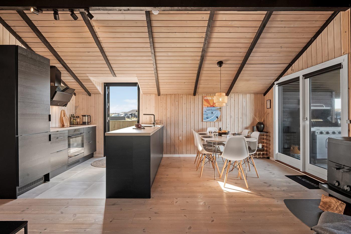 Sommerhuset har en unik charme og en æstetik, der er en blanding af skandinavisk design og funktionalitet - kombineret med tilbagelænet ’surfer-/strand-vibes’ og hygge. Sommerhusets hjerte er det store køkkenalrum med loft til kip og et flot lysindfald. Her kan du slænge dig i sofaen foran brændeovnen, som både varmer og hygger på de kølige dage og aftener. Det er også muligt at nyde hinandens selskab mens der forberedes lækre måltider - med udsigten over klitterne, som baggrundstæppe.