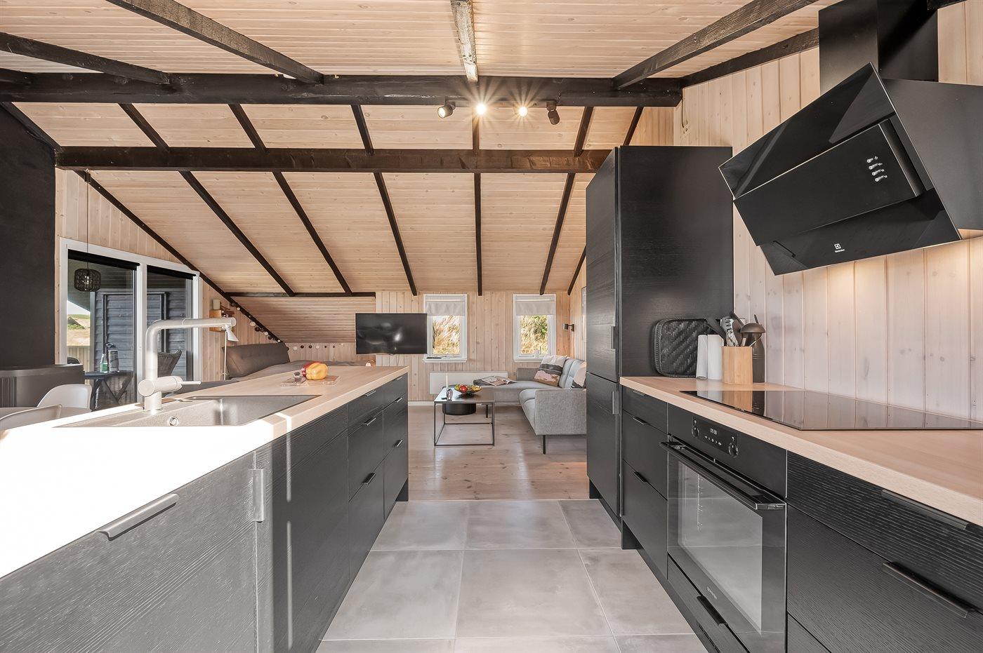Køkkenet er udstyret med 1 køleskab. Der er 4 induktionskogeplader, varmluftovn samt opvaskemaskine.