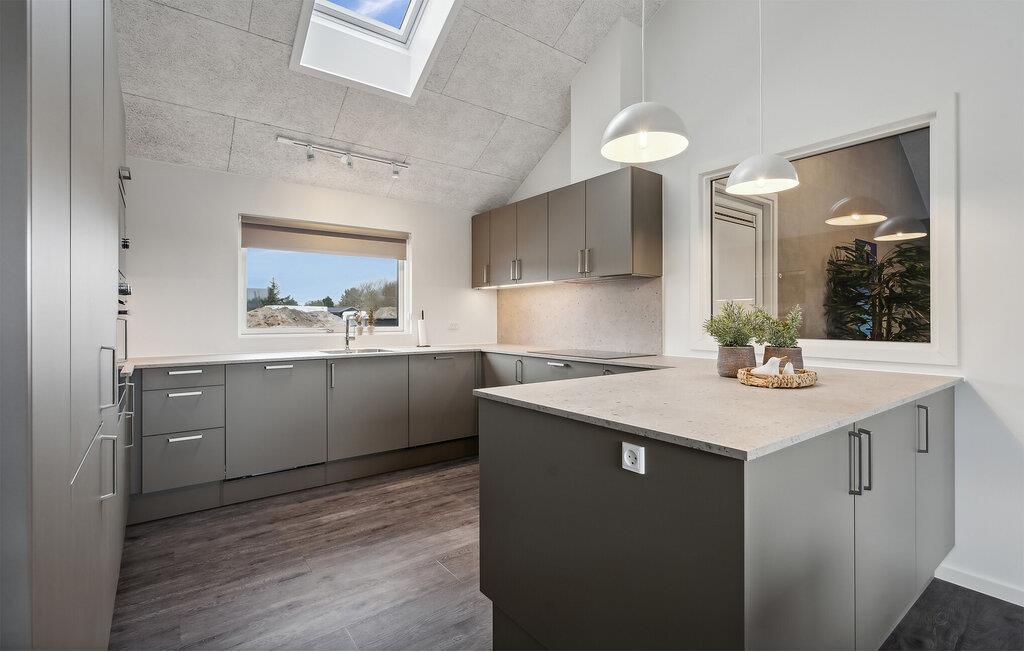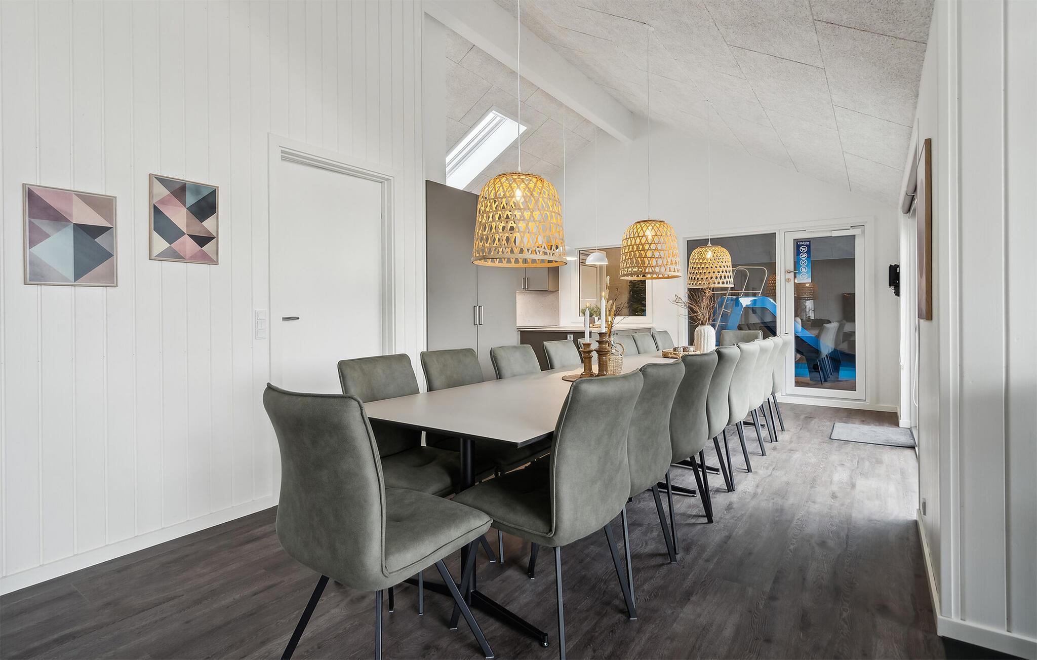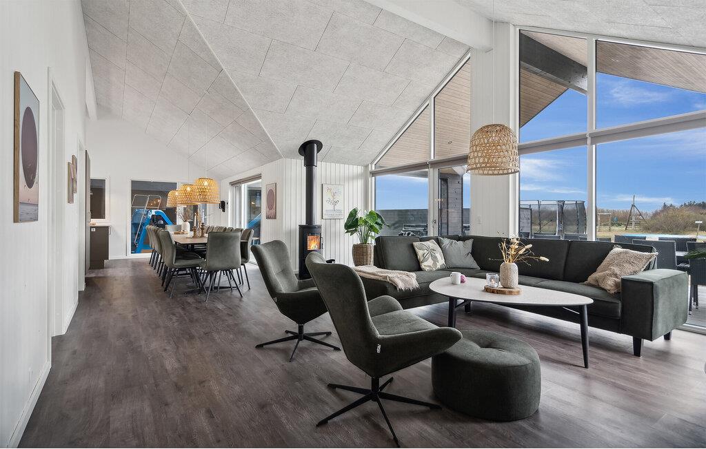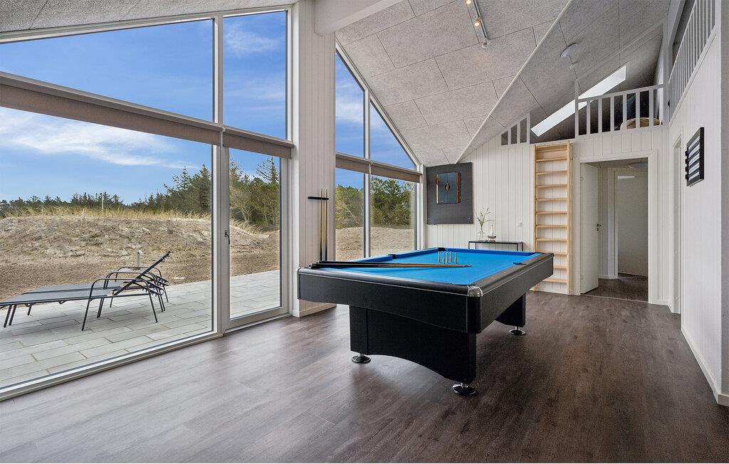 Nær havnen i Bjerregaard tæt ved Hvide Sande ligger dette spektakulære feriehus og venter på jer. Huset er særdeles rummeligt med plads nok til en stor familie eller flere vennefamilier, og så ligger den på en stor naturgrund med god plads til en intens fodboldkamp eller en vikingspilsturnering. Det storslåede, lyse hus giver jer masser af muligheder for hygge i den skønne opholdsstue. I har et veludstyret aktivitetsrum med bordfodbold- og tennis, og så er der rig mulighed for badehygge i den svømmehals-agtige pool med rutsjebane. Wellness kan I også se frem til, for huset har både en sauna indenfor og et spabad på terrassen. I de dejlige sommermåneder skal I bare hænge ud udenfor, smække benene op i liggestolene, fyre op i grillen eller spille bold på græsplænen.