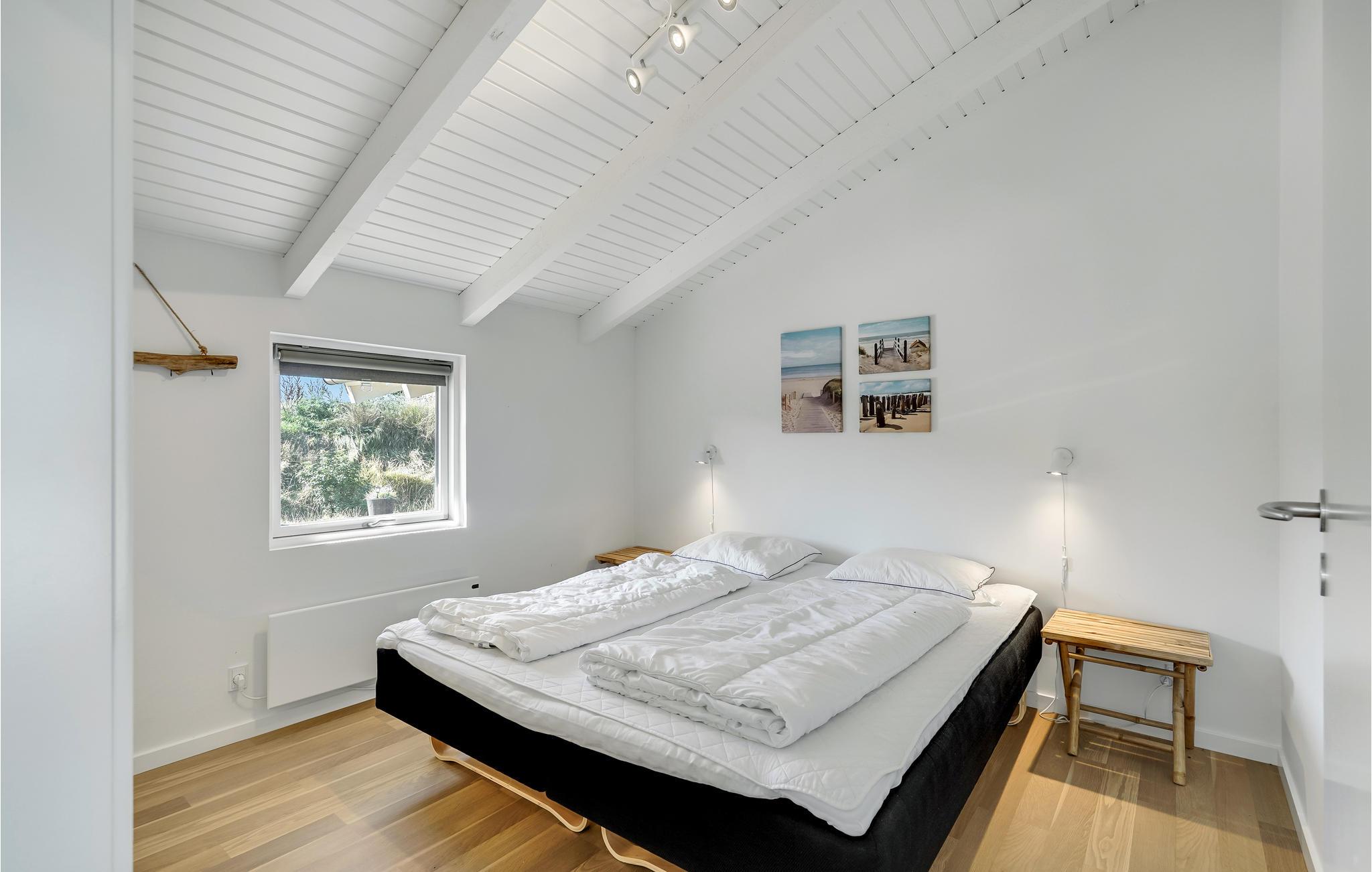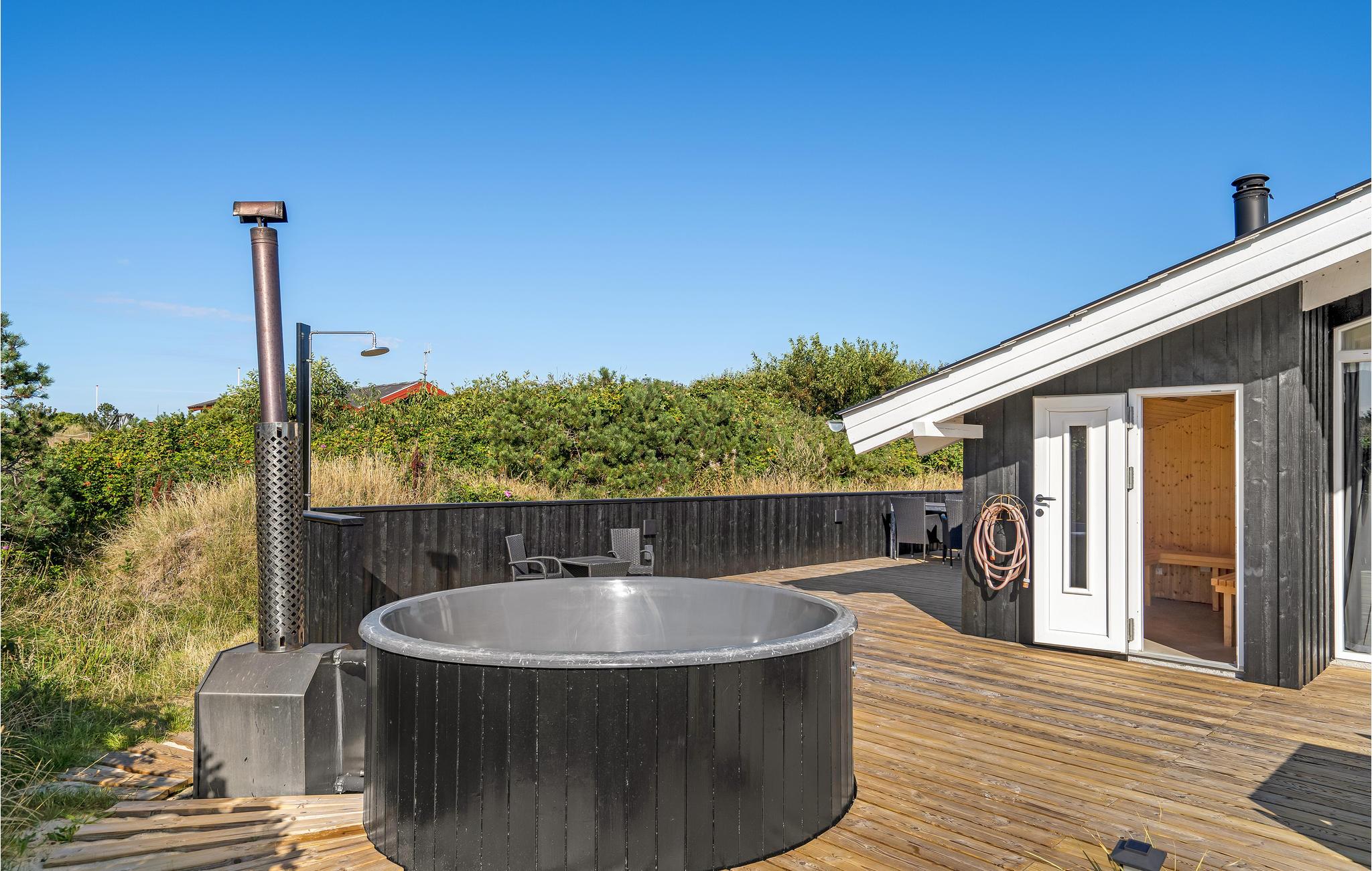 I Bjerregård ligger dette skønne feriehus, hvor I kan tage på ferie med den store familie eller to familier på tur. Her finder I alt, hvad I skal bruge til en sjov og afslappende ferie. I det indbydende lyse fællesrum kan I samles om madlavningen, dagens måltider, hyggelige brætspil eller afslapning i sofaerne. Herfra er der adgang til den store terrasse, som også byder på mange gode muligheder. Omgivet af klitterne kan I grille og nyde sommerens måltider. Små børn kan se frem til en dejlig sandkasse og en sansegynge, hvor de nemt kan få tiden til at gå. Glæd jer til at benytte saunaen og sæt jer derefter til rette i vildmarksbadet på terrassen.