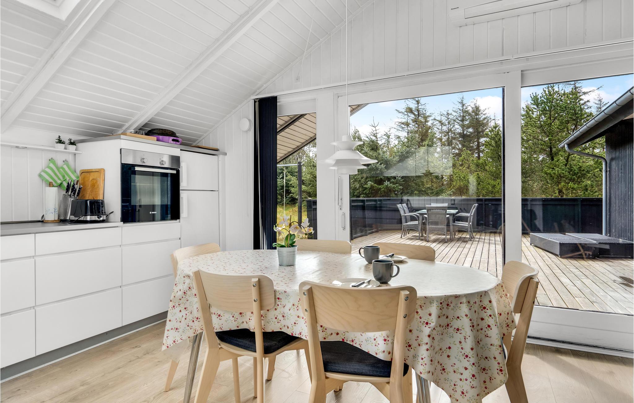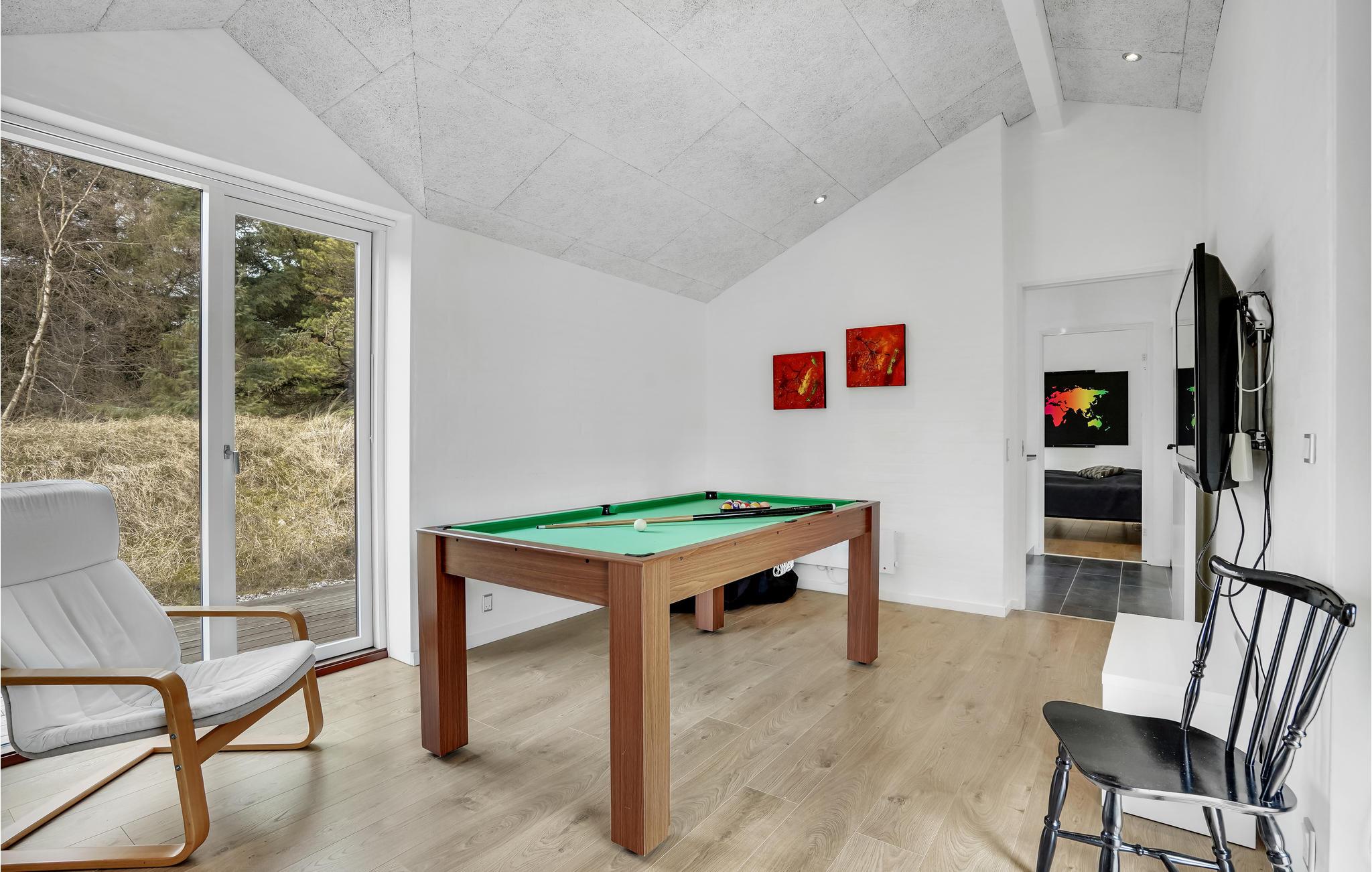 Velkommen til dette dejlige sommerhus beliggende i Bjerregård og i gåafstand til Vesterhavet. På grunden er der smukke store træer, der giver rigtig gode læmuligheder. Terrassen på 100 m² er syd-/østvendt og danner sammen med den nedgravede trampolin den perfekte ramme for en god ferieoplevelse. Det er et personligt og moderne indrettet sommerhus med et dejligt lysindfald fra de store gulv-til-loft-vinduer. Brændeovnen spreder varme og hygge i køkken/stueafdelingen, hvor I også finder en stor hjørnesofa med plads til hele familien. I huset findes 3 gode soveværelser - to med dobbeltsenge og et med to enkeltsenge, 2 badeværelser - et med spabad, og et aktivitetrum med poolbord. Det kan anbefales at aflægge byen Hvide Sande et besøg, hvor I finder spændende indkøbsmuligheder samt spisesteder. Desuden byder byen på et aktivt lystfisker- og surfliv samt en af Danmarks bedste badestrande.