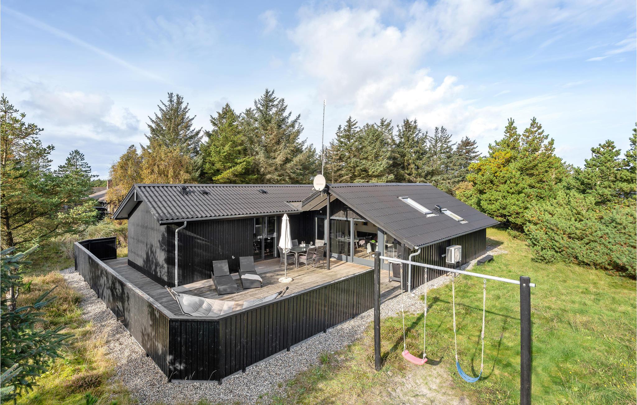 Moderne sommerhus i Bjerregård med stor terrasse, trampolin og tæt på Vesterhavet.