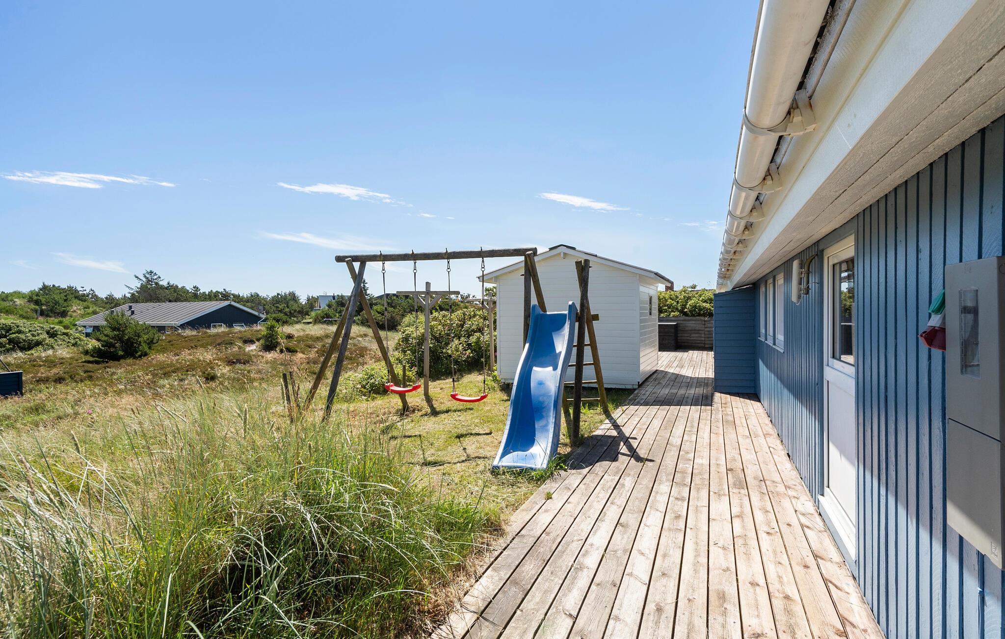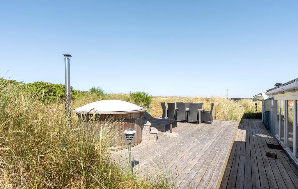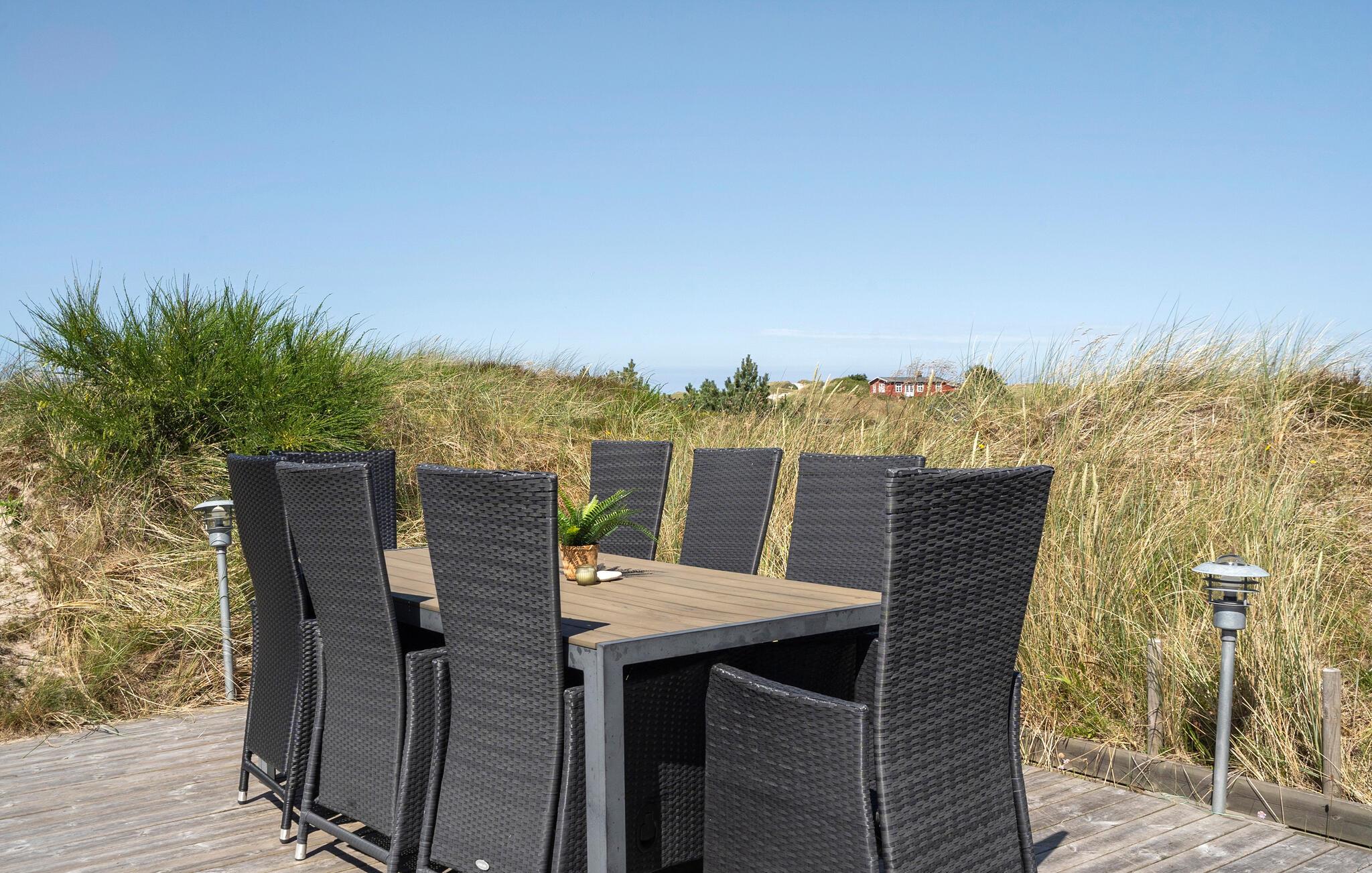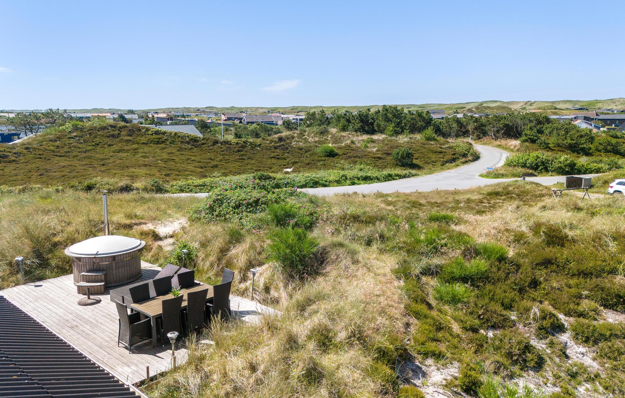 Dette dejlige feriehus er højt beliggende på en kuperet klitgrund ikke langt fra Vesterhavet og den lange hvide sandstrand. Fra stuen mod vest er der et stort og flot vinduesparti, som giver masser af lys i stuen og køkkenet, hvorfra der er udgang til en stor terrasse. Herfra har I en dejlig udsigt over området og klitterne. Om aftenen kan I sidde i sofaen og nyde varmen fra brændeovnen, og evt. se en god film, da der er et stort udvalg af både danske og tyske TV-kanaler at vælge imellem. Udendørs er der store træterrasser hele vejen rundt om huset, og på den vestvendte terrasse er der god plads til at nyde solen eller se aftensolen gå ned. Husejeren gør meget for, at I kan spare på energiforbruget i huset. Til poolopvarmning er der monteret en varmeveksler som nedsætter forbruget væsentligt, og til opvarmning af huset kan I med fordel benytte den energibesparende varmepumpe, som på varme dage også kan fungere som aircondition. Kun et par hundrede meter fra huset er et stort fredet klitområde med gode vandrestier og gode muligheder for at følge det rige dyreliv året rundt.