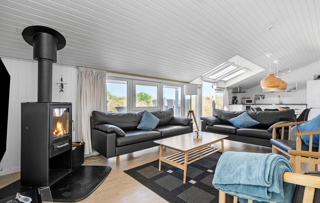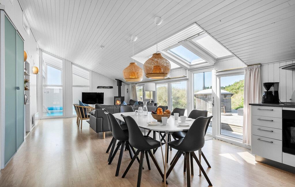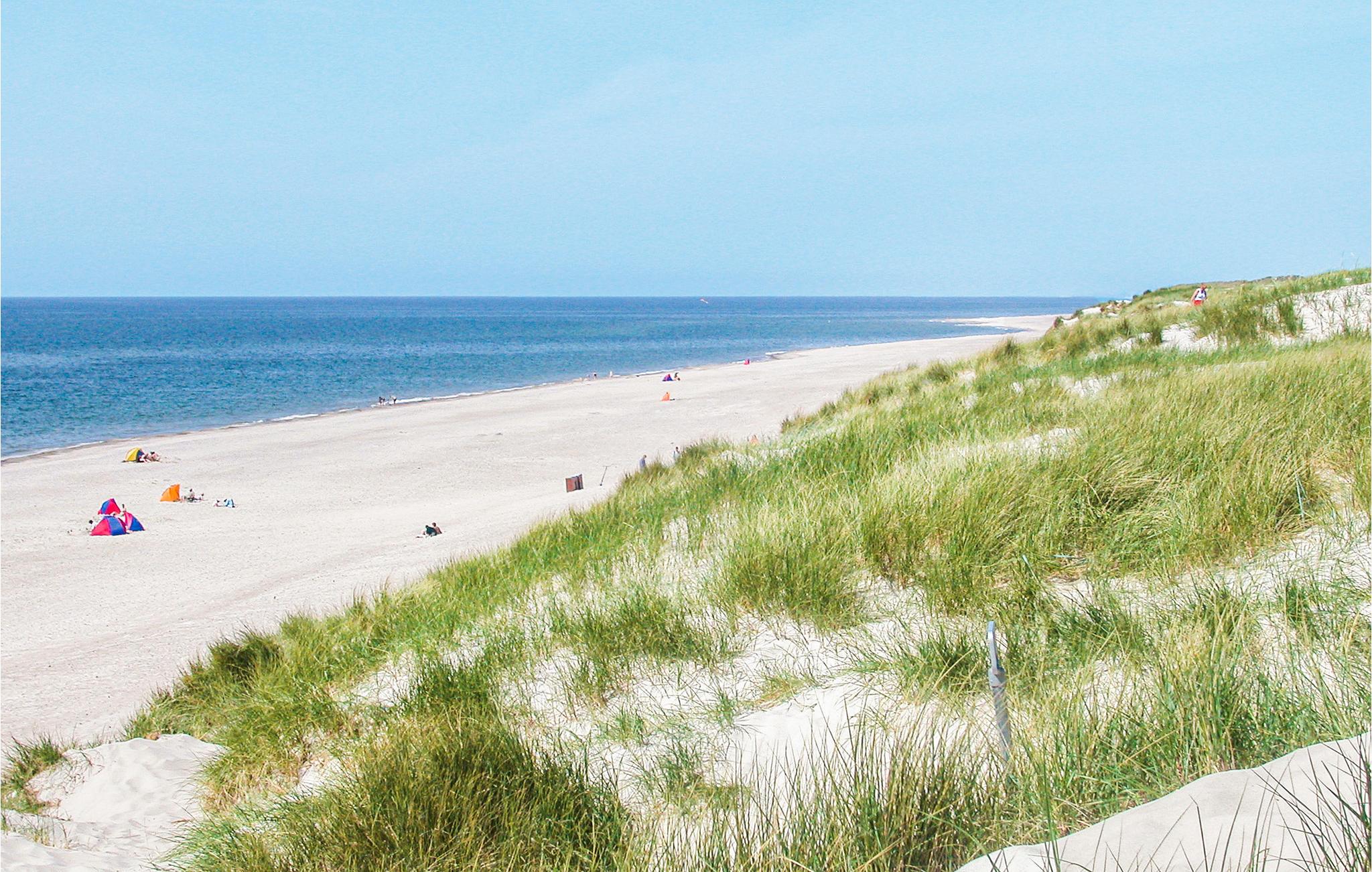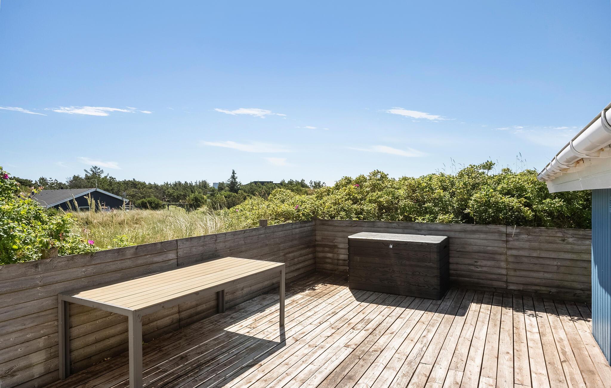 Dette dejlige feriehus er højt beliggende på en kuperet klitgrund ikke langt fra Vesterhavet og den lange hvide sandstrand. Fra stuen mod vest er der et stort og flot vinduesparti, som giver masser af lys i stuen og køkkenet, hvorfra der er udgang til en stor terrasse. Herfra har I en dejlig udsigt over området og klitterne. Om aftenen kan I sidde i sofaen og nyde varmen fra brændeovnen, og evt. se en god film, da der er et stort udvalg af både danske og tyske TV-kanaler at vælge imellem. Udendørs er der store træterrasser hele vejen rundt om huset, og på den vestvendte terrasse er der god plads til at nyde solen eller se aftensolen gå ned. Husejeren gør meget for, at I kan spare på energiforbruget i huset. Til poolopvarmning er der monteret en varmeveksler som nedsætter forbruget væsentligt, og til opvarmning af huset kan I med fordel benytte den energibesparende varmepumpe, som på varme dage også kan fungere som aircondition. Kun et par hundrede meter fra huset er et stort fredet klitområde med gode vandrestier og gode muligheder for at følge det rige dyreliv året rundt.