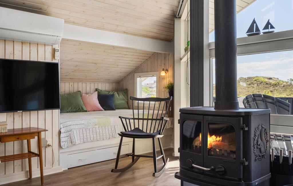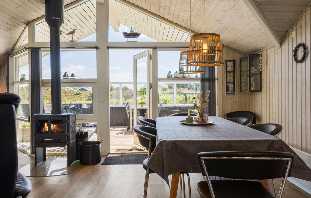Velkommen til dette dejlige hus med store vinduer, der strækker sig helt til tagryggen og bader det åbne opholds- og spiseområde med naturligt lys og udsigt over klitterne. Sæt jer godt til rette i sofaen eller nyd en stille stund i den komfortable lænestol med fodskammel. Brug alkoven som et lille helle, når I skal læse videre i en spændende feriekrimi eller som en ekstra soveplads. På kølige aftener kan I tænde op i brændeovnen og mærke den behagelige varme brede sig, mens I samles omkring det store spisebord. Det åbne, moderne køkken med kogeø lægger op til at lave maden sammen og slappe af sidst på ??dagen. Efter en lang gåtur på stranden kan I hvile ud i spabadet.