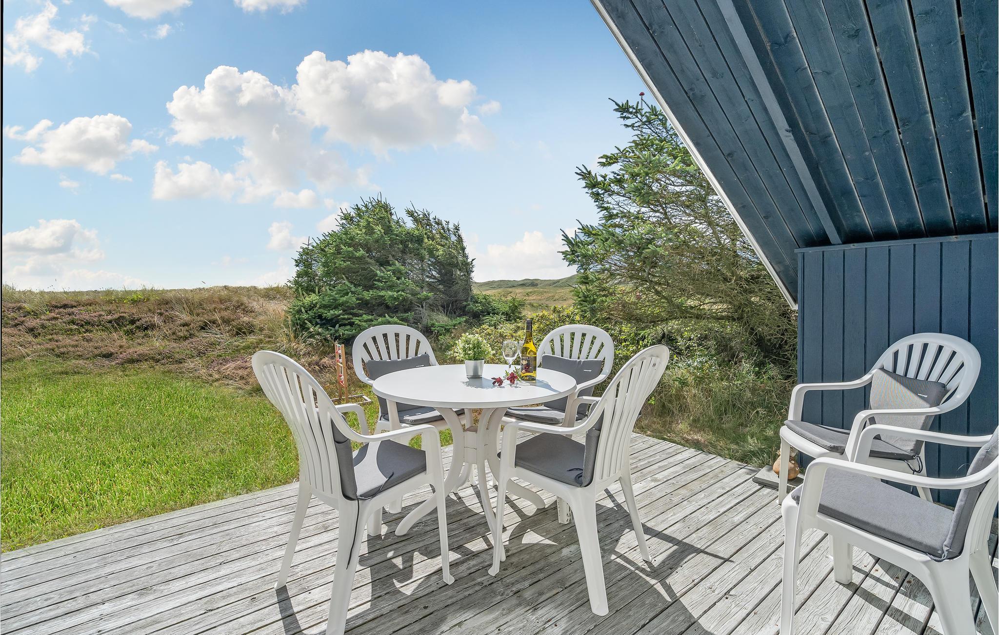 Udendørs finder i en træterrasse med havemøbler til jeres rådighed, så I let kan nyde feriens måltider i det fri og drikke et glas kølig vin på de lune sommeraftener. Fra terrassen har I en skøn udsigt til de omkringliggende klitter - Glæd jer ægte Vesterhavsstemning i "Klukhuset".