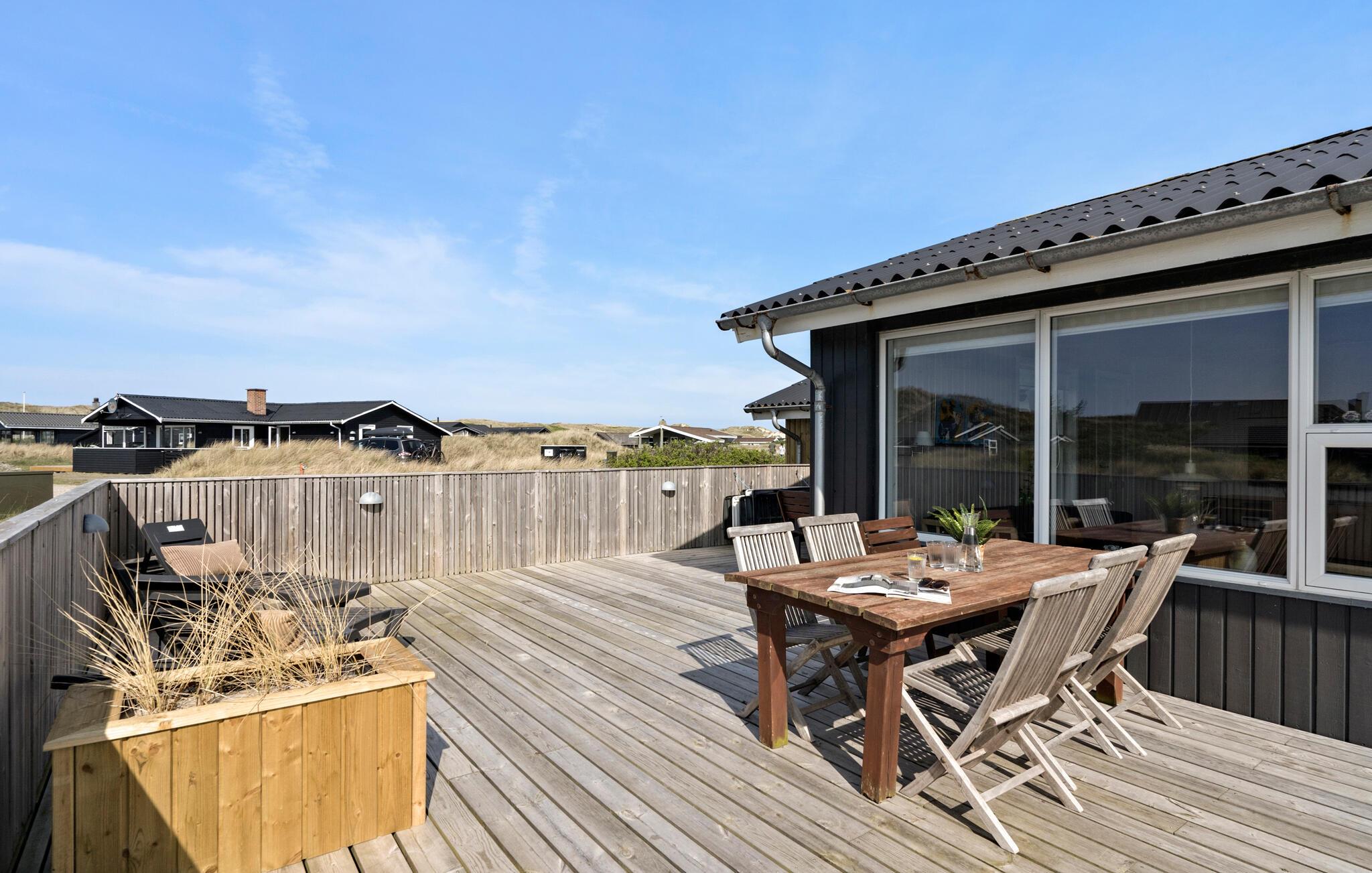 I Bjerregård, lige midt mellem Ringkøbing Fjord og Vesterhavet ligger dette skønne og velholdte sommerhus, klar til at danne rammen om jeres ferie. Med kun 250 m til stranden er huset placeret i den skønneste Vestjyske natur med klitter, sandstrand og masser af hedearealer. Her finder I vandre- og cykelstier, der snor sig gennem klitterne, sommerhusområderne og det smukke landskab. Huset er til otte personer og indrettet med fire soveværelser samt et dejligt køkken i åben forbindelse med stuen. Overalt er der lyst og dejligt, og fra den moderne indrettede stue er der udgang til den ene af husets to terrasser med havemøbler. På årstider hvor vejret ikke indbyder til solbadning og udeliv på terrassen, er der mulighed for at tænde op i brændeovnen og nyde ildens knitren, eller forkæle sig selv med en tur i sauna eller i et lunt spabad.