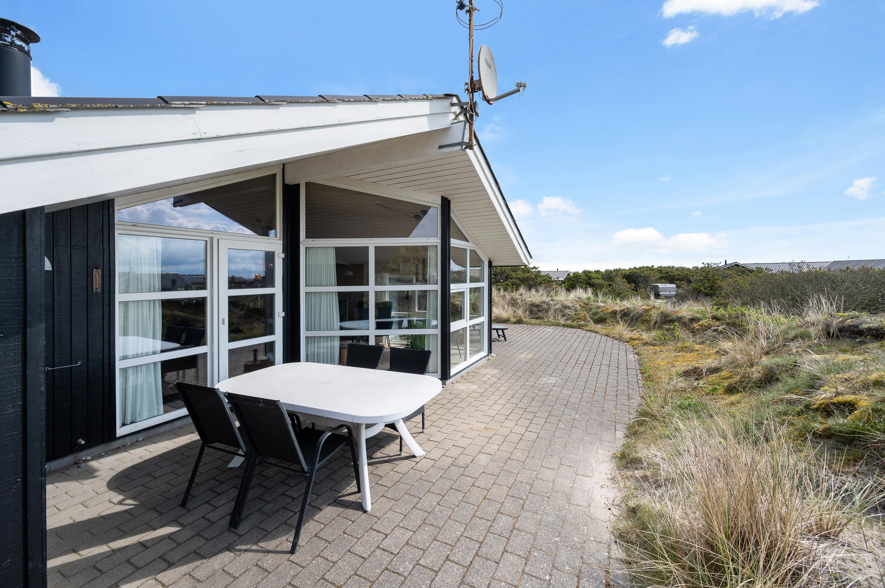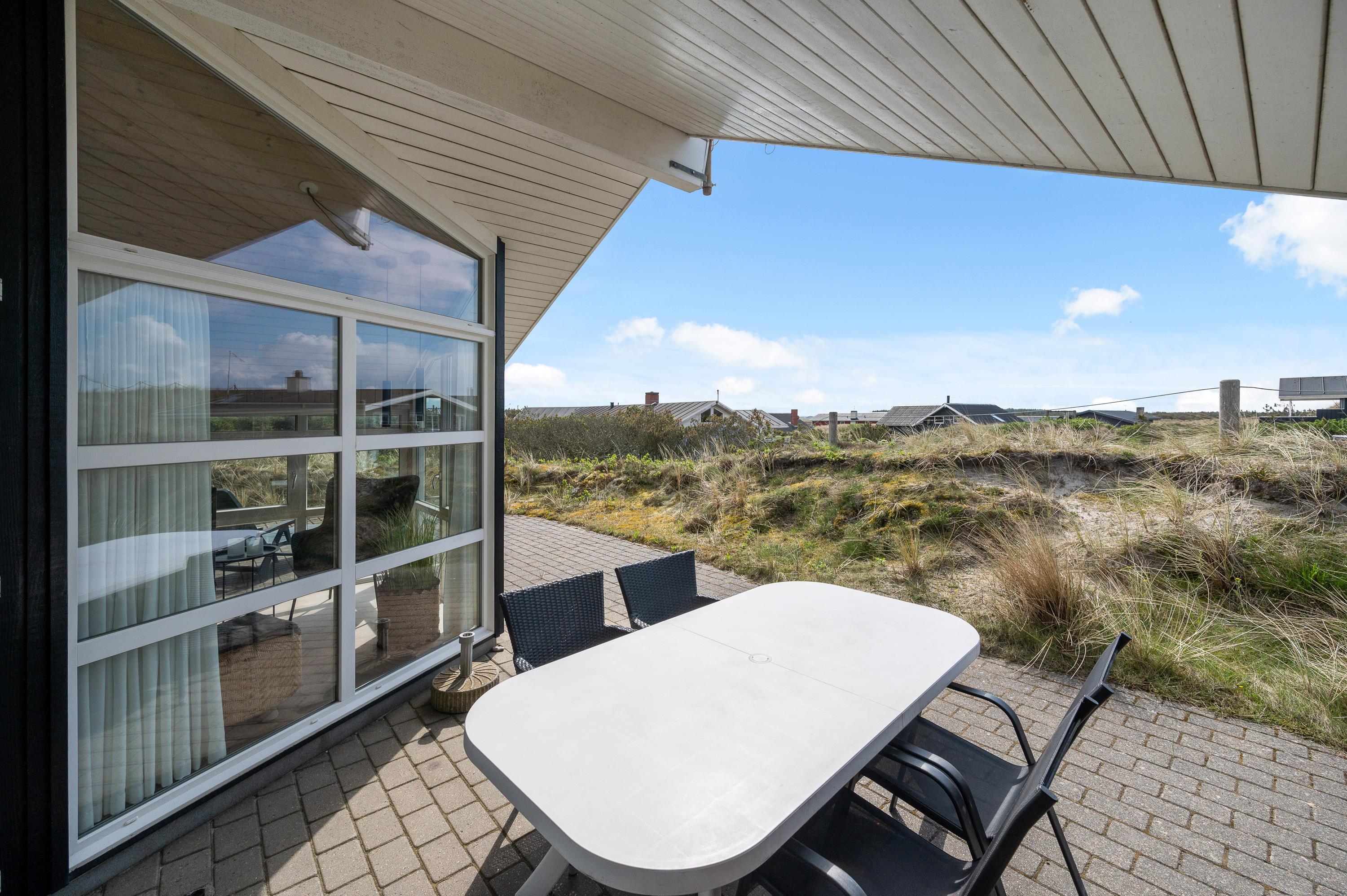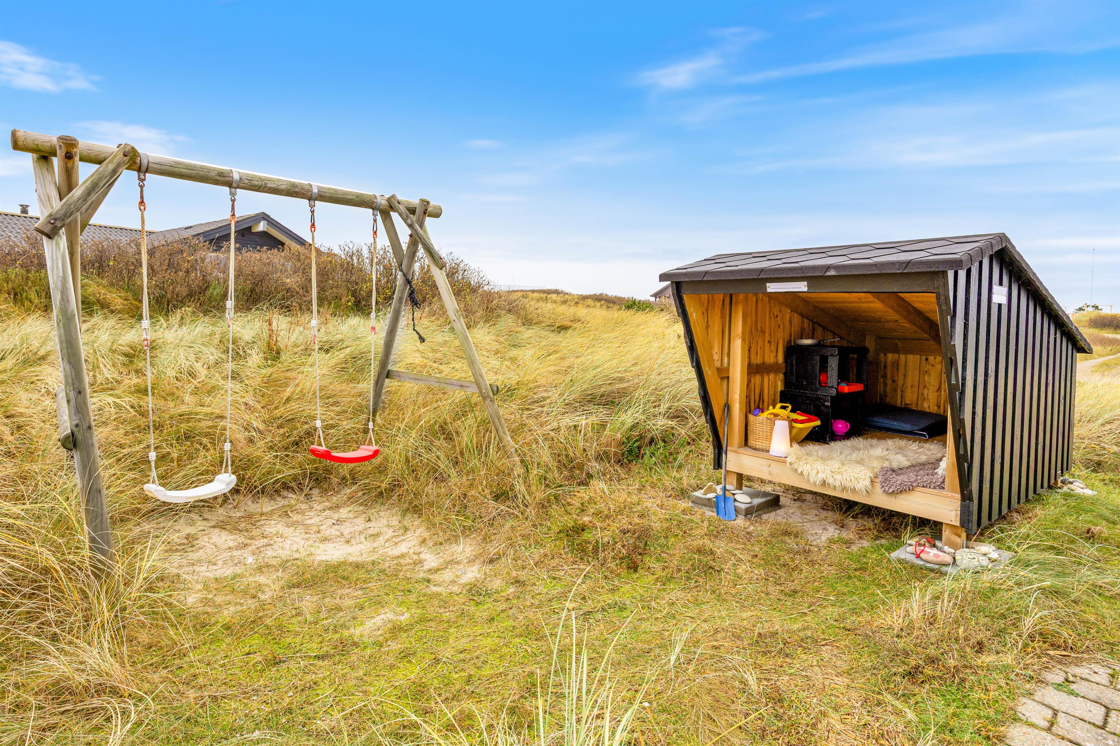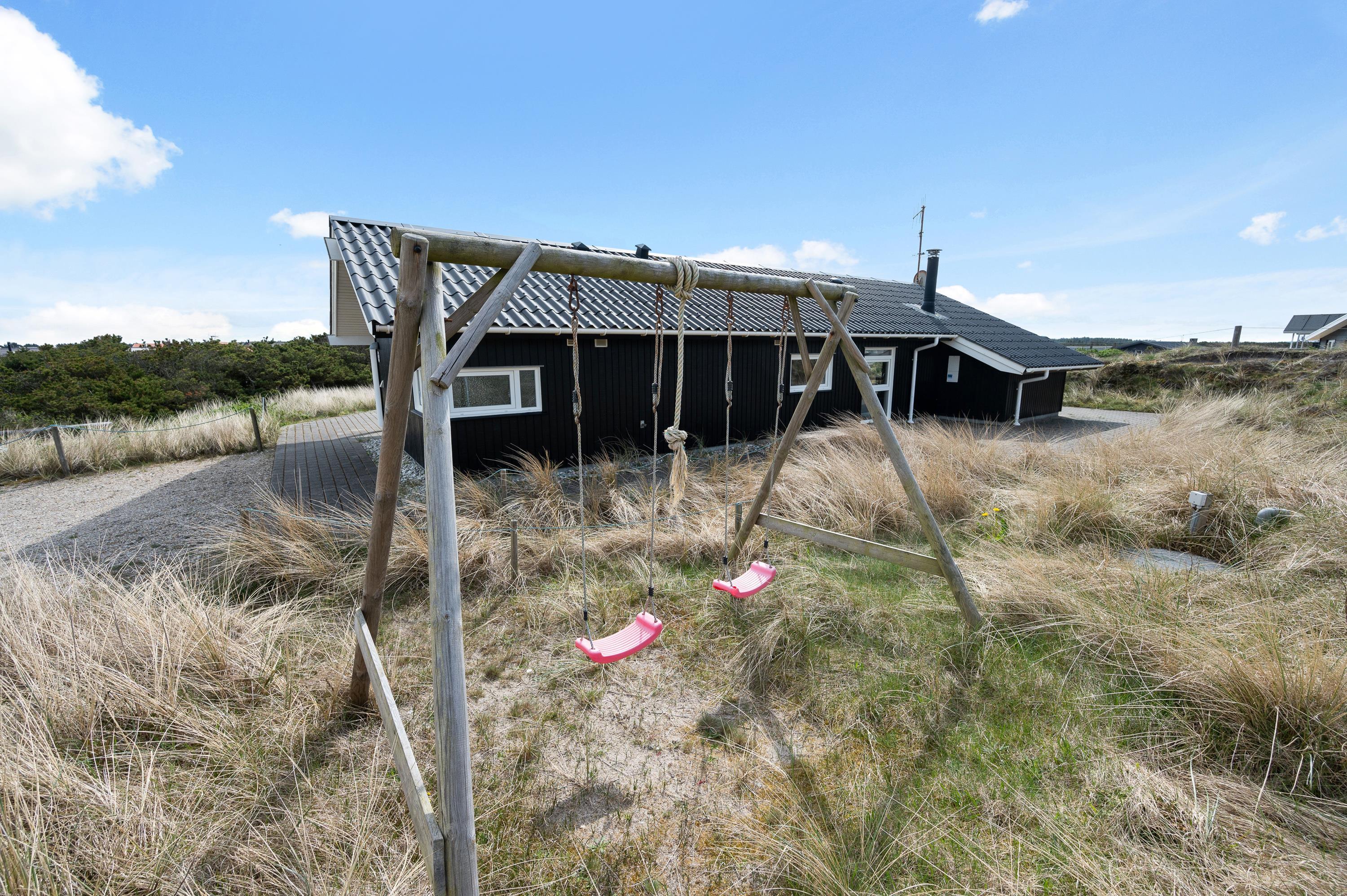 Den store terrasse strækker sig hele vejen rundt om feriehuset, men det vigtigste sted er den sydvendte del. Her har I mulighed for at nyde solen eller et lækkert grillmåltid. Terrassen er delvist overdækket, så I kan sidde i læ for lidt regn på en ellers lun sommeraften. Her er også tænkt på børnene, som kan benytte sig af gyngestativet.
