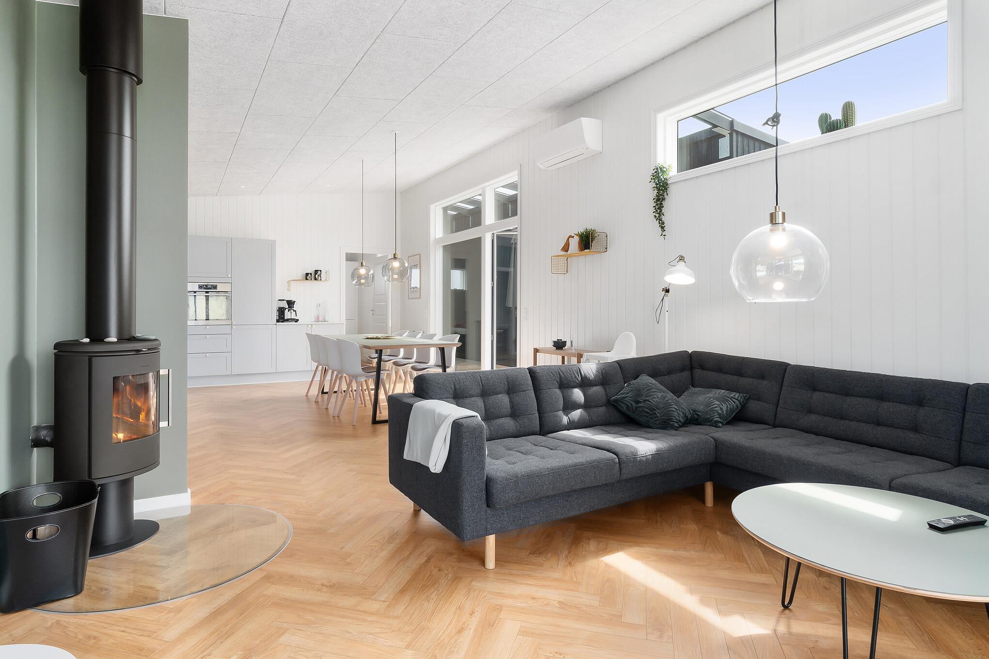 Ved sofahjørnet er der en brændeovn, som både spreder varme og ekstra hyggelig feriestemning. I kan med fordel også bruge varmepumpen til at holde temperaturen i rummet behagelig.