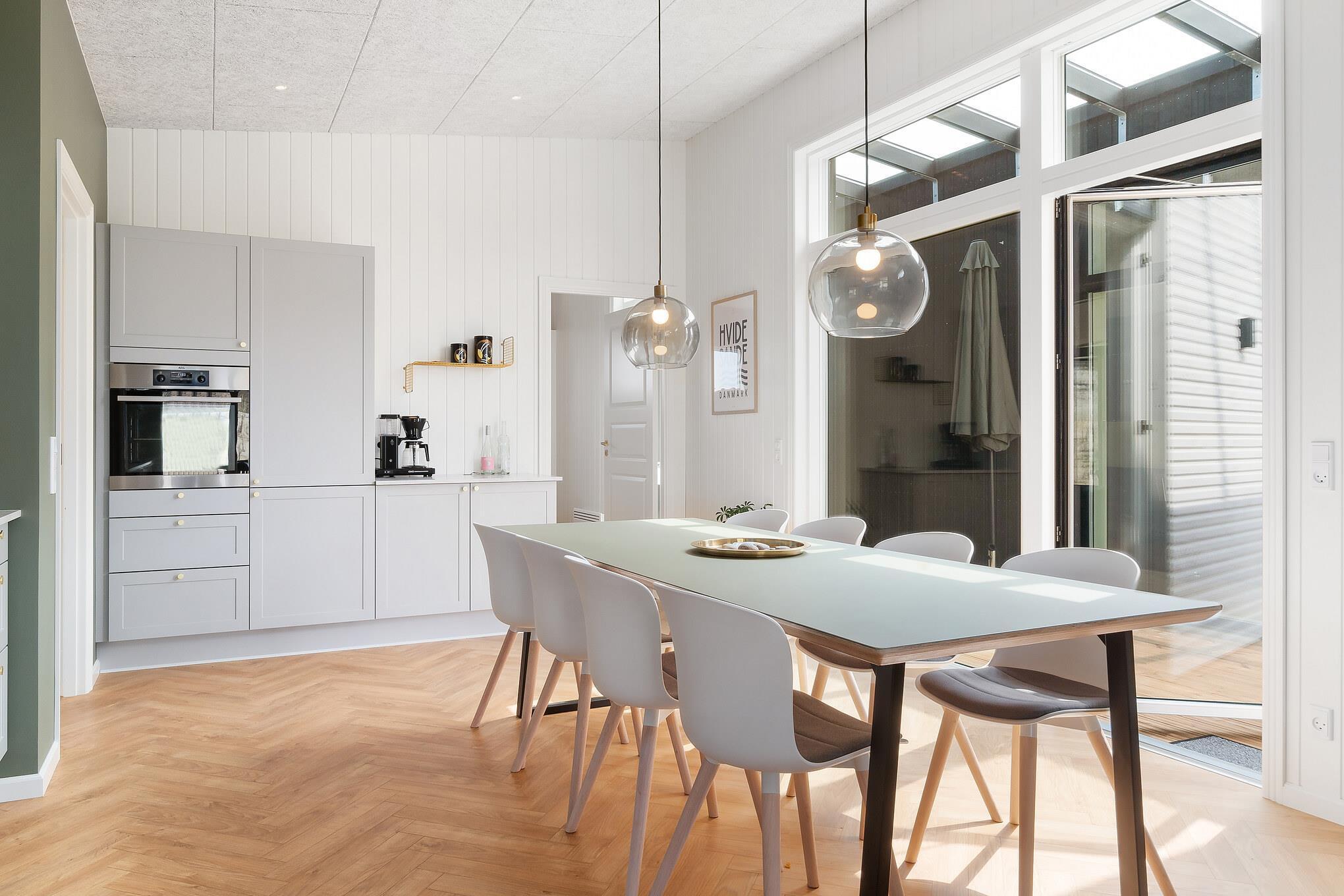 Hele feriehuset er moderne indrettet og fremstår lyst og indbydende. Her er tænkt på selv den mindste detalje, og det store vinduesparti ved spisebordet skabet et fantastisk lysindfald.