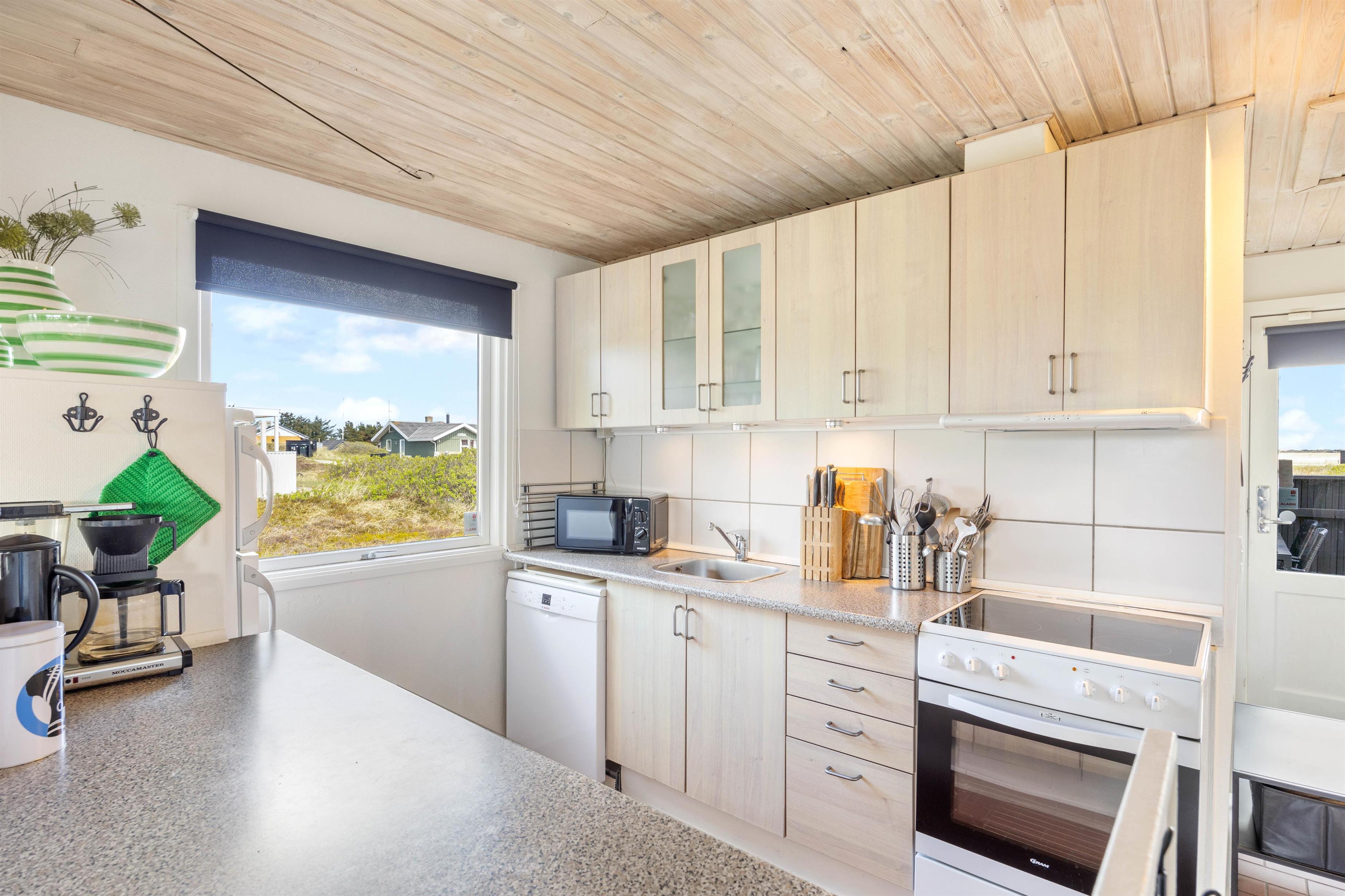 På Auroravej 18 i Bjerregård ligger dette fine sommerhus til 5 personer og 1 hund. Sommerhuset har en brændeovn, som spreder dejlig varme og hyggelig feriestemning. Fra feriehuset er der kun 700 meter til Vesterhavet og den smukke sandstrand, der indbyder til lange gåture med fødderne i vandkanten.