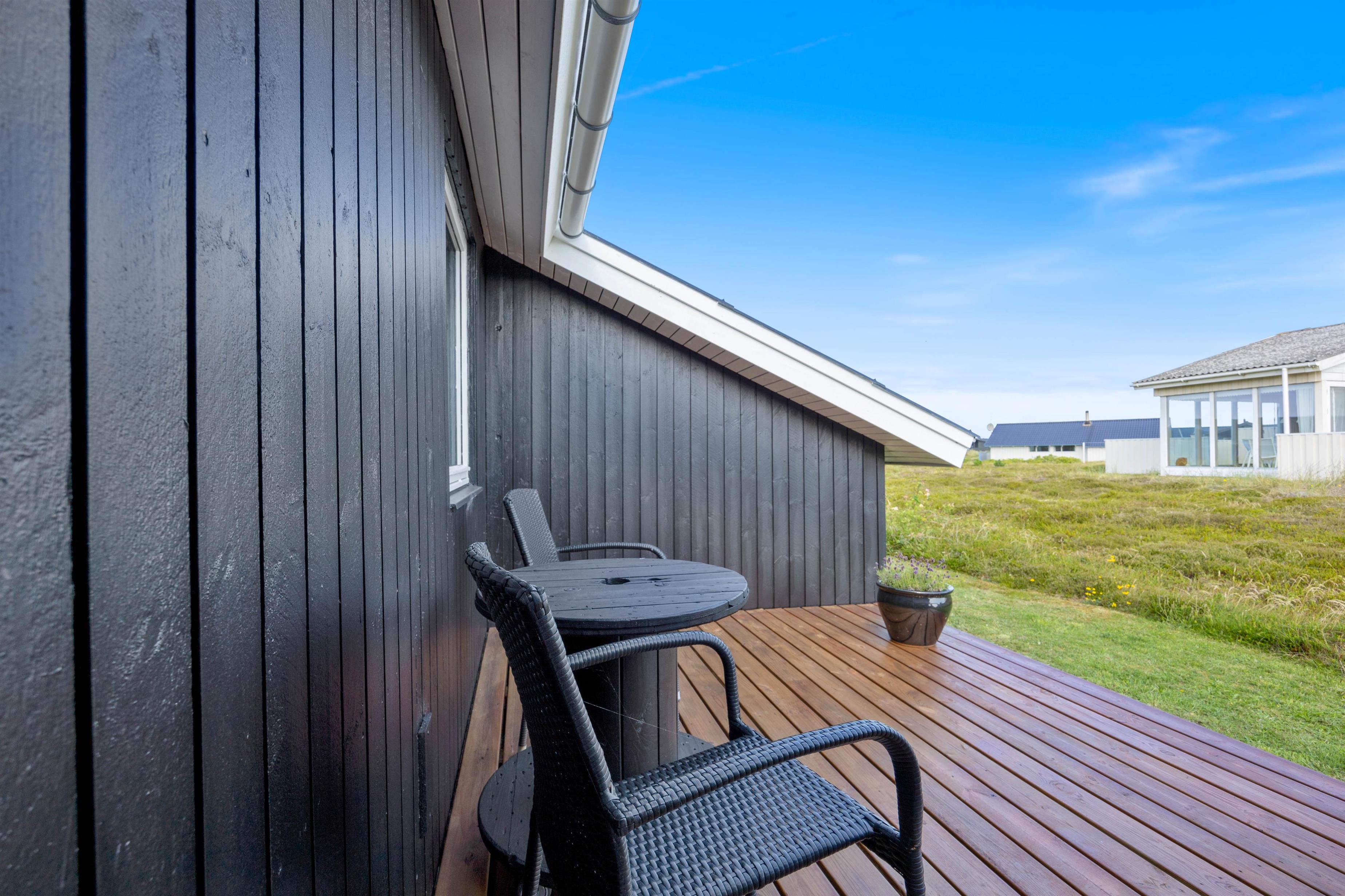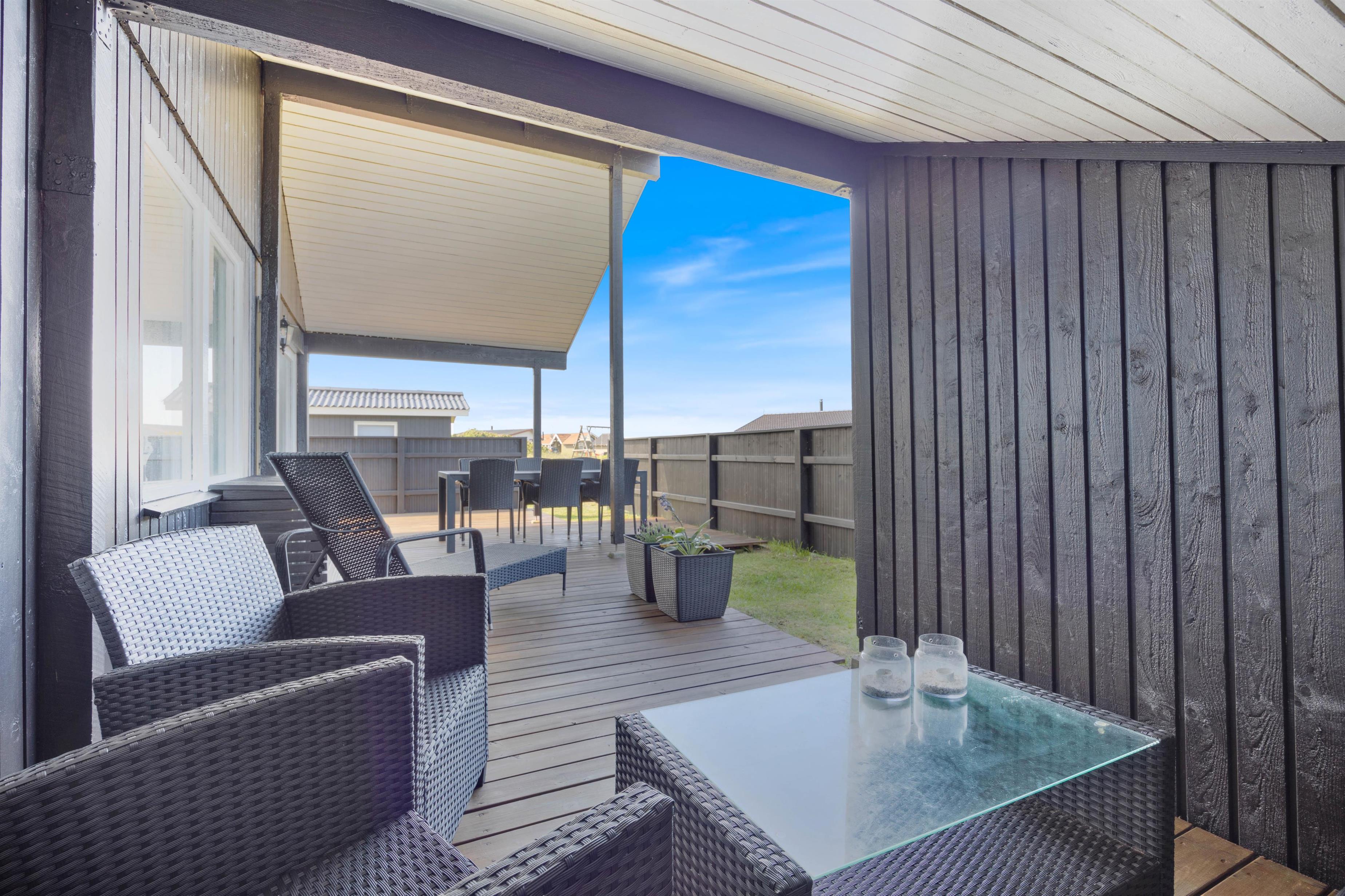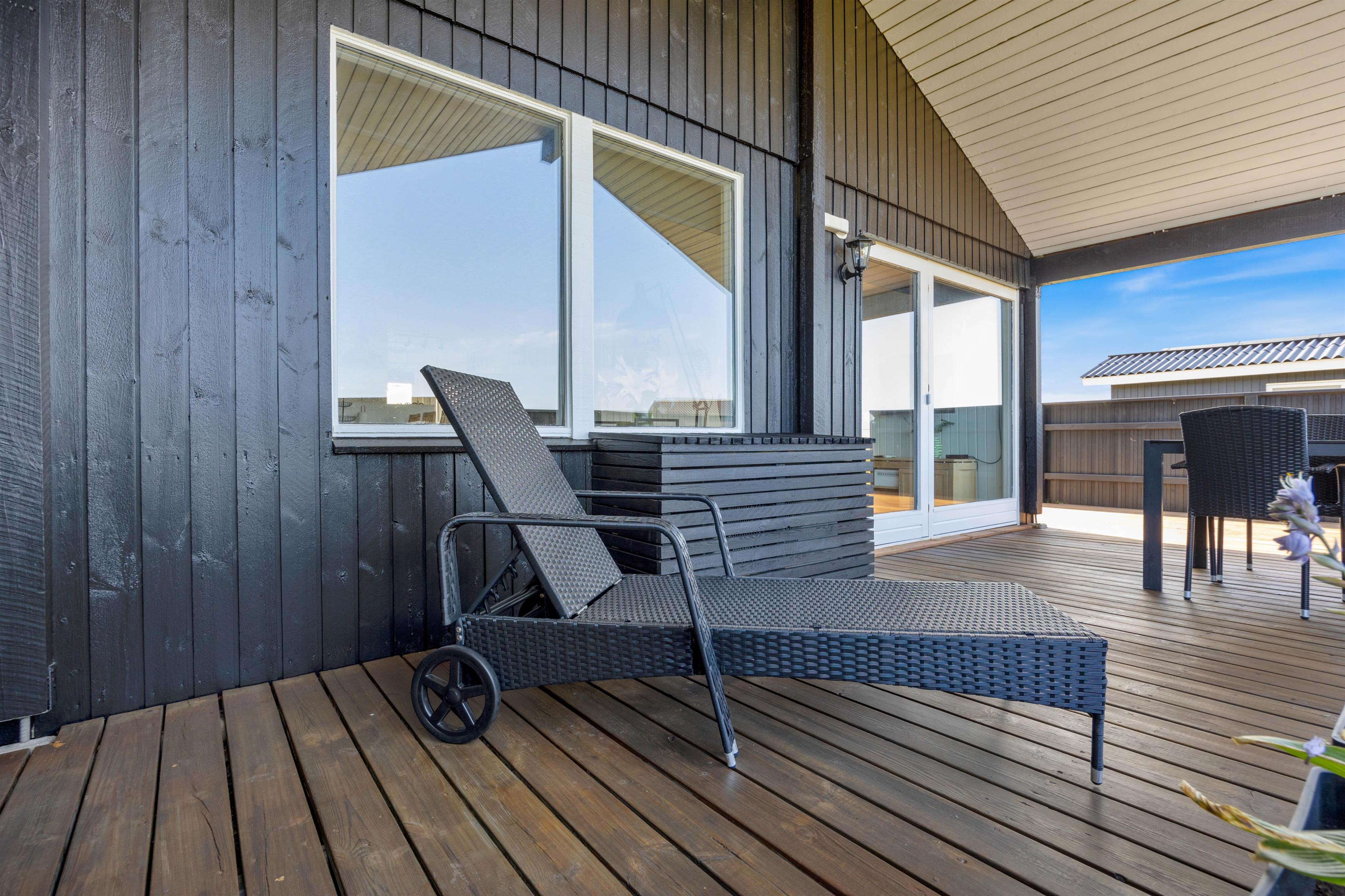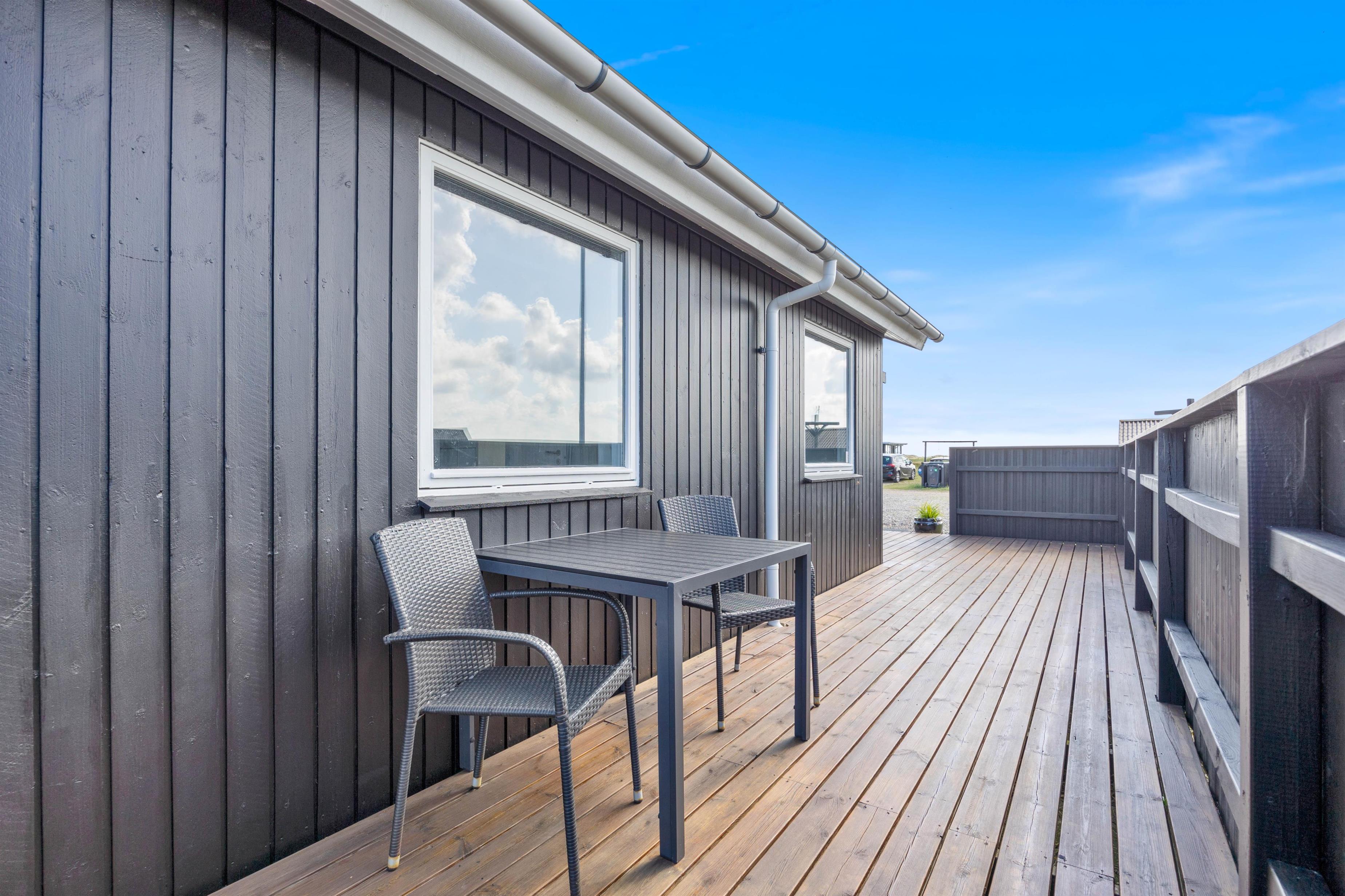 Der er flere gode siddepladser på terrassen, der strækker sig øst- til vestsiden af feriehuset.