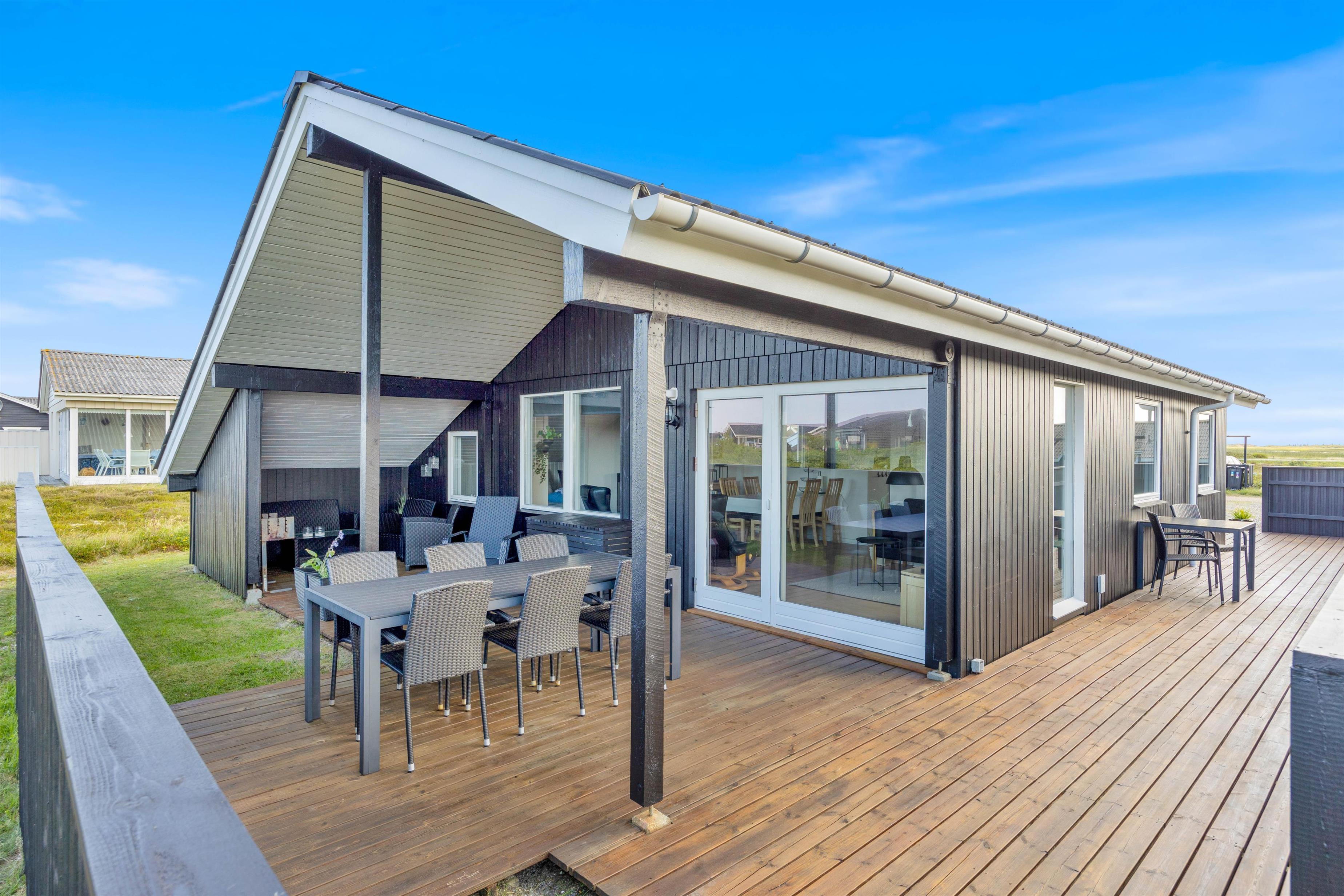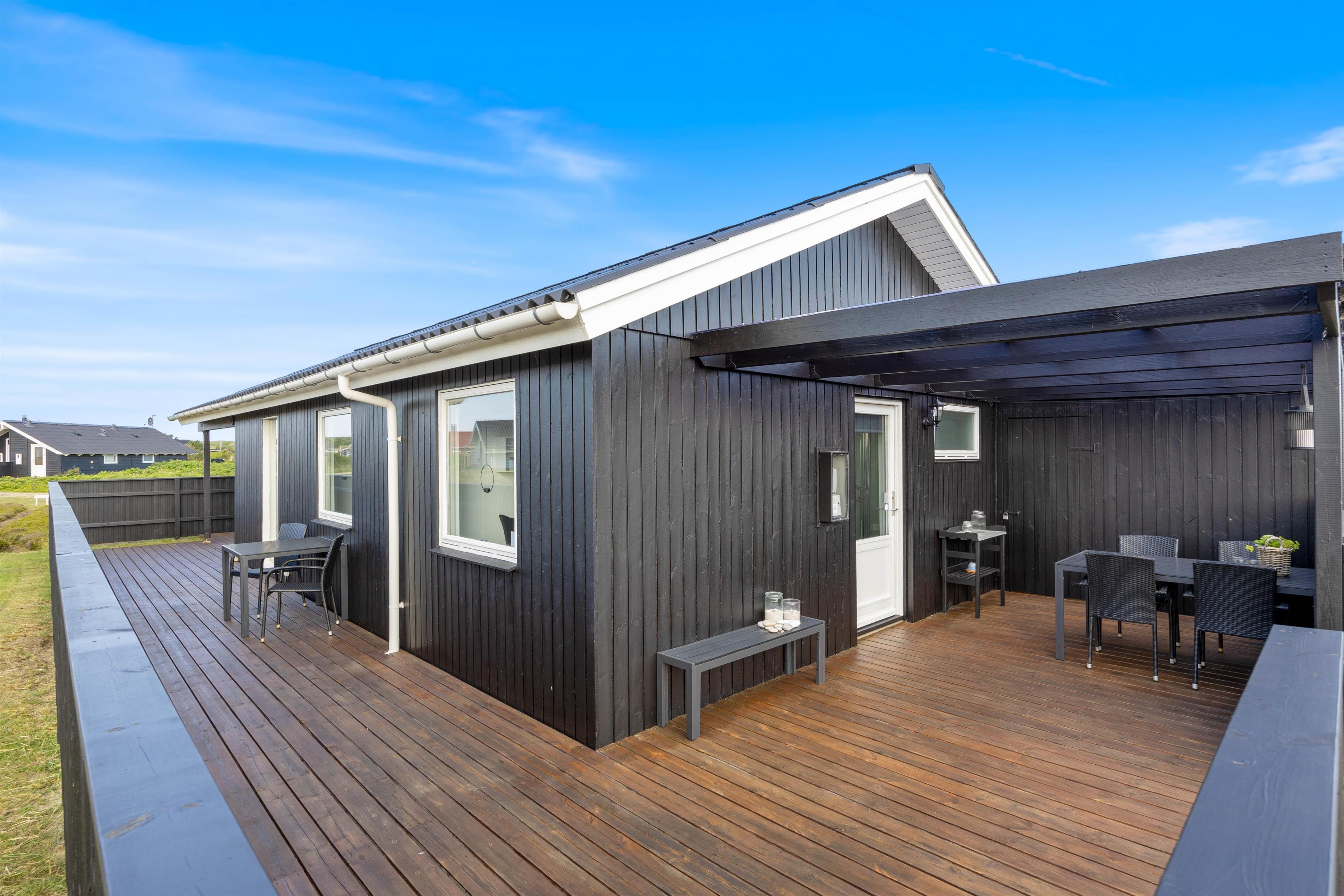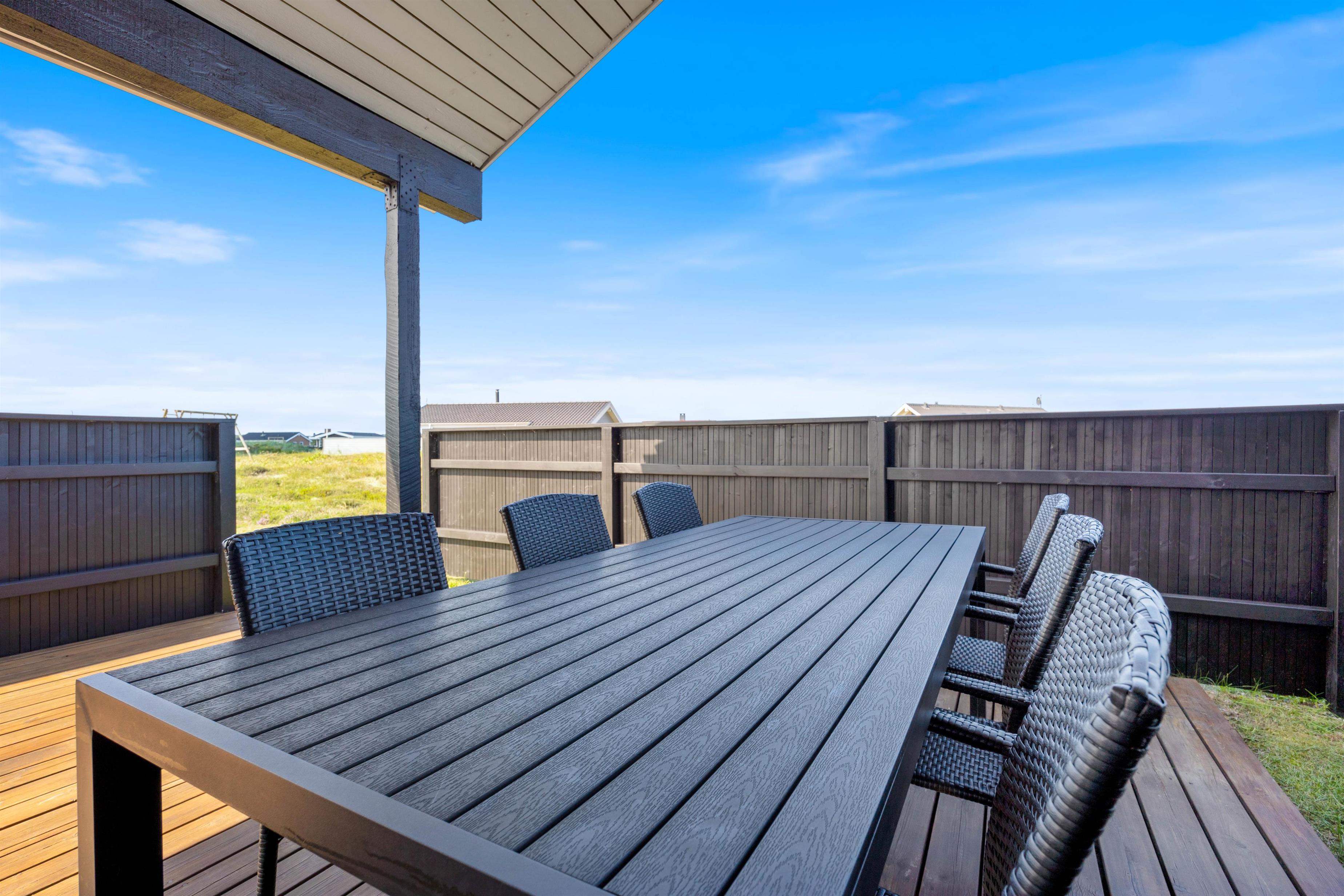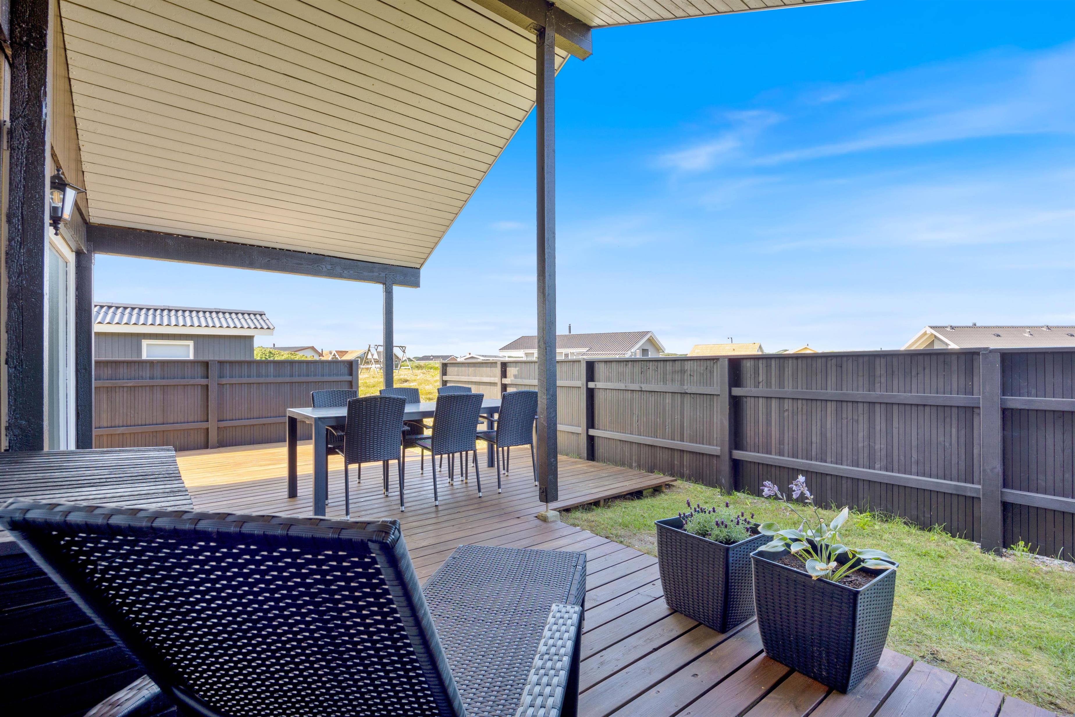 Der er flere gode siddepladser på terrassen, der strækker sig øst- til vestsiden af feriehuset.