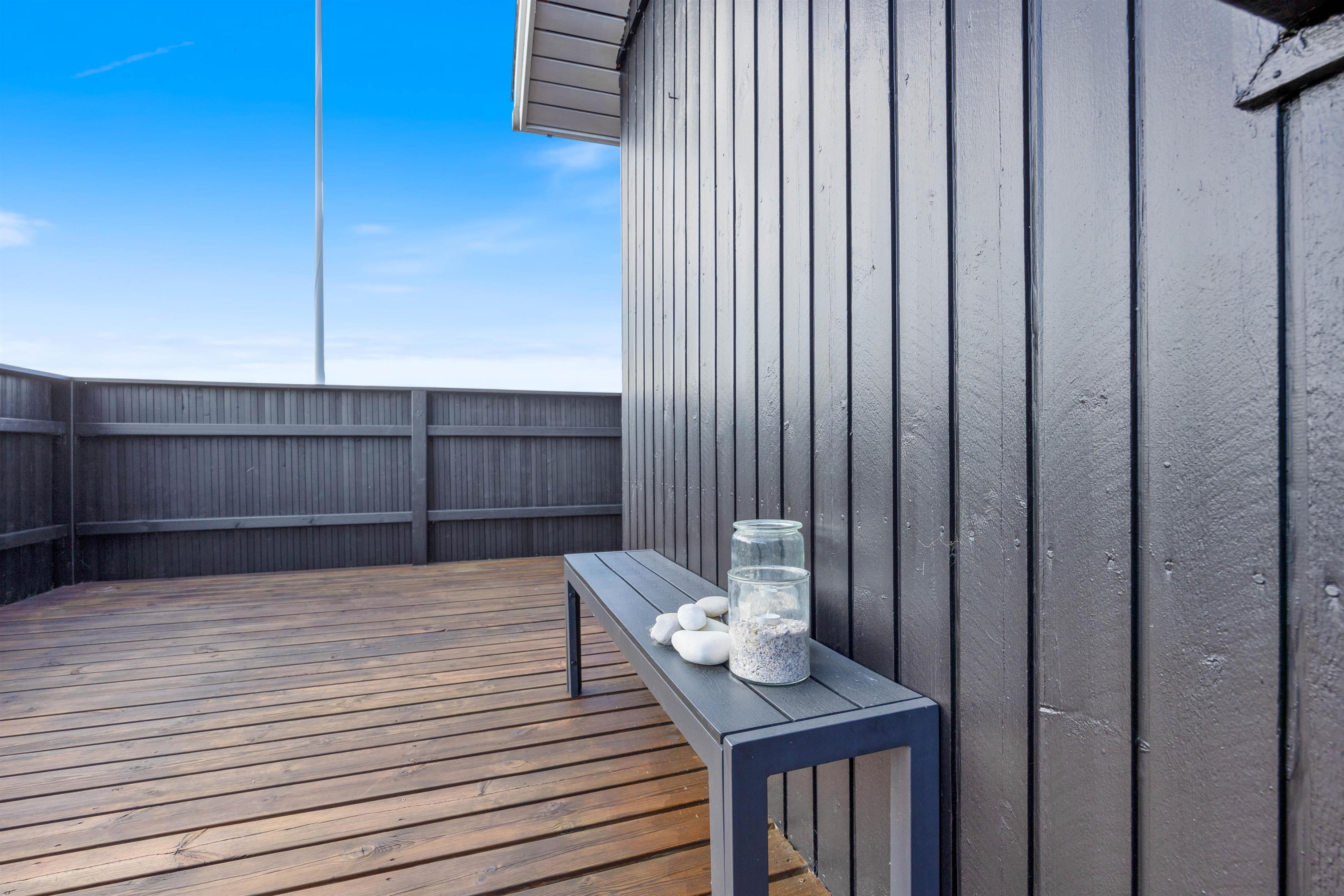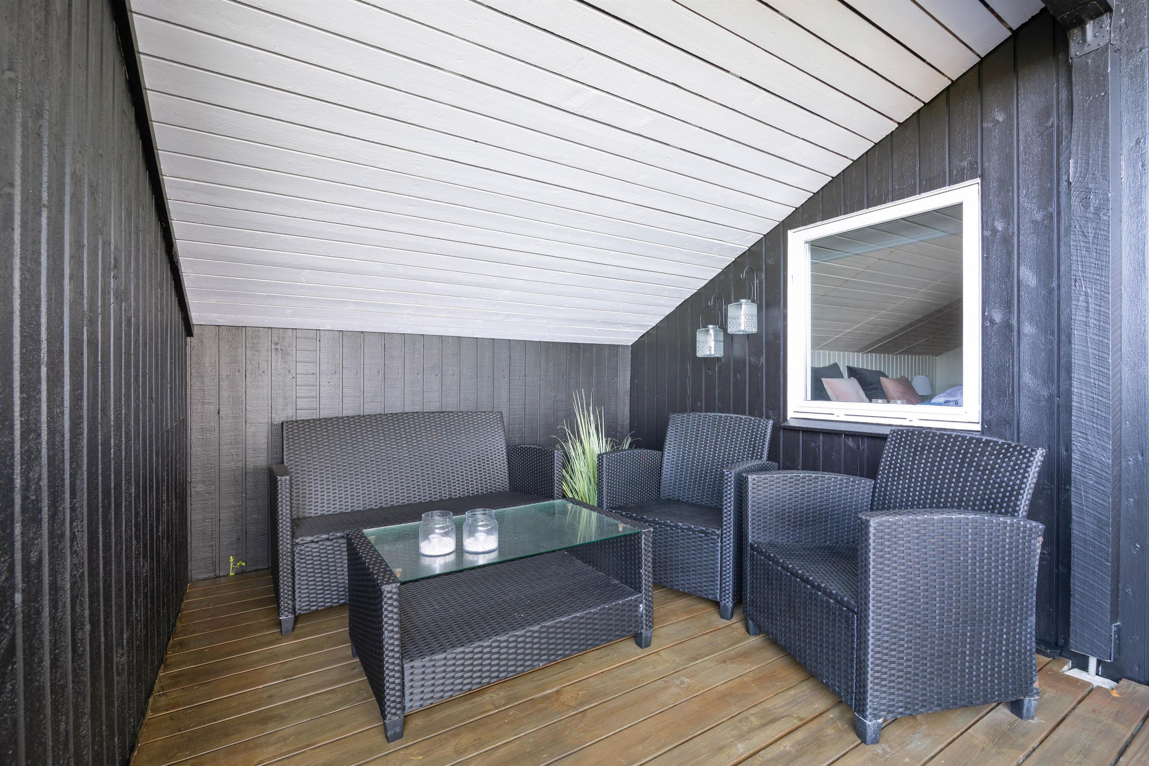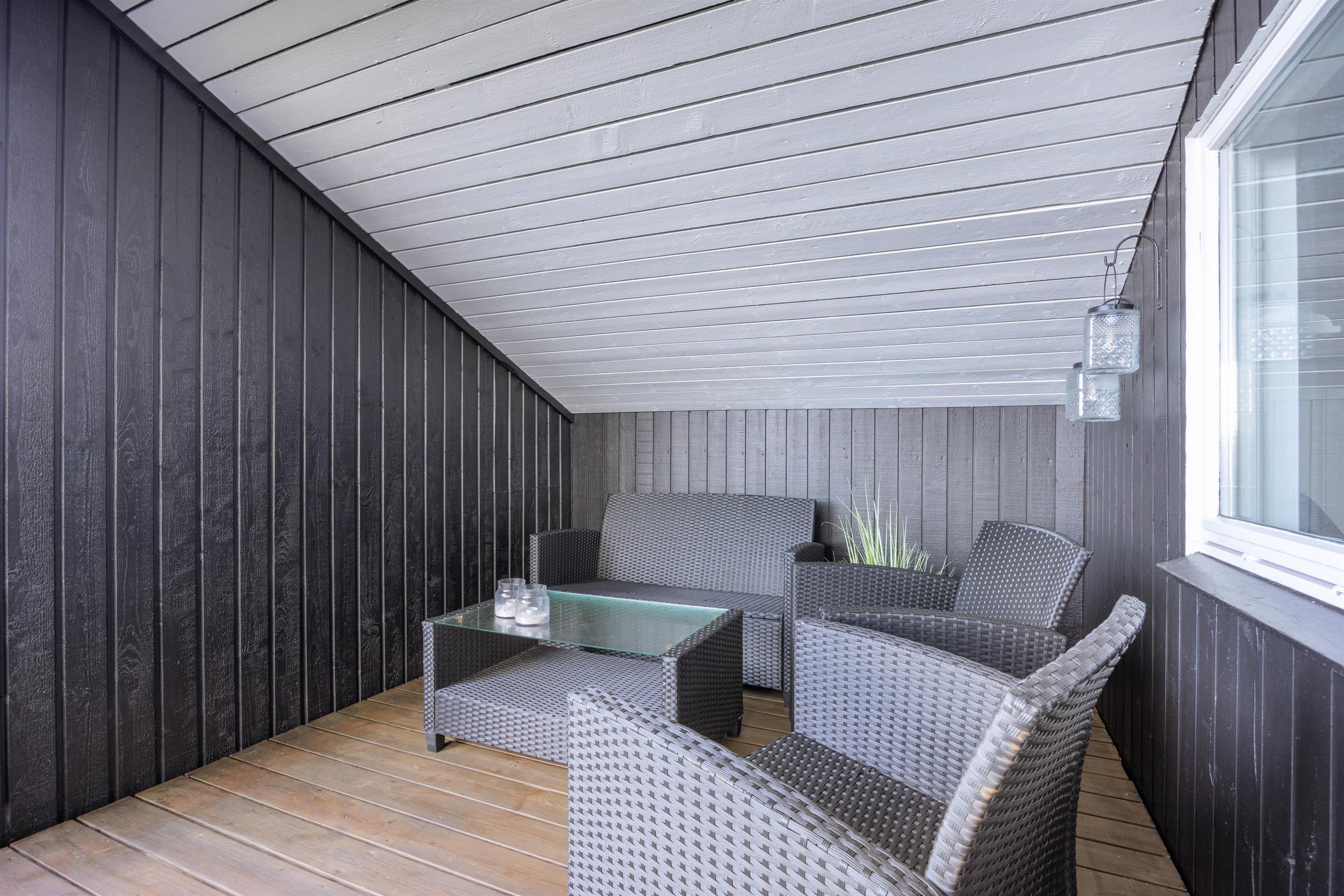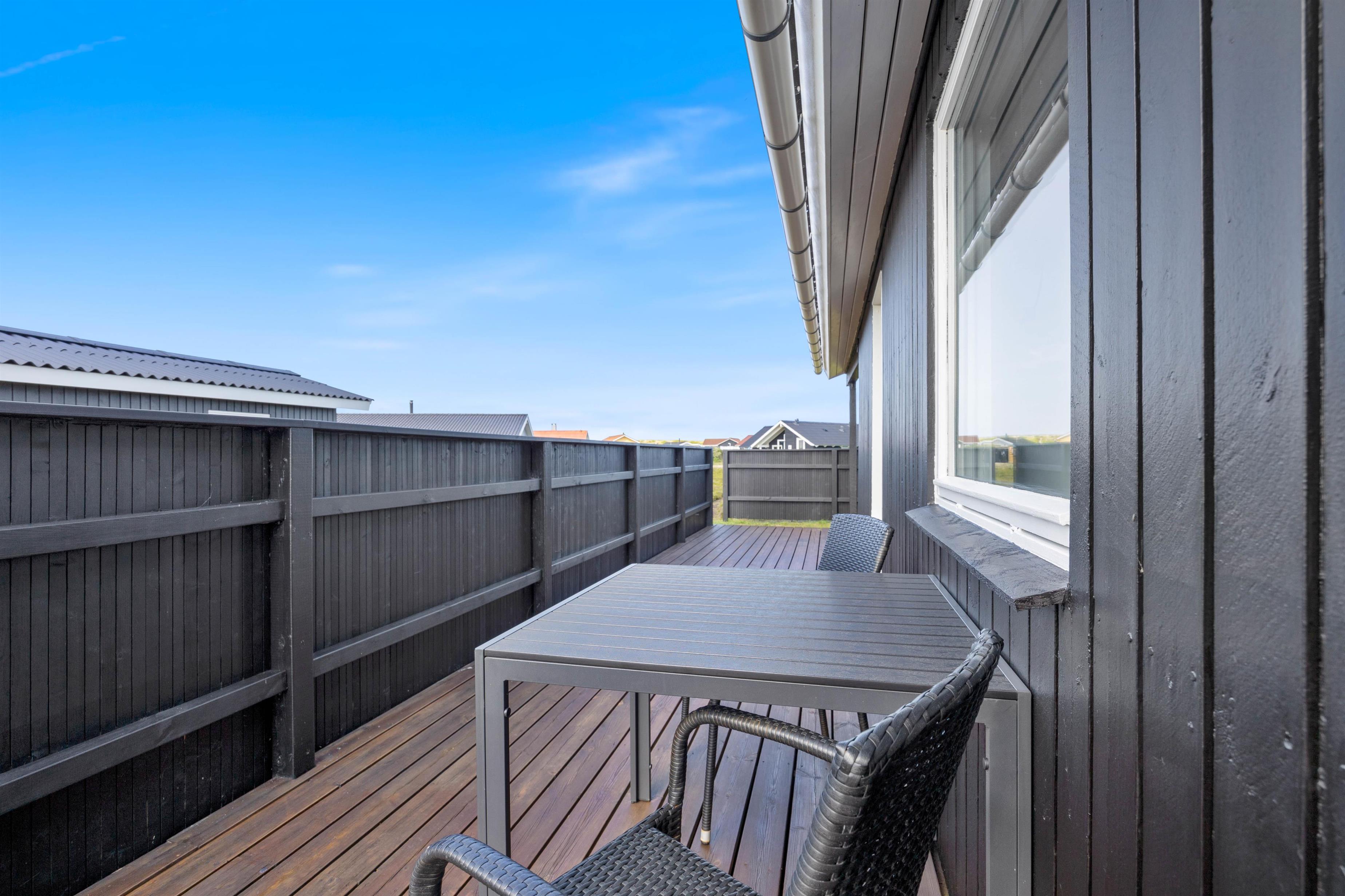 Der er flere gode siddepladser på terrassen, der strækker sig øst- til vestsiden af feriehuset.