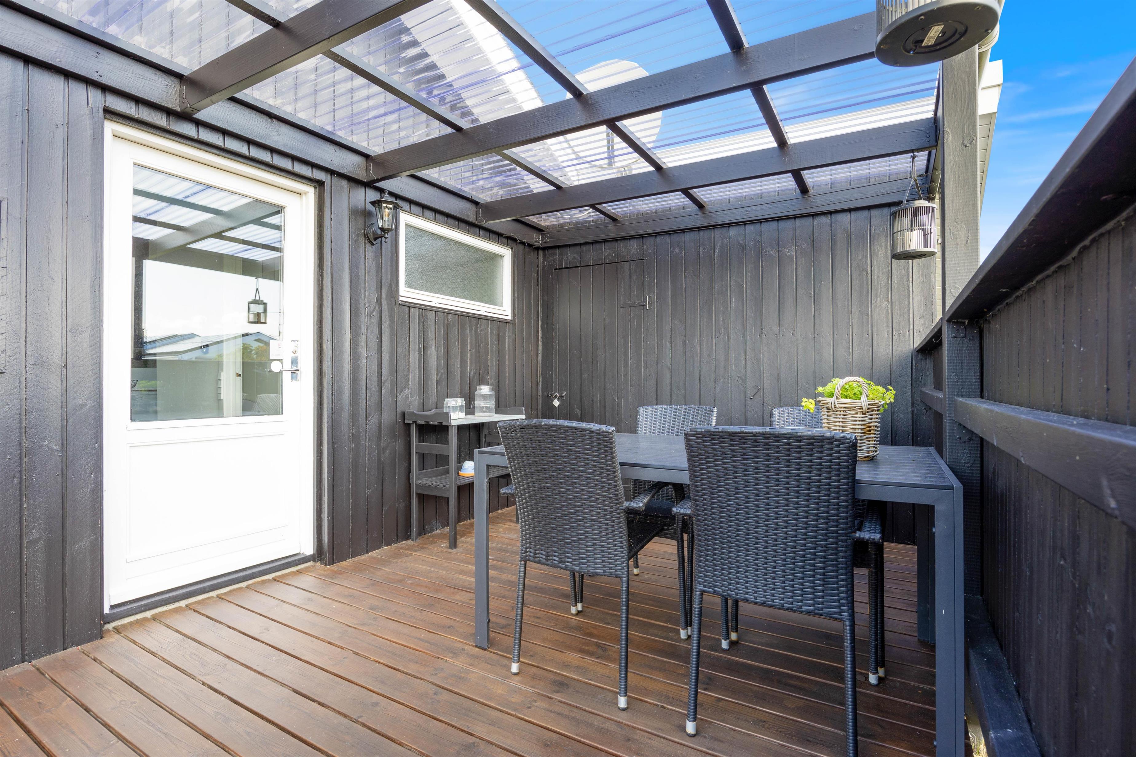 Sommerhuset har en god, stor terrasse, der er delvist overdækket og afskærmet. Her kan I nyde solen hele dagen og slutte af med en lækker grillmiddag med saftige bøffer fra grillen.
