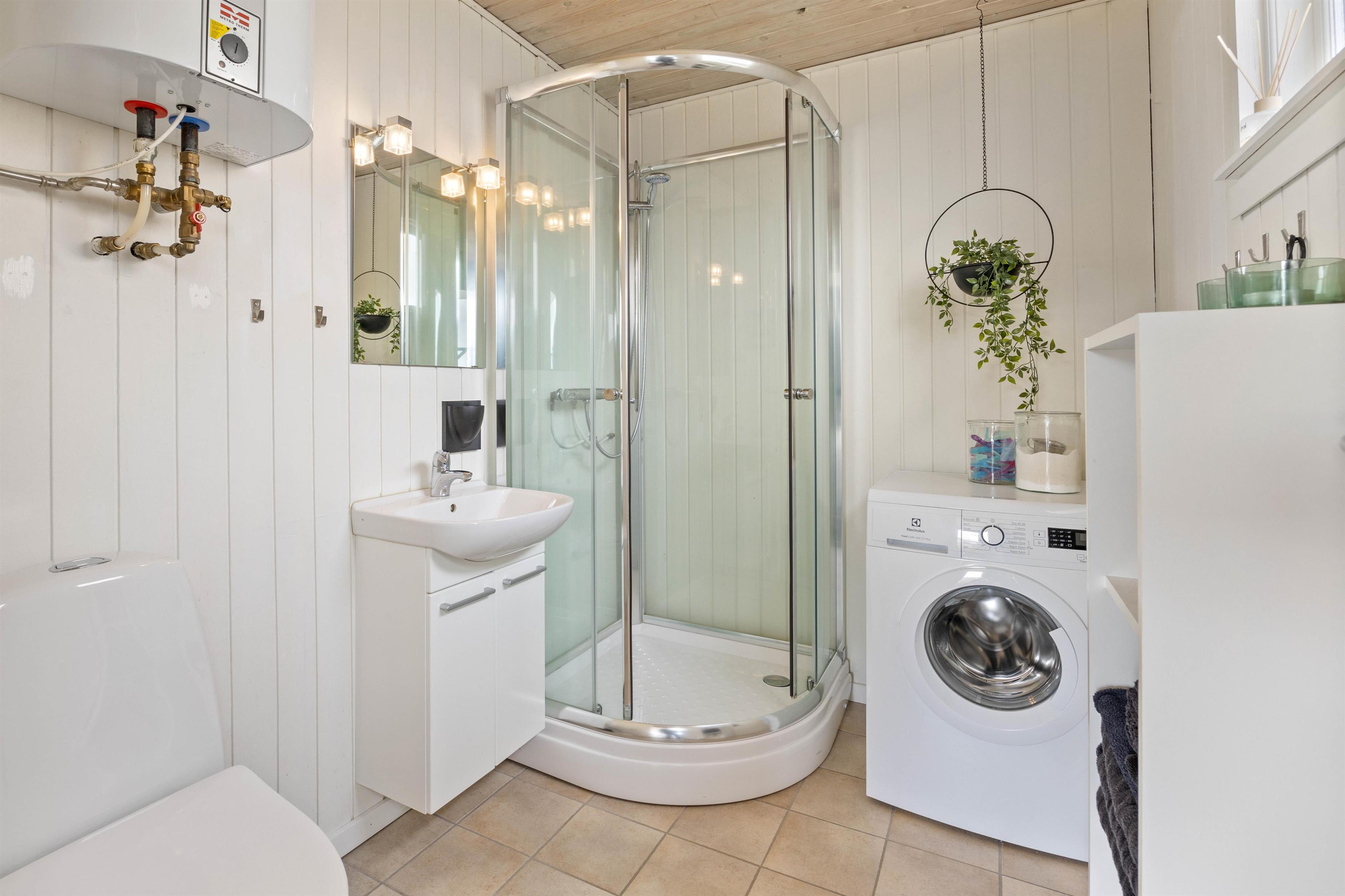 Sommerhuset har et flot badeværelse med bruseniche, gulvvarme og vaskemaskine.