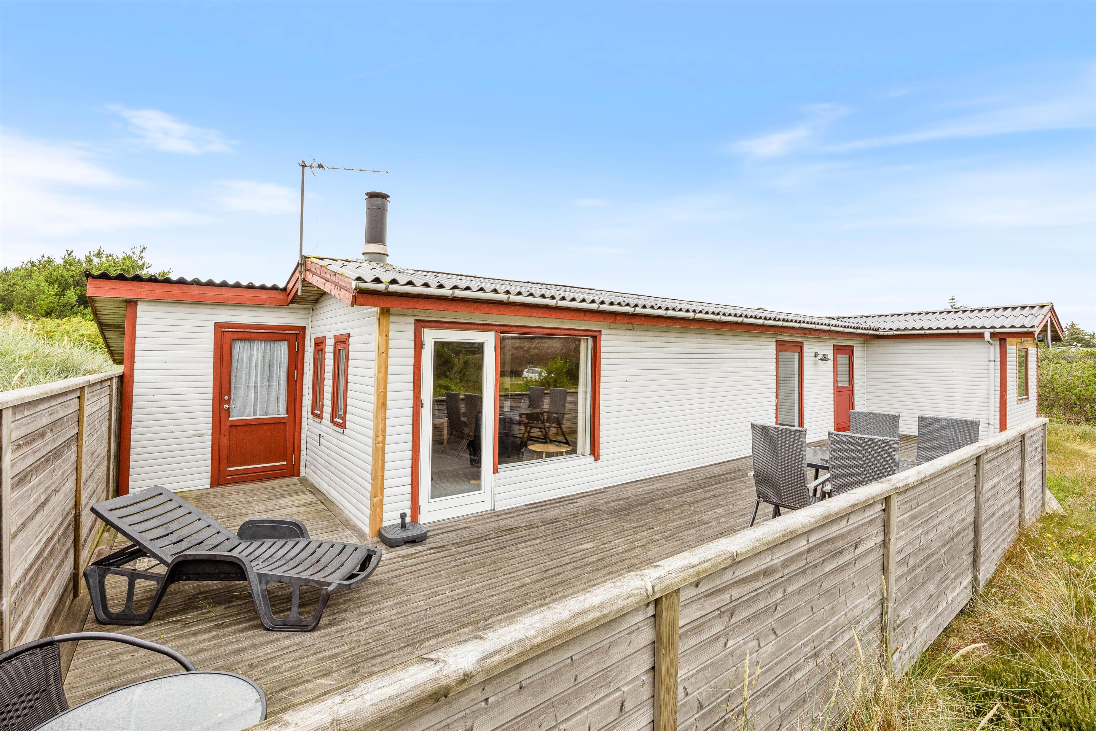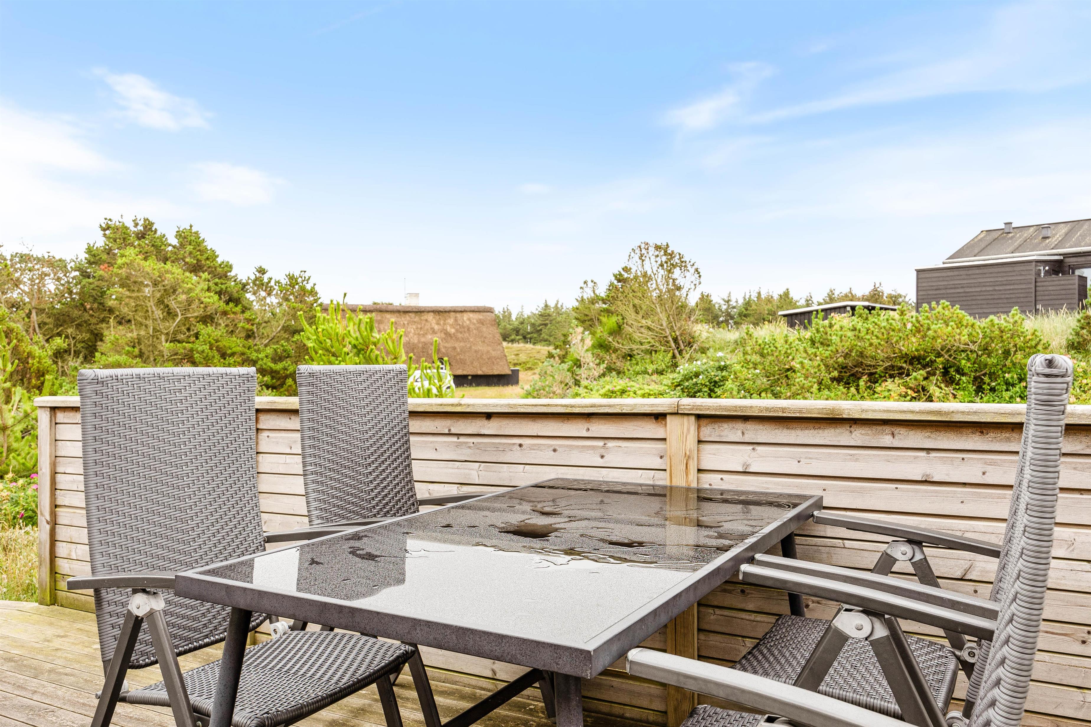Den 1202 m2 store naturgrund giver gode muligheder for udendørs afslapning. Sommerhusets grill indbyder til hyggelige grillaftener, og havemøblerne samt liggestolene står klar til hyggelige stunder på de lune sommerdage. Den delvist afskærmede træterrasse, der vender mod sydvest, giver ekstra beskyttelse og privatliv – ideelt til at nyde morgenkaffen eller et glas vin om aftenen.