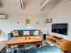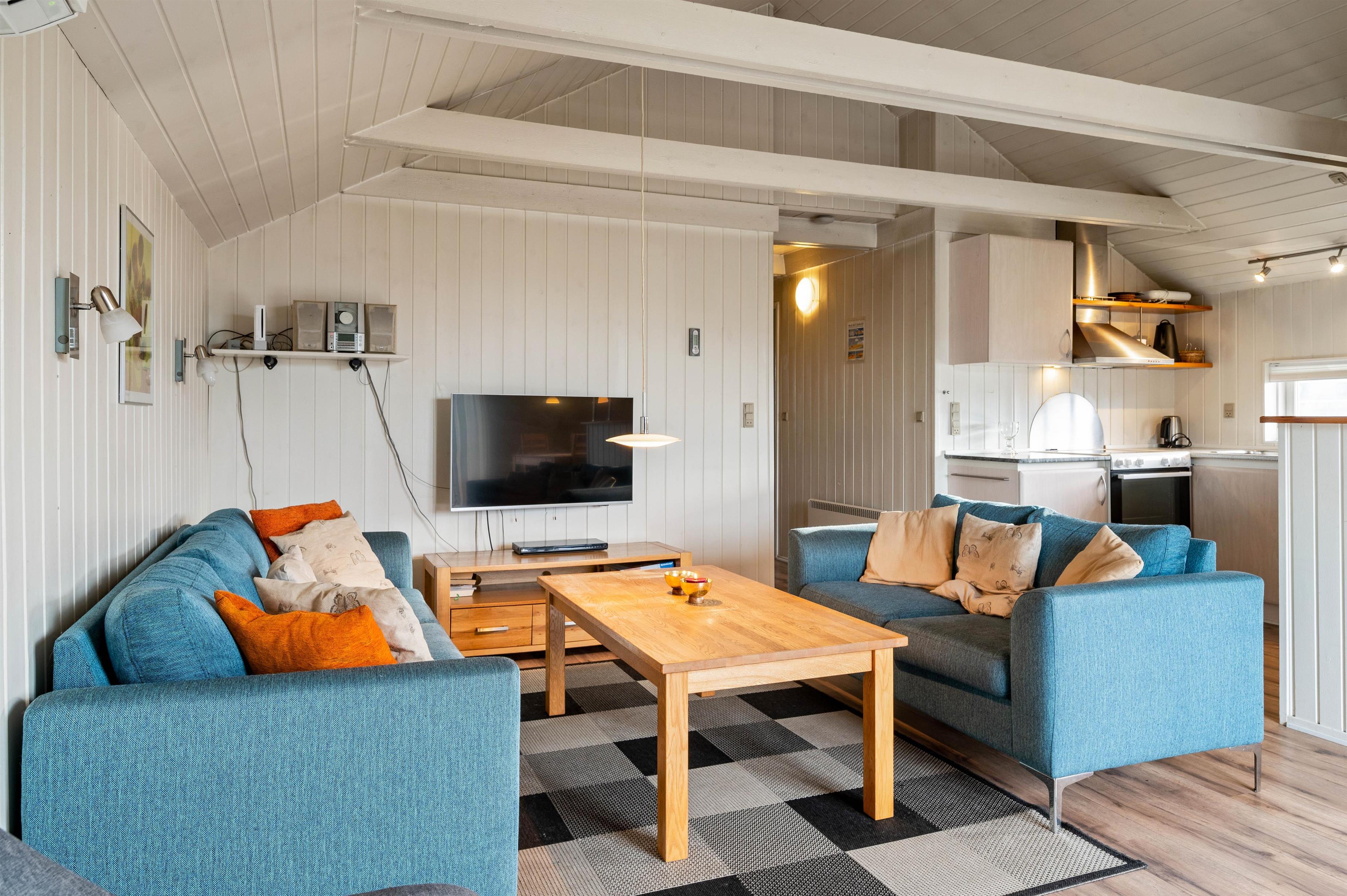 Fra husets lyse og velfungerende køkken er der direkte forbindelse til spiseafdeling og den virkelig hyggelige opholdsstue med komfortable møbler, en dejlig brændeovn og den energibesparende varmepumpe. Her er et rigtig godt lysindfald og loft til kip med fritlagte spær, der giver den helt rette rustikke feriehusfornemmelse. Her kan I samles hele familien om spil og filmhygge. imens brændeovnen knitrer i baggrunden - Det er da ægte sommerhusferie!