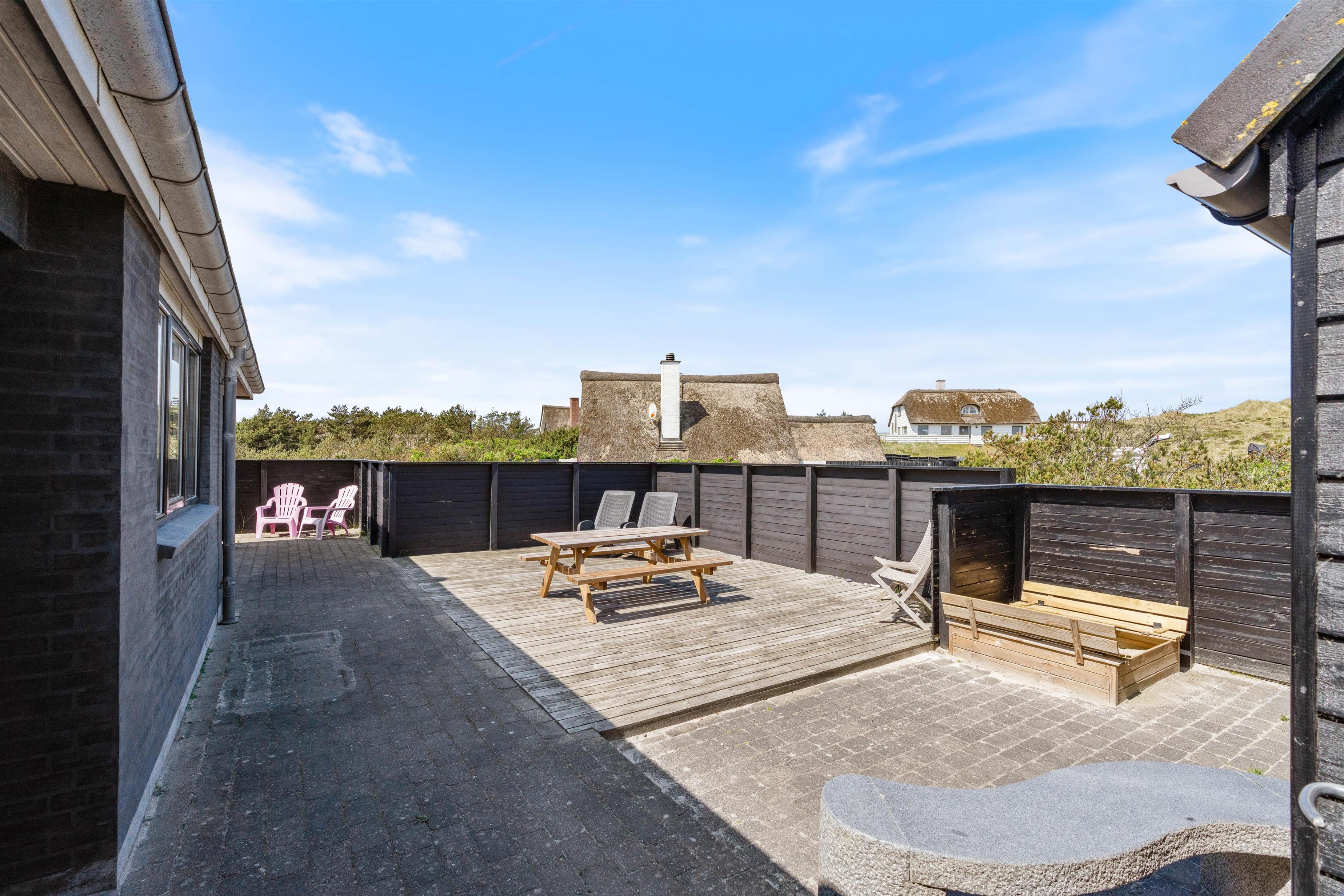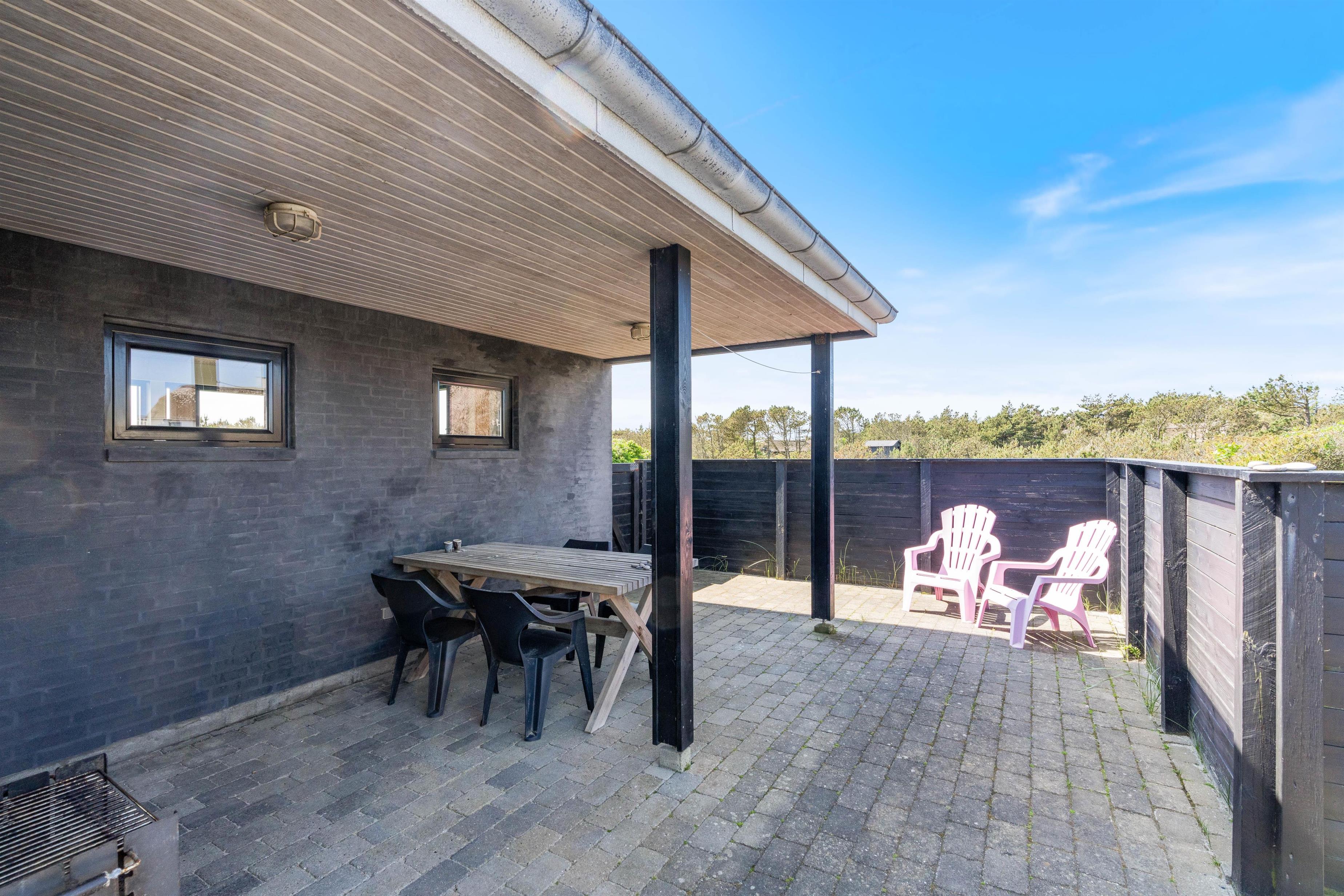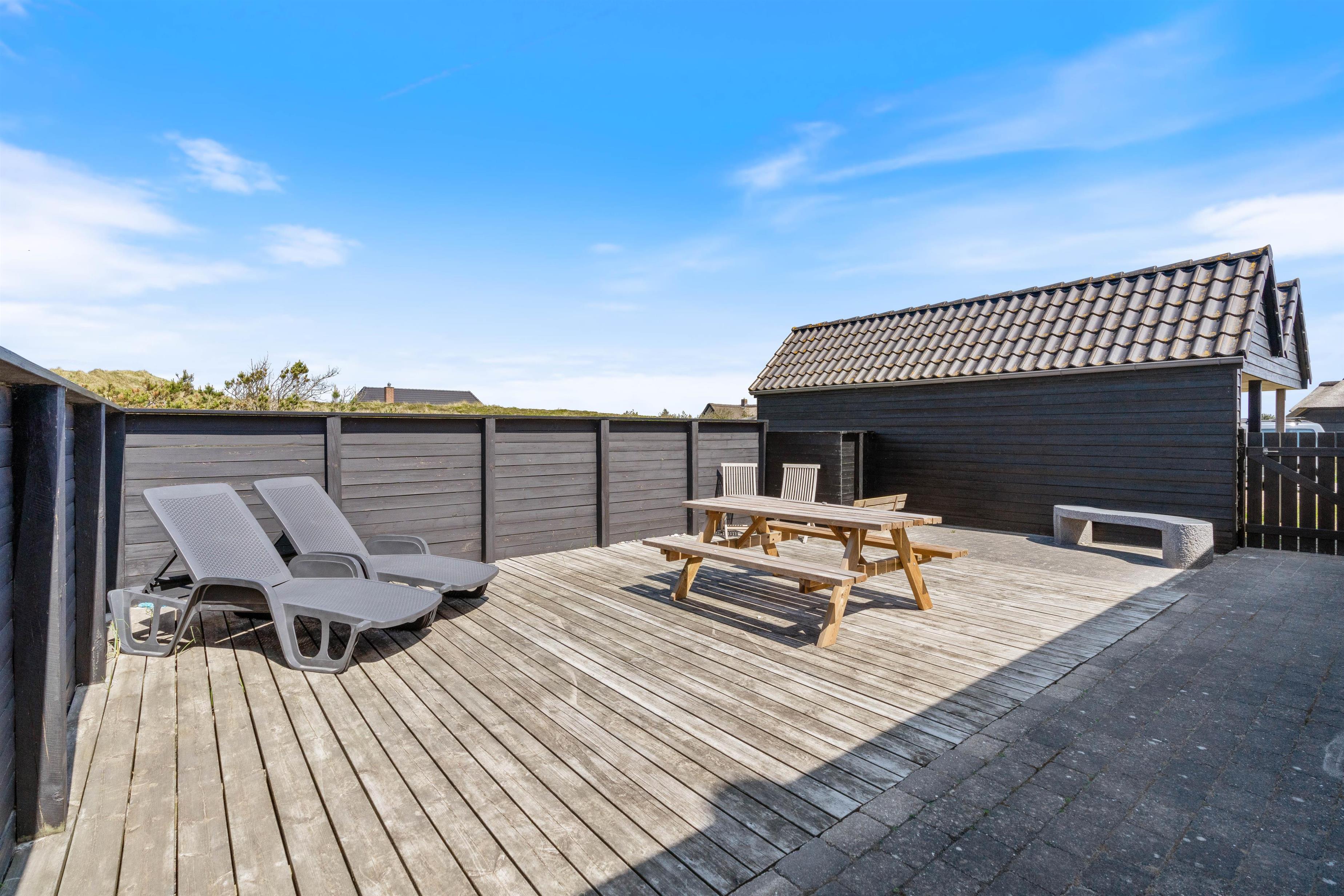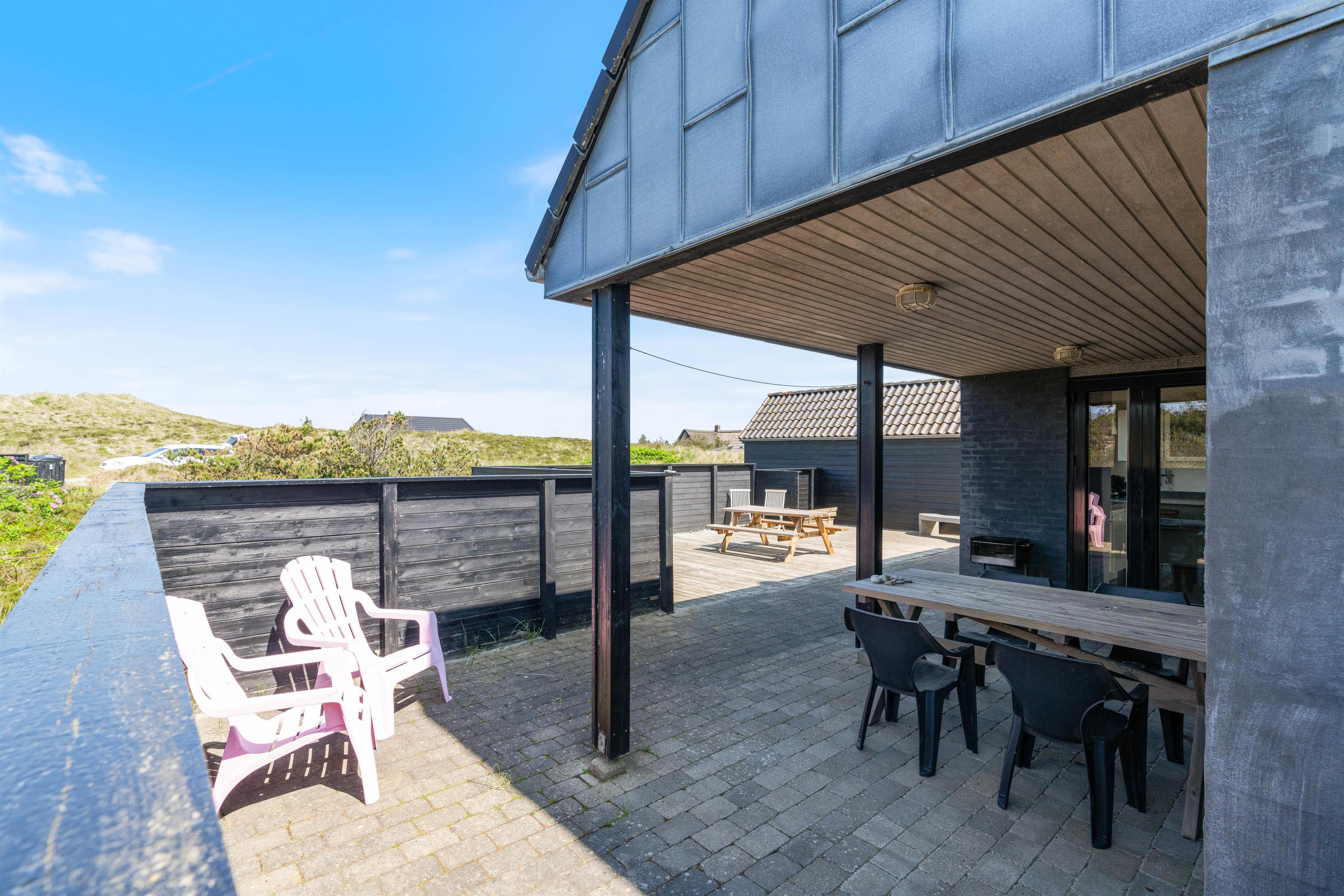 Der er flere gode terrasser til huset samt en carport til bilen. En lukket terrasse mod syd, ideel til små børn og til en hund. Mod nordvest er der en skøn delvist overdækket terrasse, som også lukket. Alt i alt masser af skønne lækroge rundt omkring. Huset ligger i skønne omgivelser på den lyngklædte naturgrund, hvor der også forefindes et gyngestativ til de yngste feriegæster. Der er kun 400 m til Vesterhavet og store fredede arealer ligger blot få hundrede meter fra huset både mod syd og nord og giver mulighed for gode traveture i den fantastiske natur.