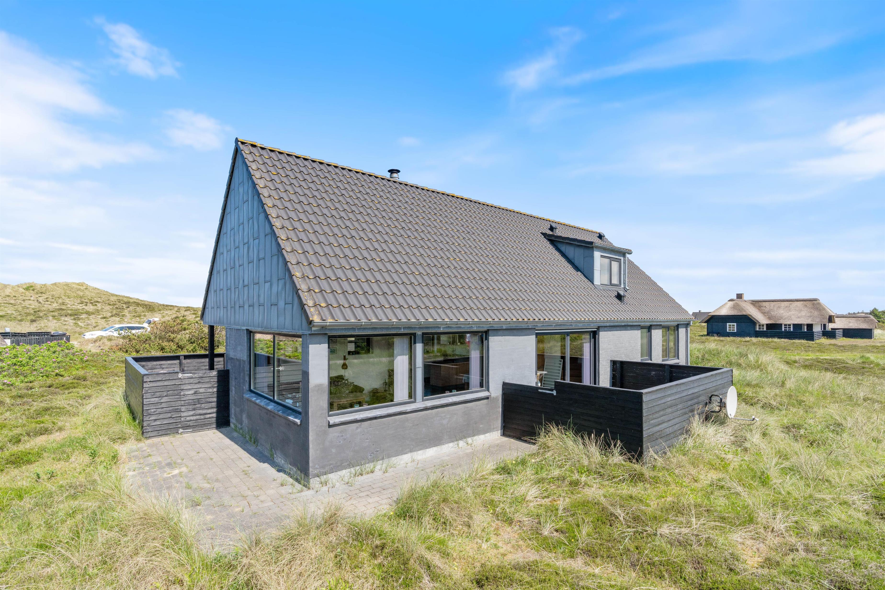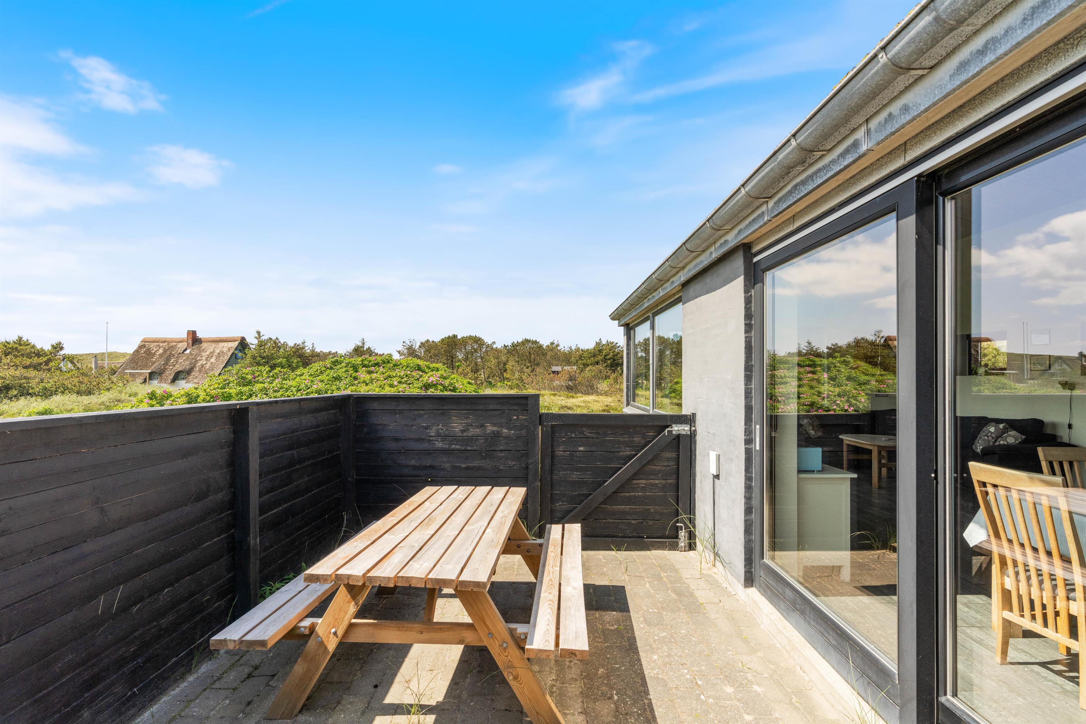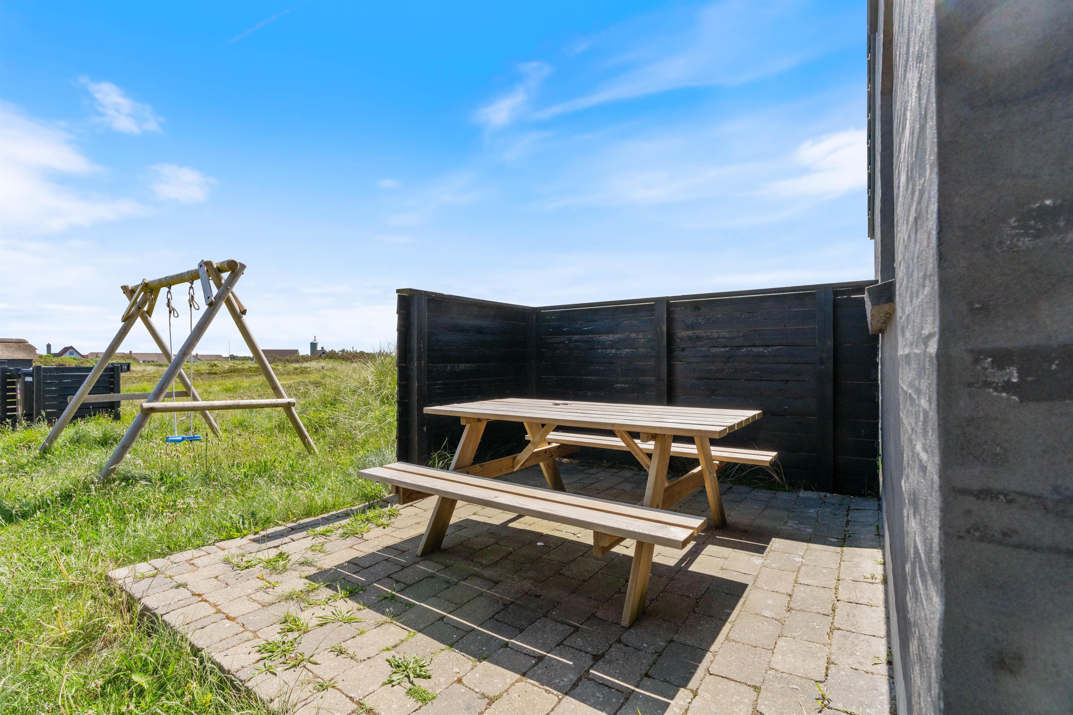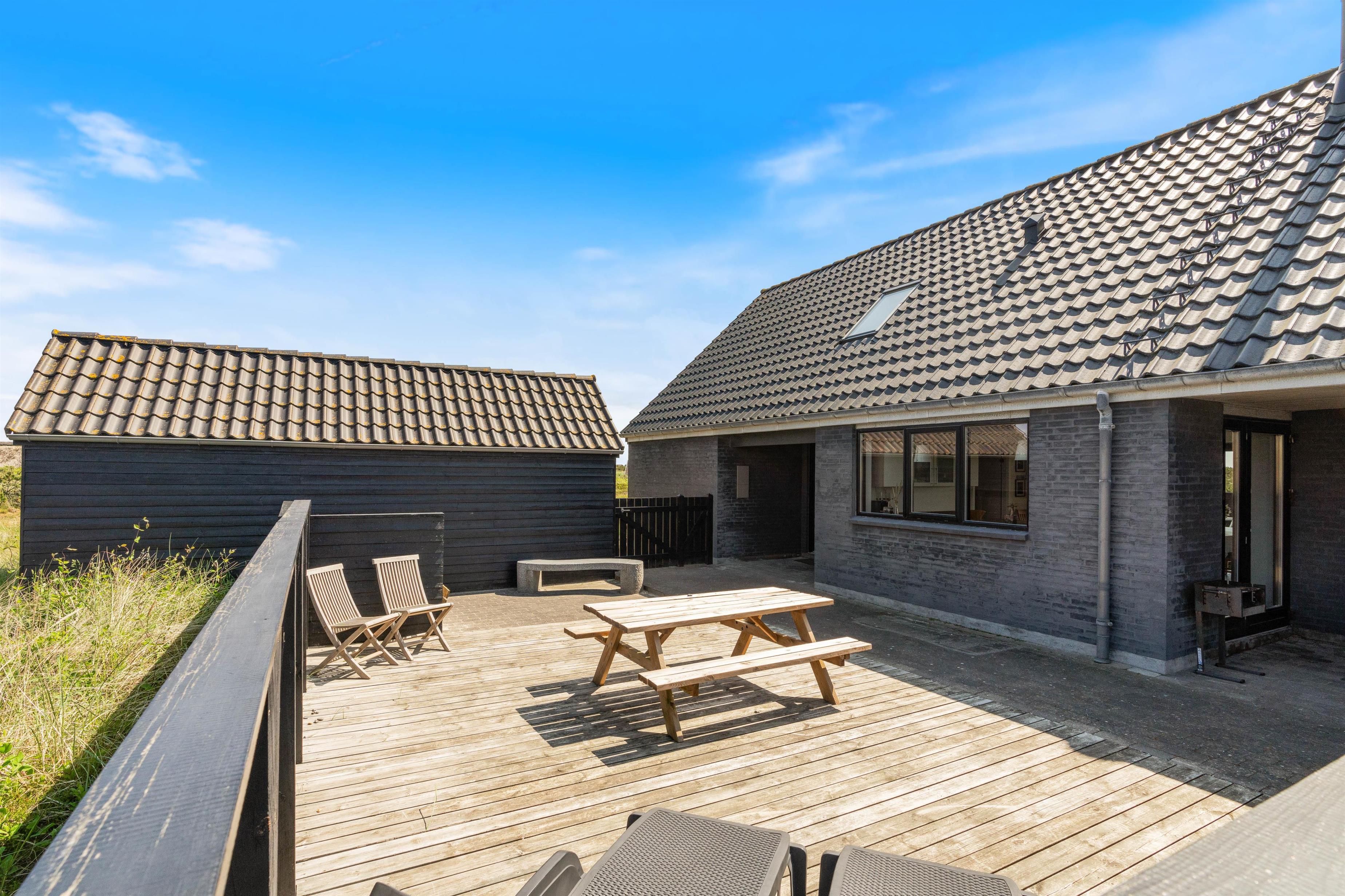 Der er flere gode terrasser til huset samt en carport til bilen. En lukket terrasse mod syd, ideel til små børn og til en hund. Mod nordvest er der en skøn delvist overdækket terrasse, som også lukket. Alt i alt masser af skønne lækroge rundt omkring. Huset ligger i skønne omgivelser på den lyngklædte naturgrund, hvor der også forefindes et gyngestativ til de yngste feriegæster. Der er kun 400 m til Vesterhavet og store fredede arealer ligger blot få hundrede meter fra huset både mod syd og nord og giver mulighed for gode traveture i den fantastiske natur.